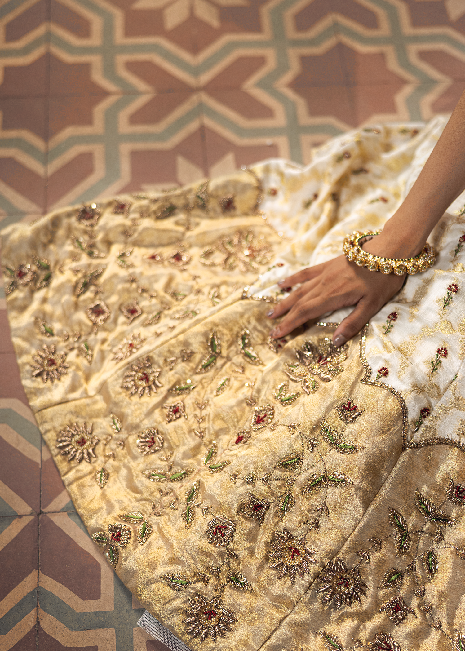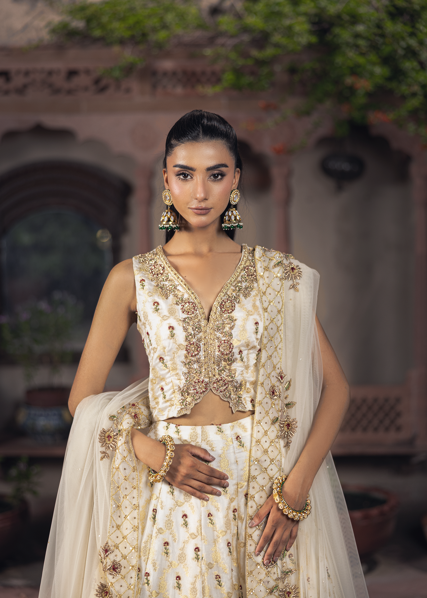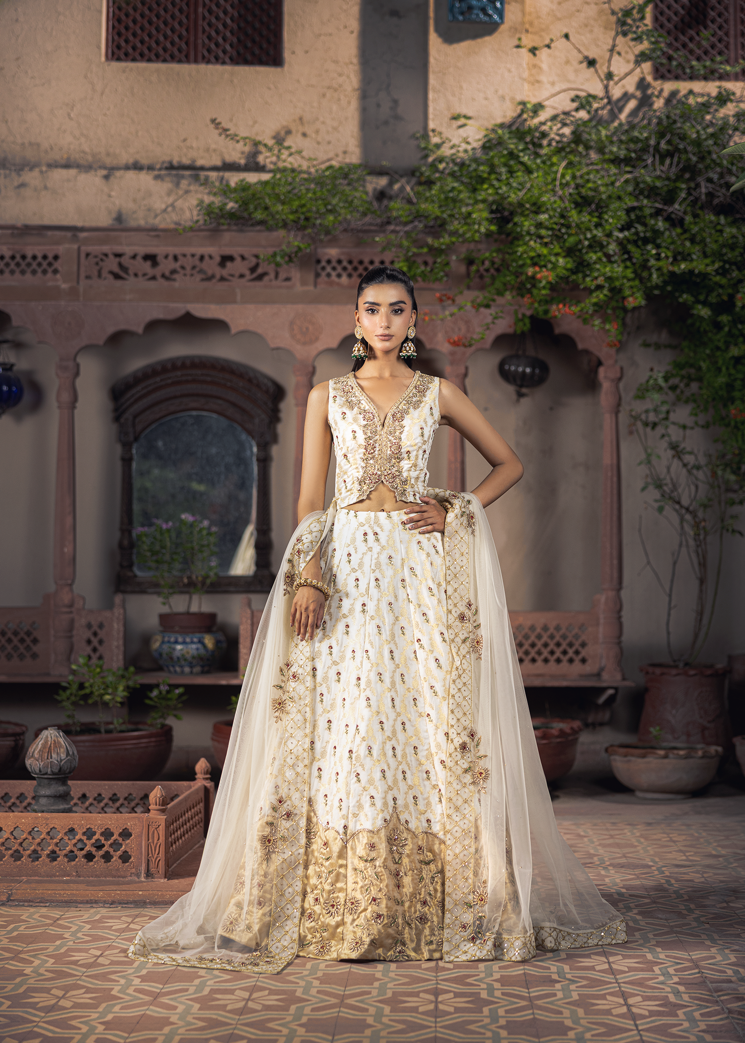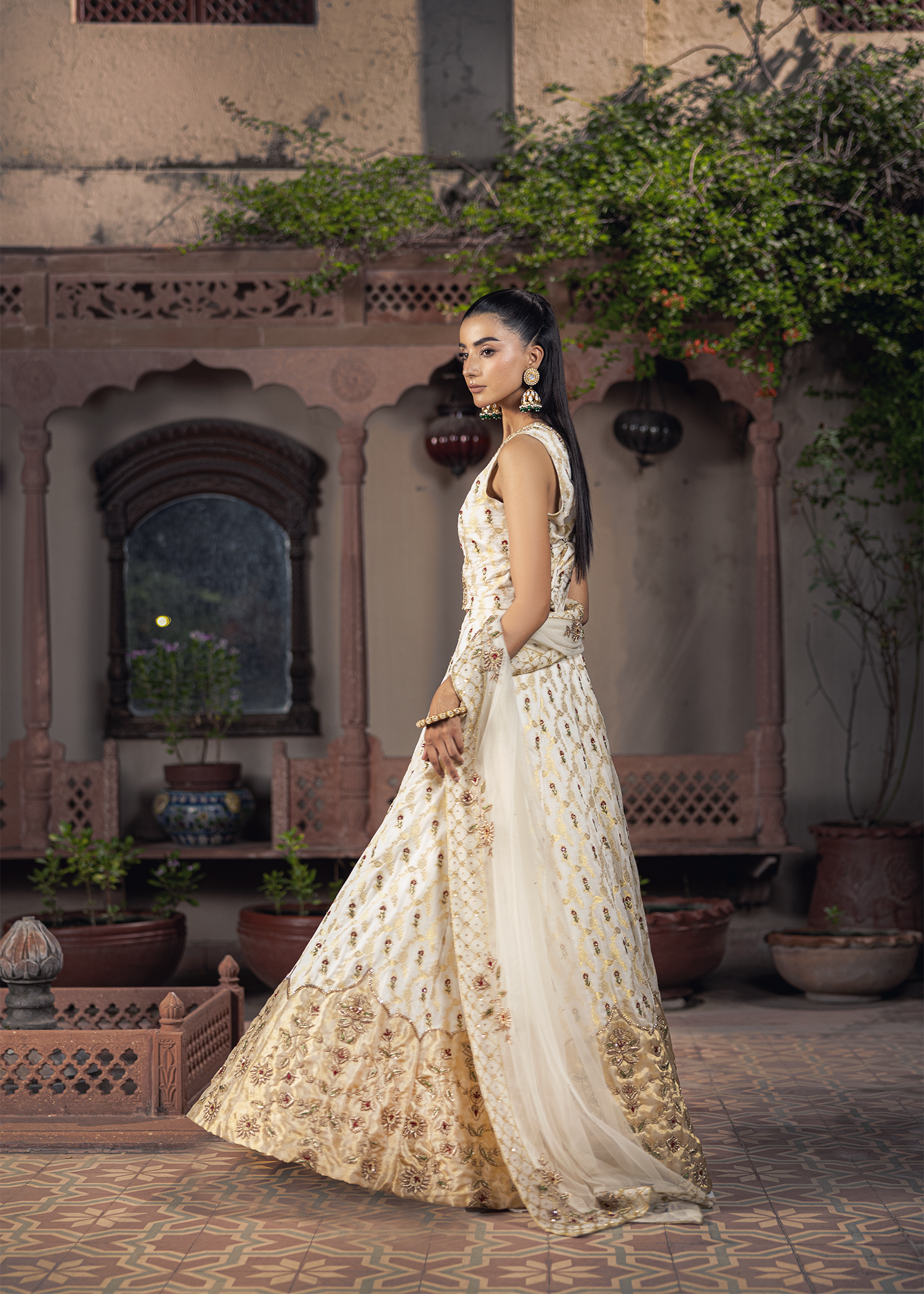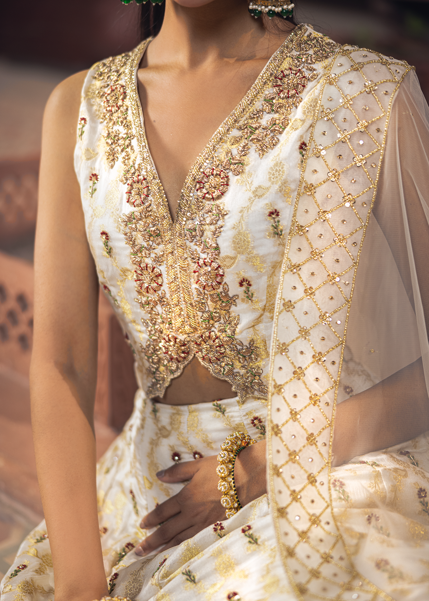 A graceful dreamy white-gold jamawar lehenga set, exquisitely detailed with zardozi artistry. Featuring resham, dapka, beads, sequins, and Swarovski embellishments, the design blends luminous texture with refined craftsmanship, creating a timeless statement.
