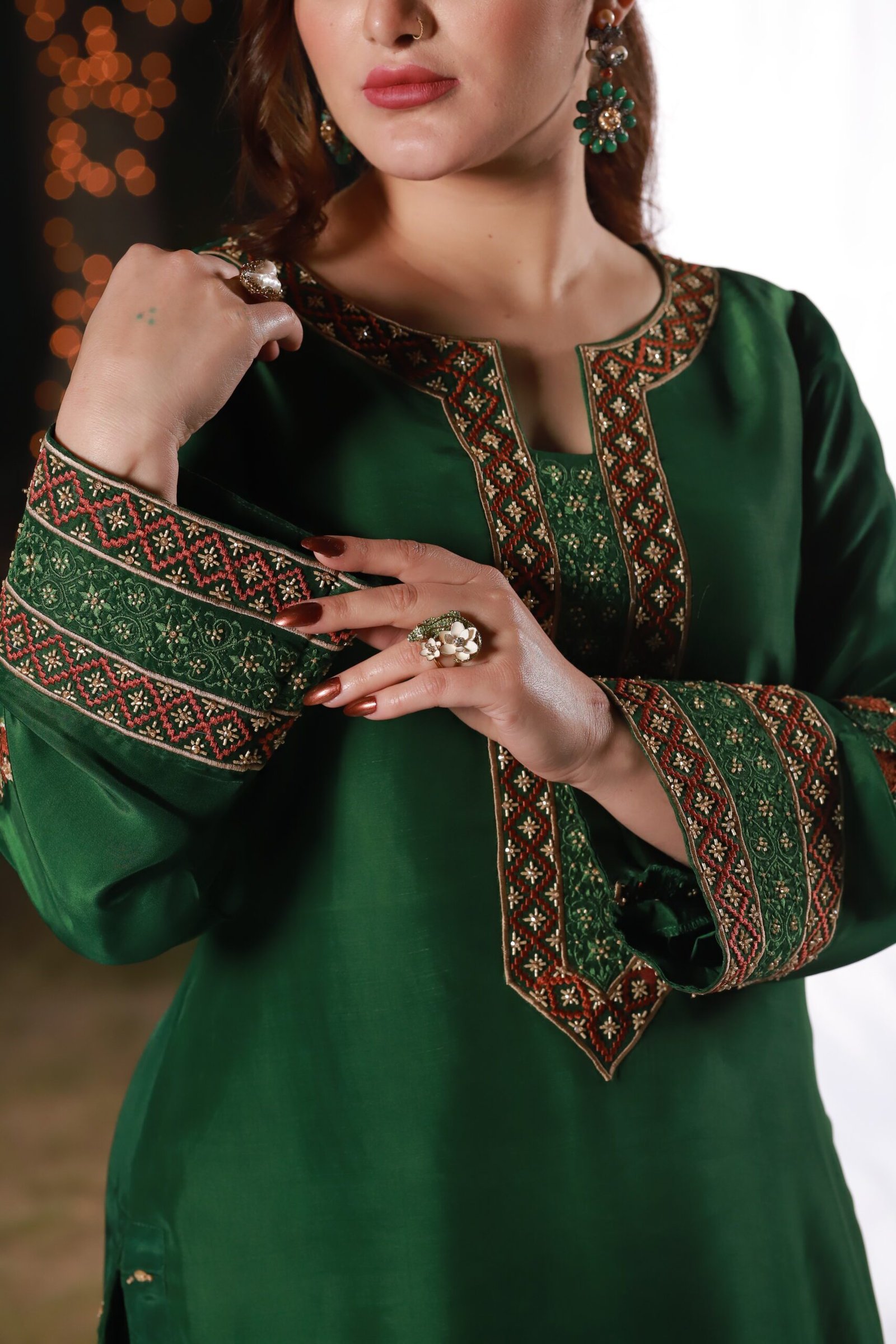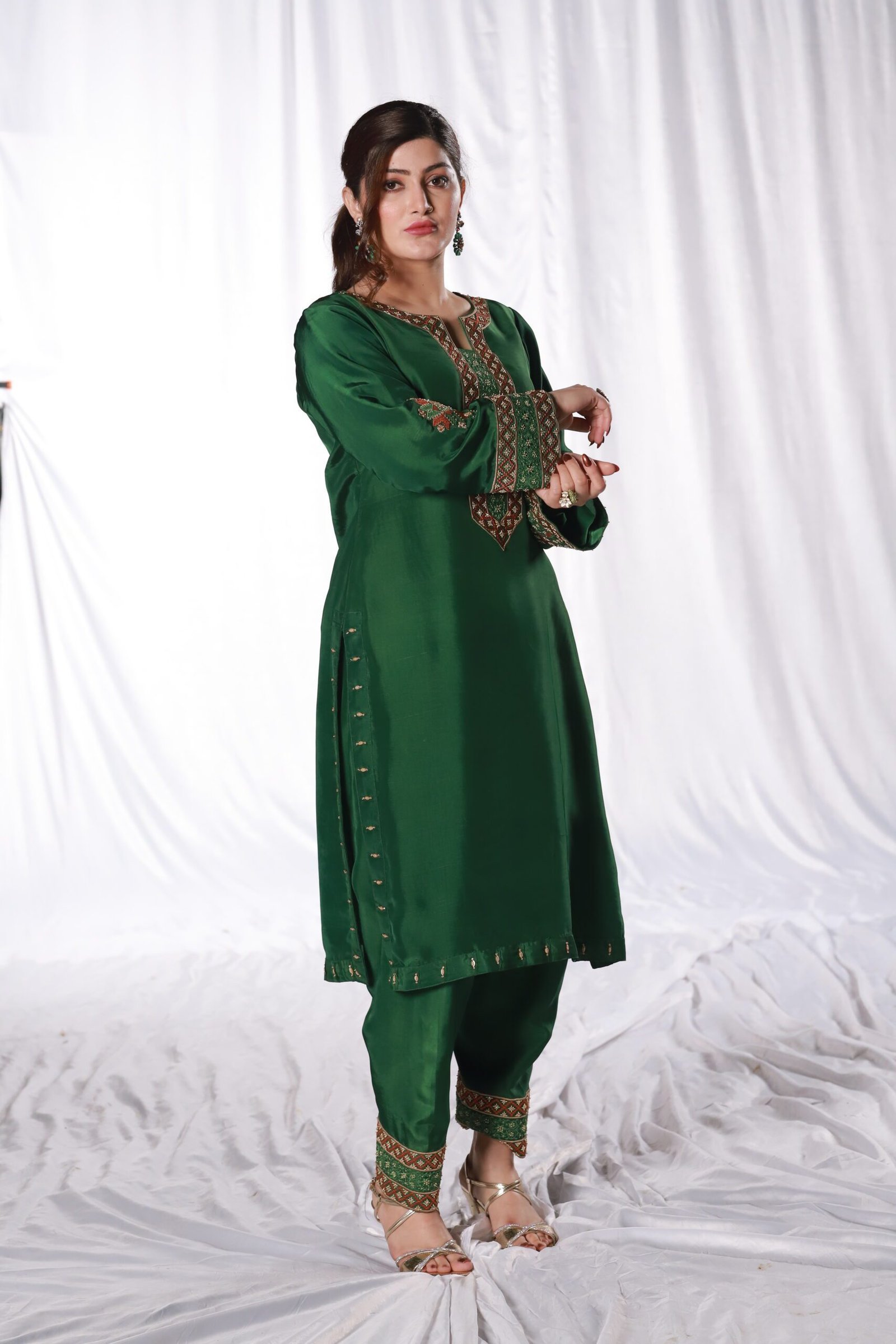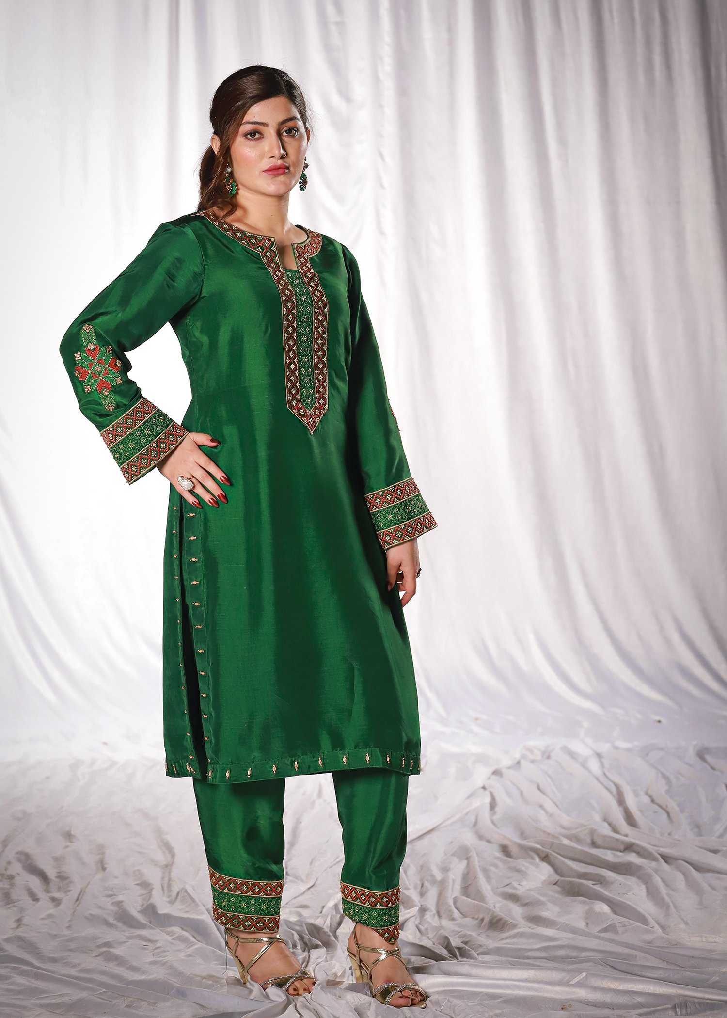This two-piece dark green ensemble is crafted from sleek tessel silk, offering a polished, structured look. The neckline, sleeves, and hem feature detailed machine embroidery, further elevated with hand embellishment using katdana, moti, and sequins. The straight-cut silhouette paired with embroidered trousers keeps the outfit refined and balanced.