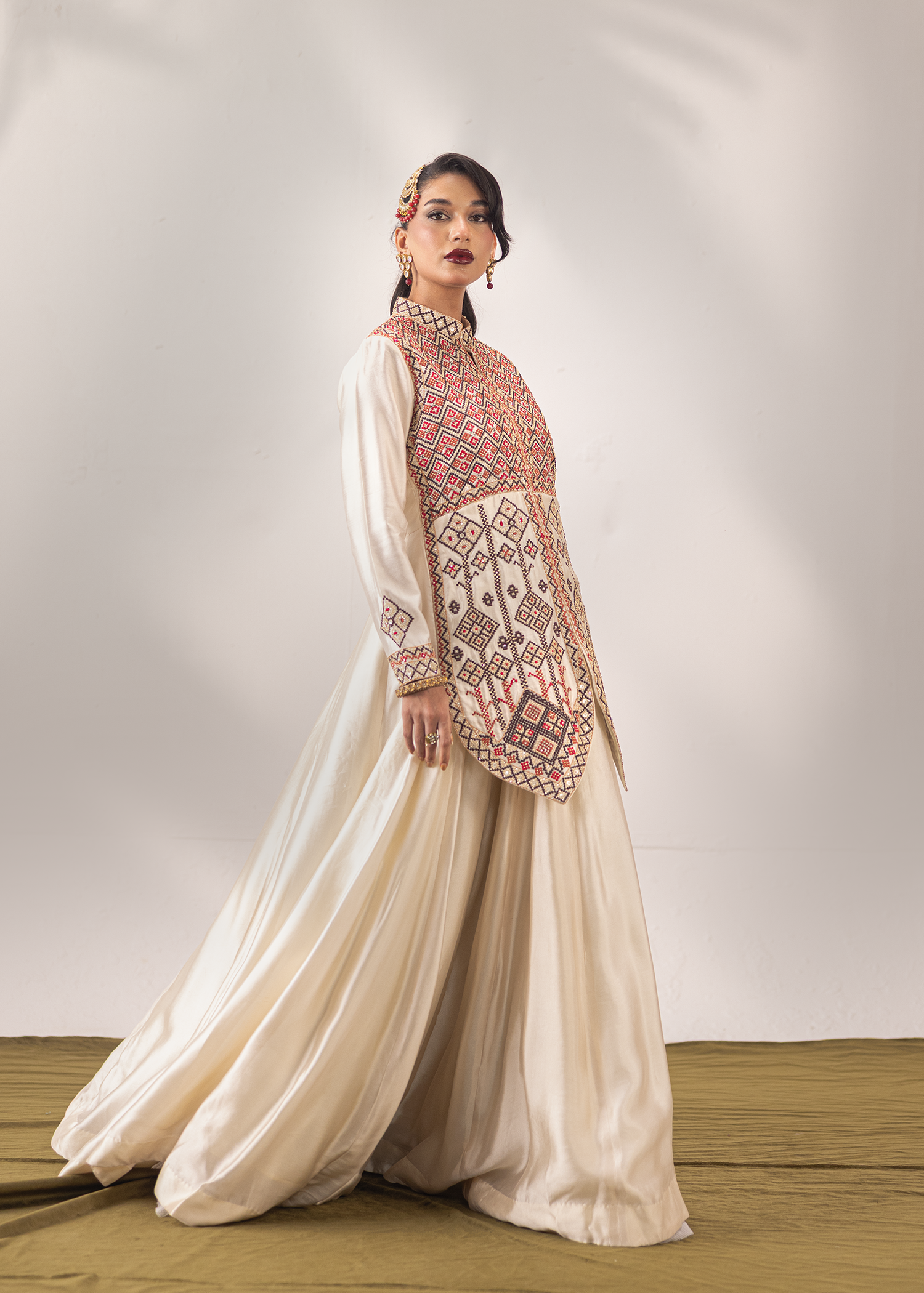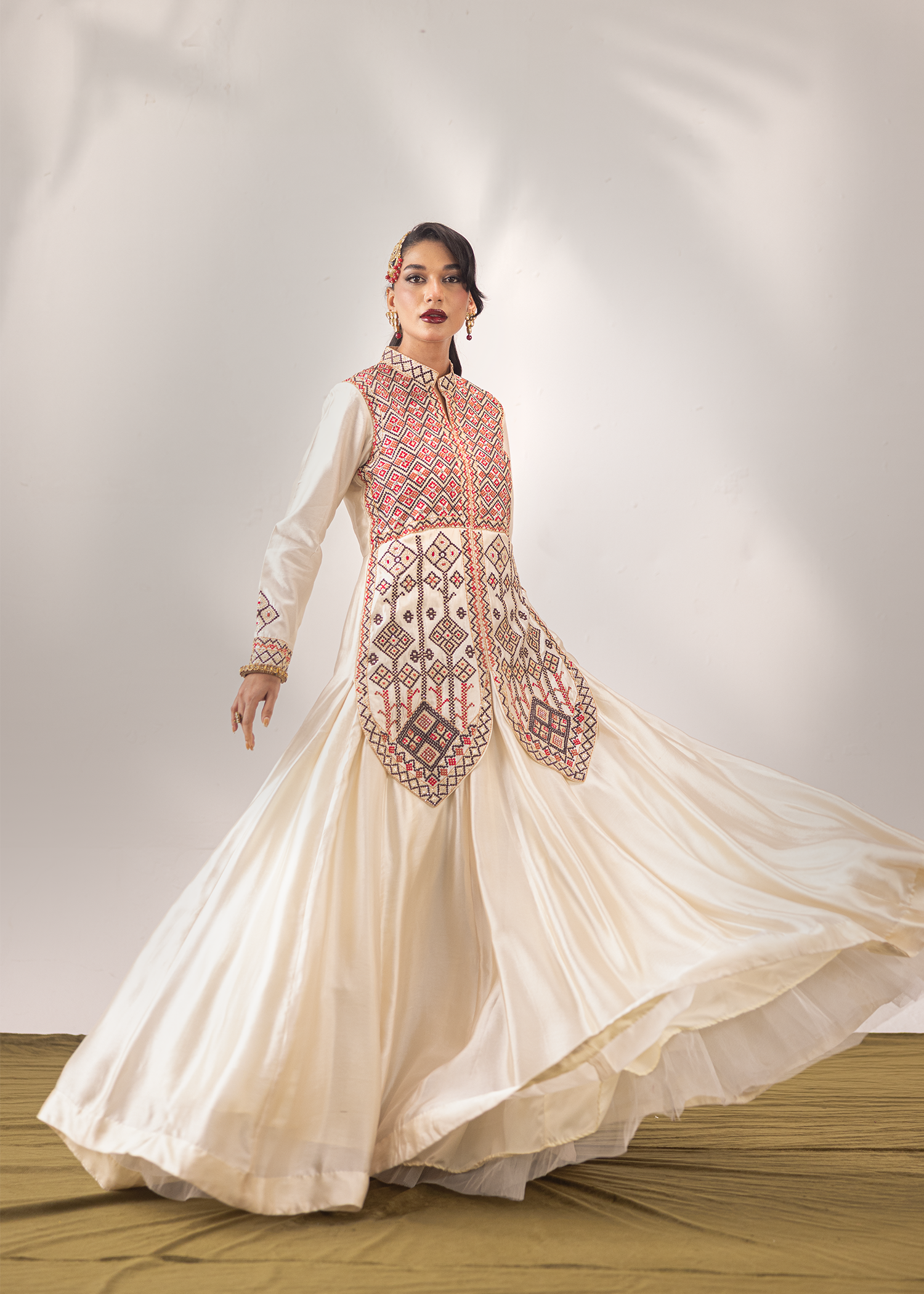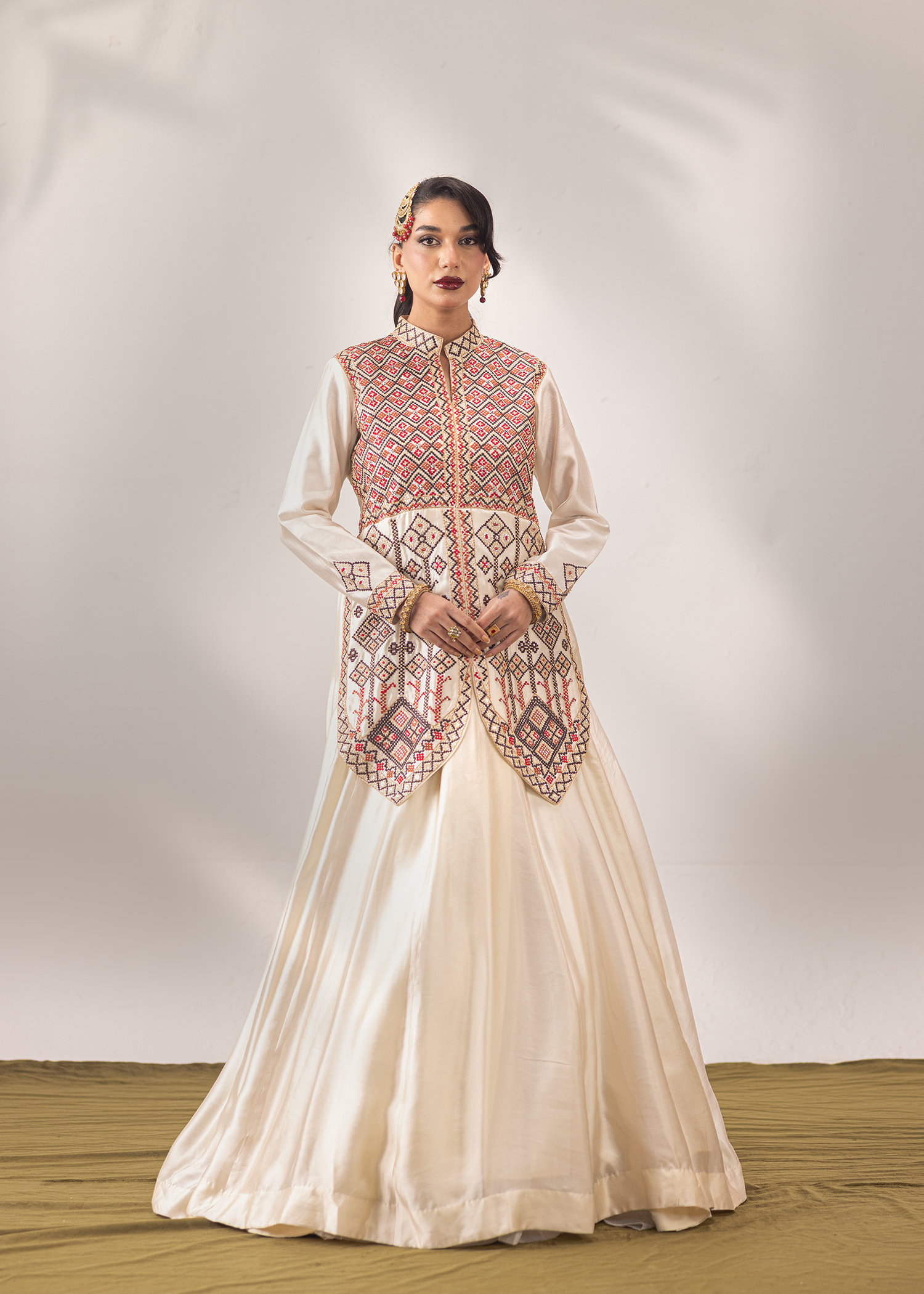 An exquisite one-piece masterpiece in ivory sheesha silk, crafted with signature machine embroidery and meticulously embellished with Swarovski, sequins, and katdana. The geometric patterns add a regal charm, blending tradition with contemporary finesse, a timeless silhouette for those who appreciate understated opulence.