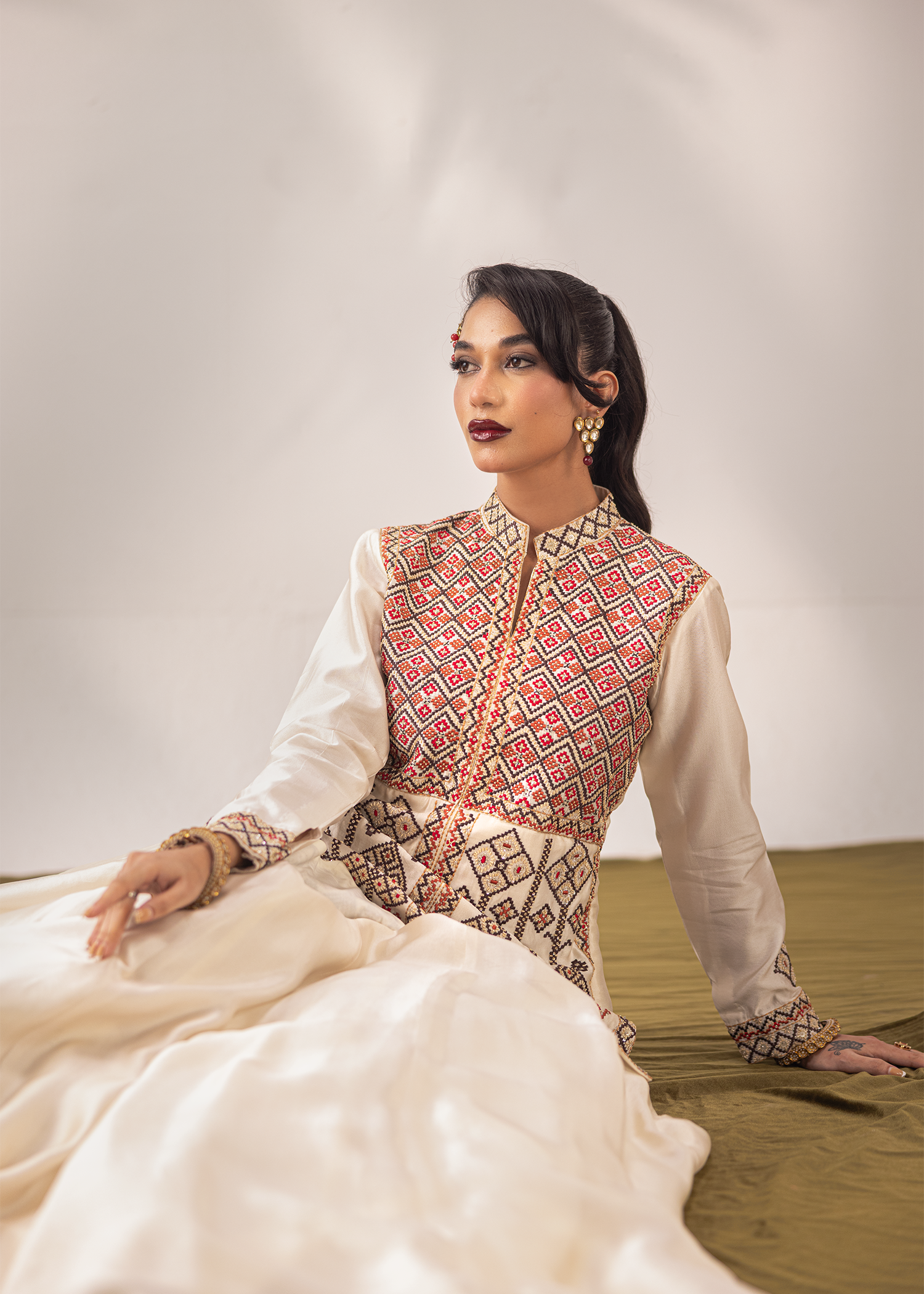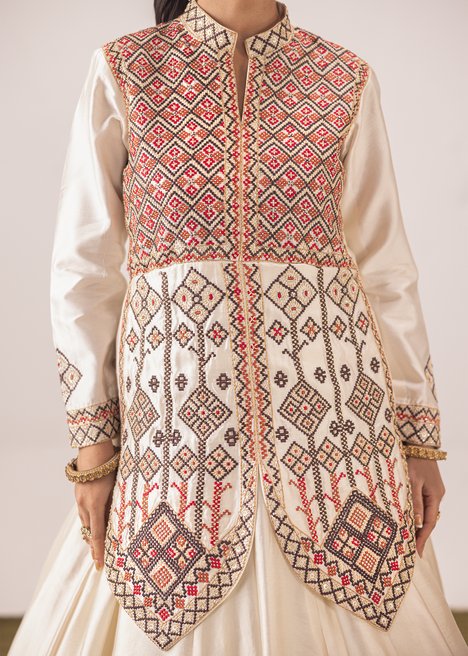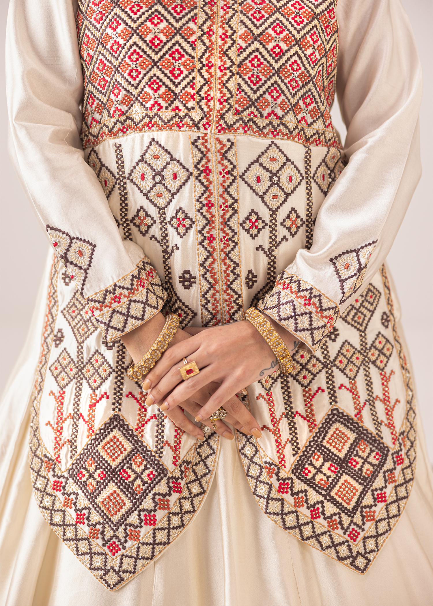 An exquisite one-piece masterpiece in ivory sheesha silk, crafted with signature machine embroidery and meticulously embellished with Swarovski, sequins, and katdana. The geometric patterns add a regal charm, blending tradition with contemporary finesse, a timeless silhouette for those who appreciate understated opulence.