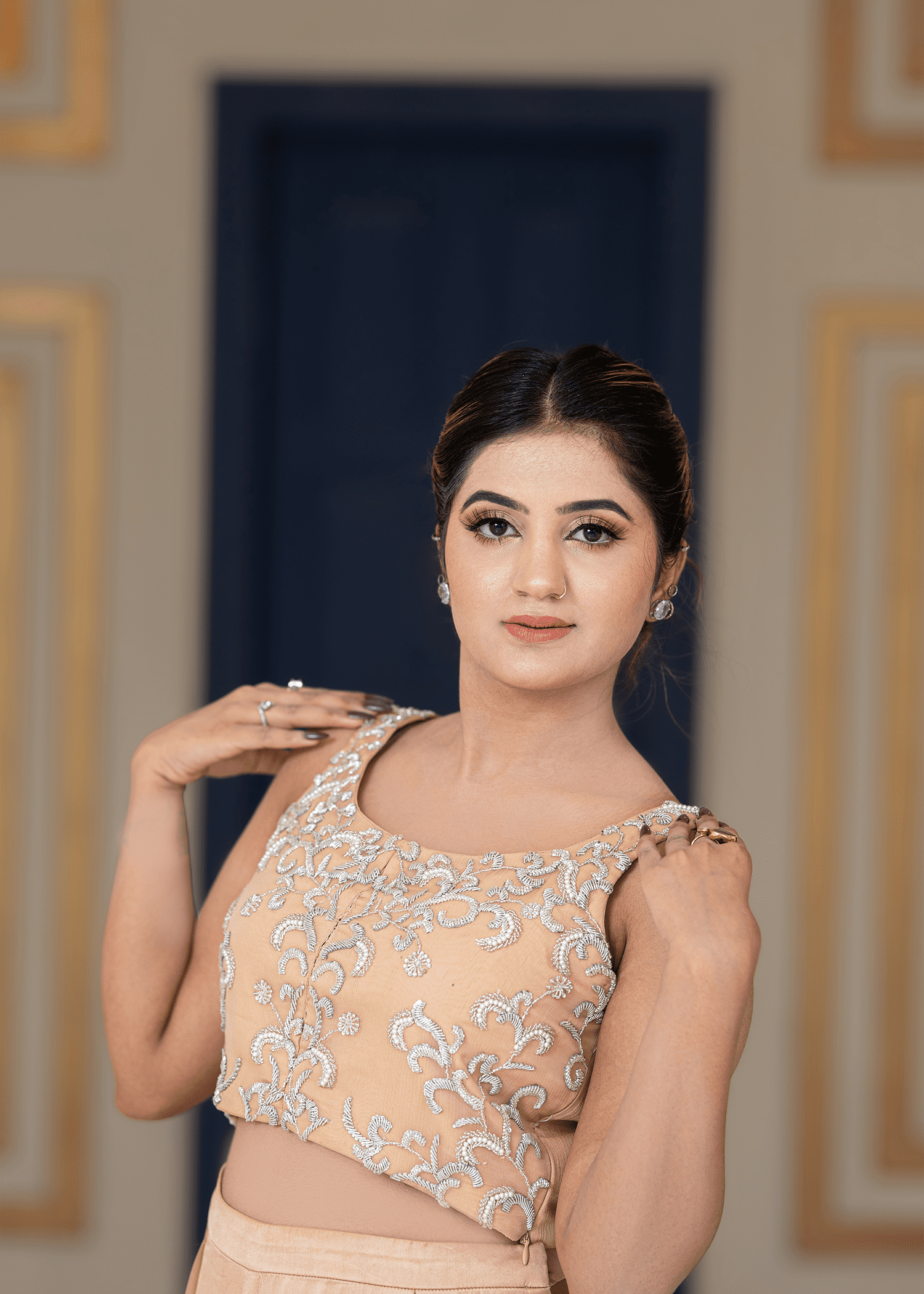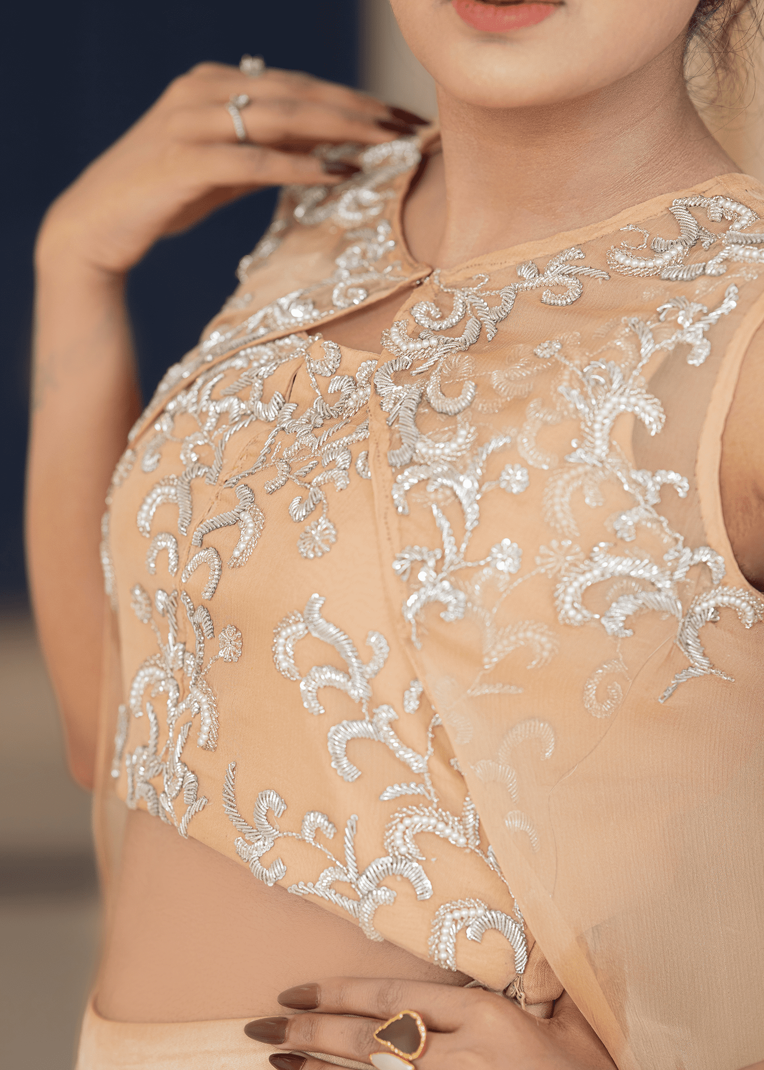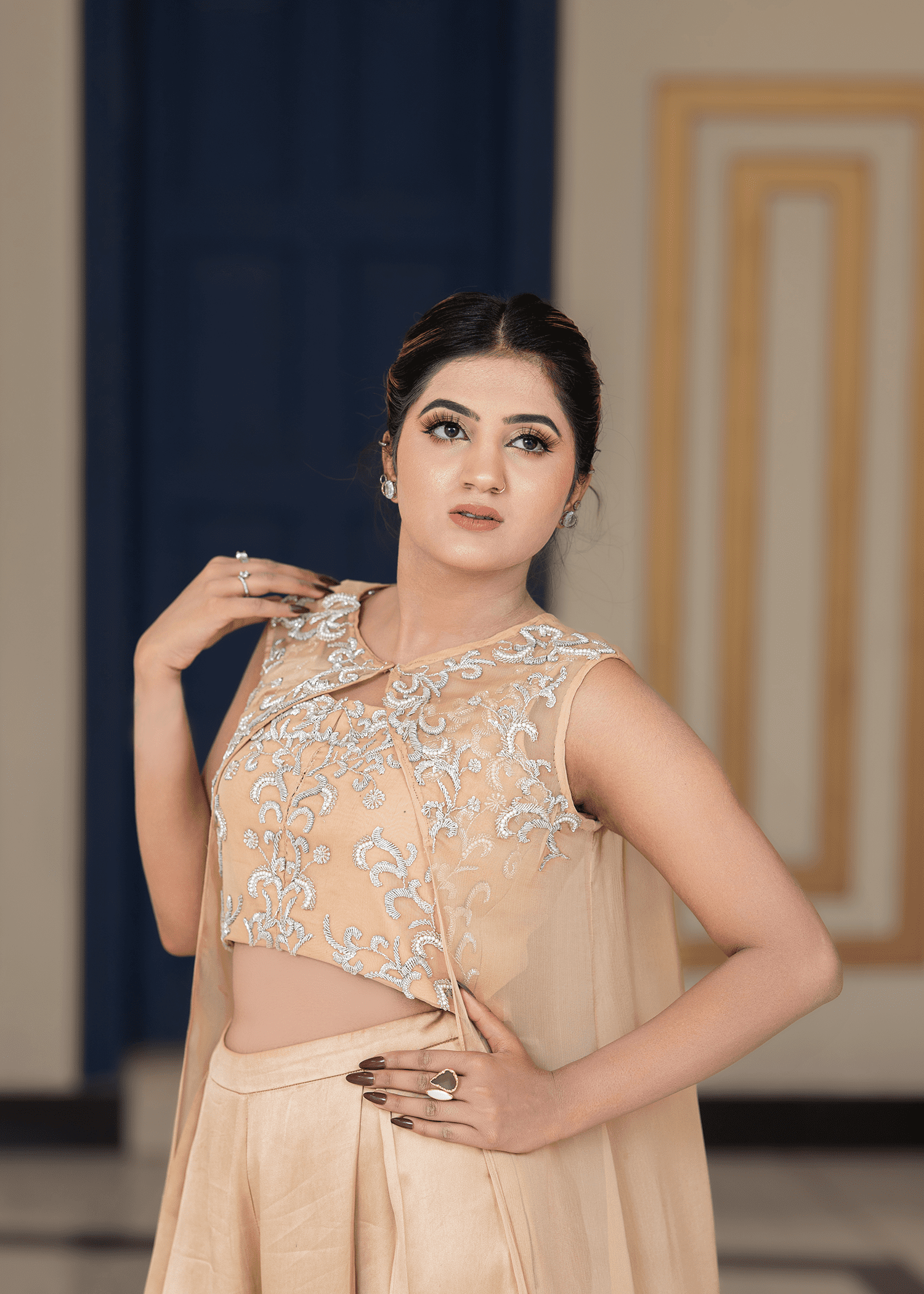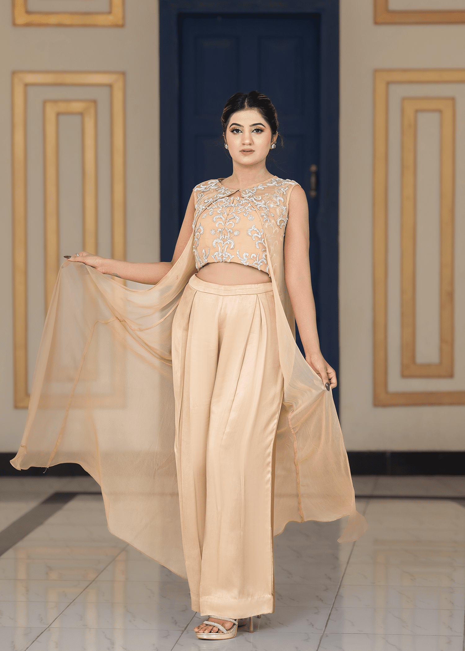 A refined three-piece in beige, tailored from chiffon and pure silk. Accented with intricate hand embroidery, this ensemble embodies quiet sophistication and timeless elegance.