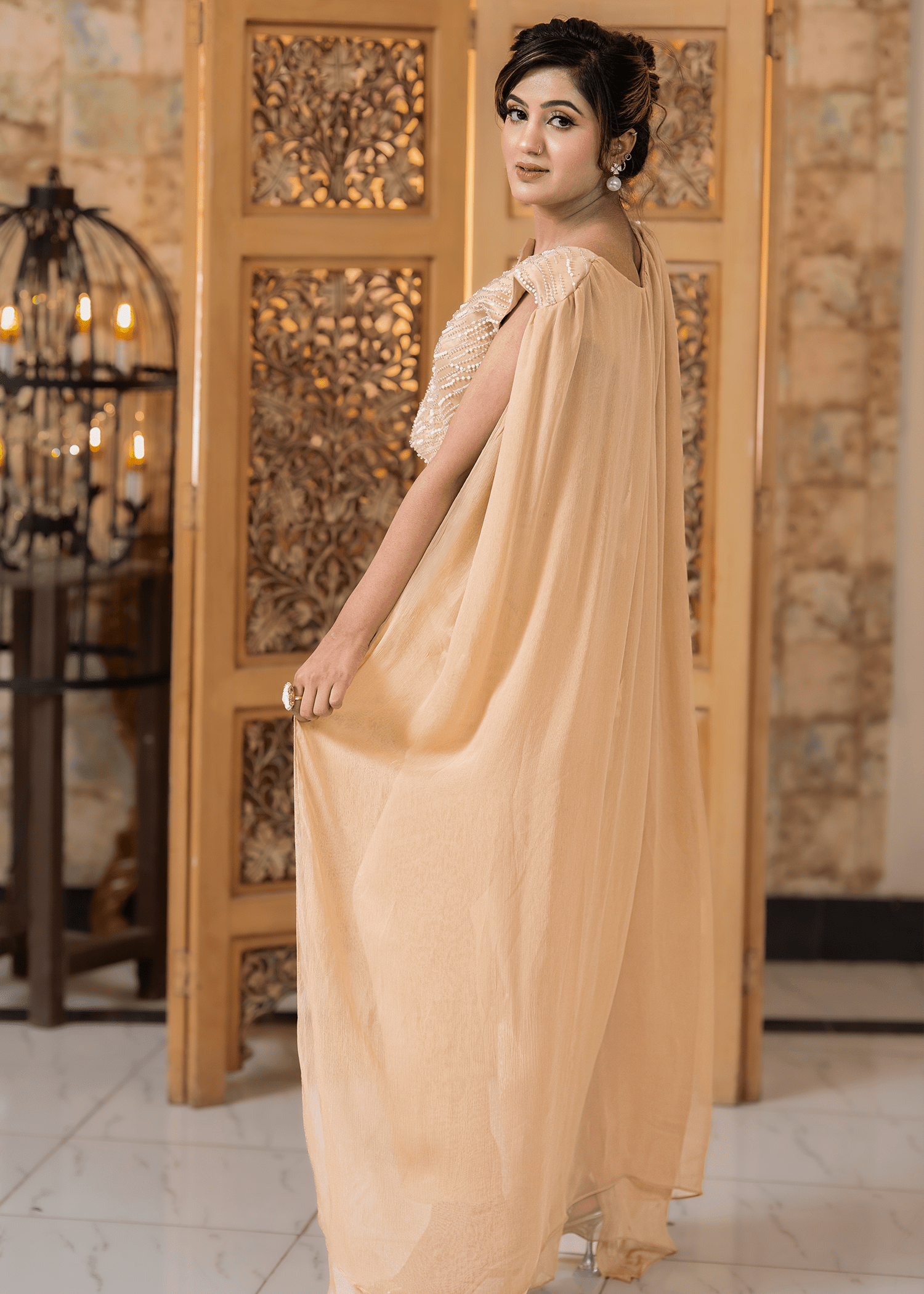 An elegant fusion ensemble crafted from chiffon, silk, and net. The hand-embellished bodice features delicate detailing over a sleek silk base. Paired with tailored trousers and a flowing net cape for contemporary sophistication. Perfect for formal soirées and modern festive occasions.