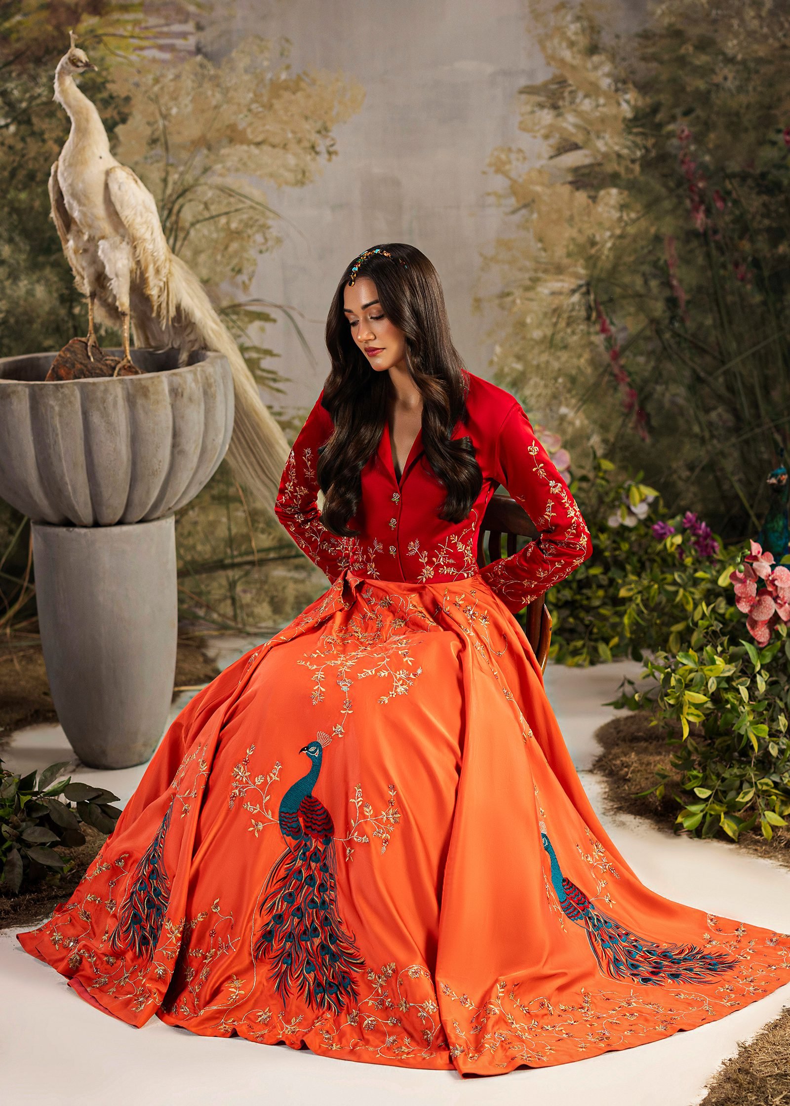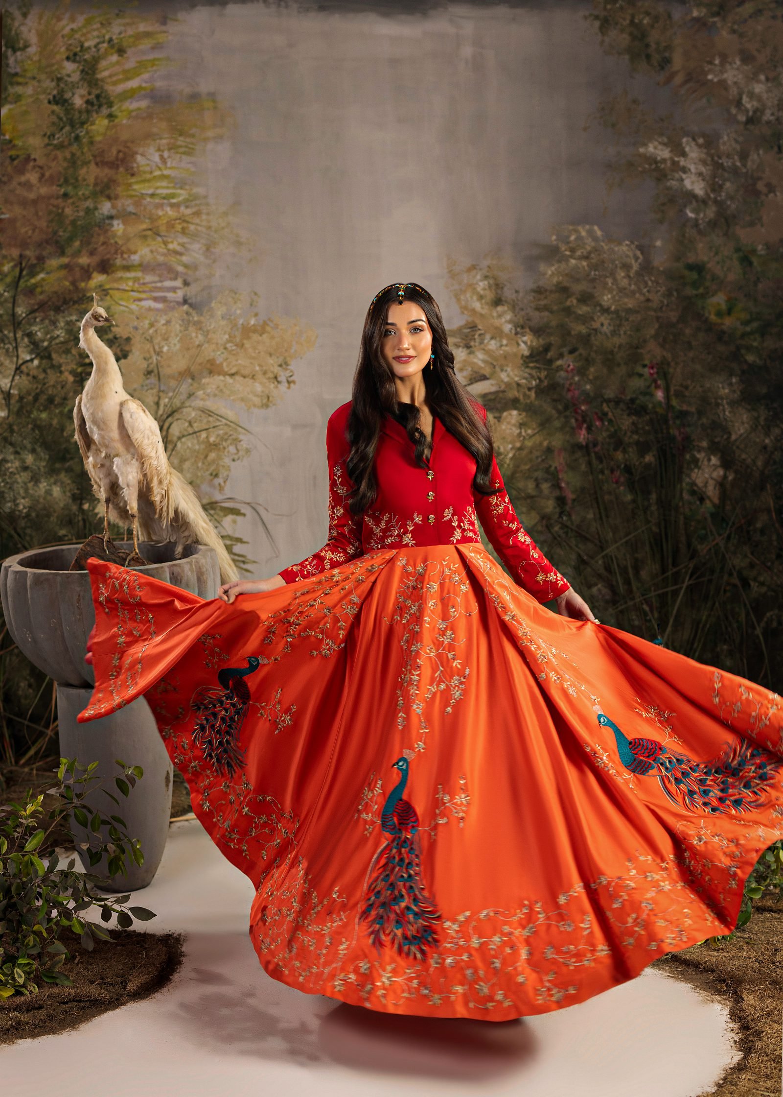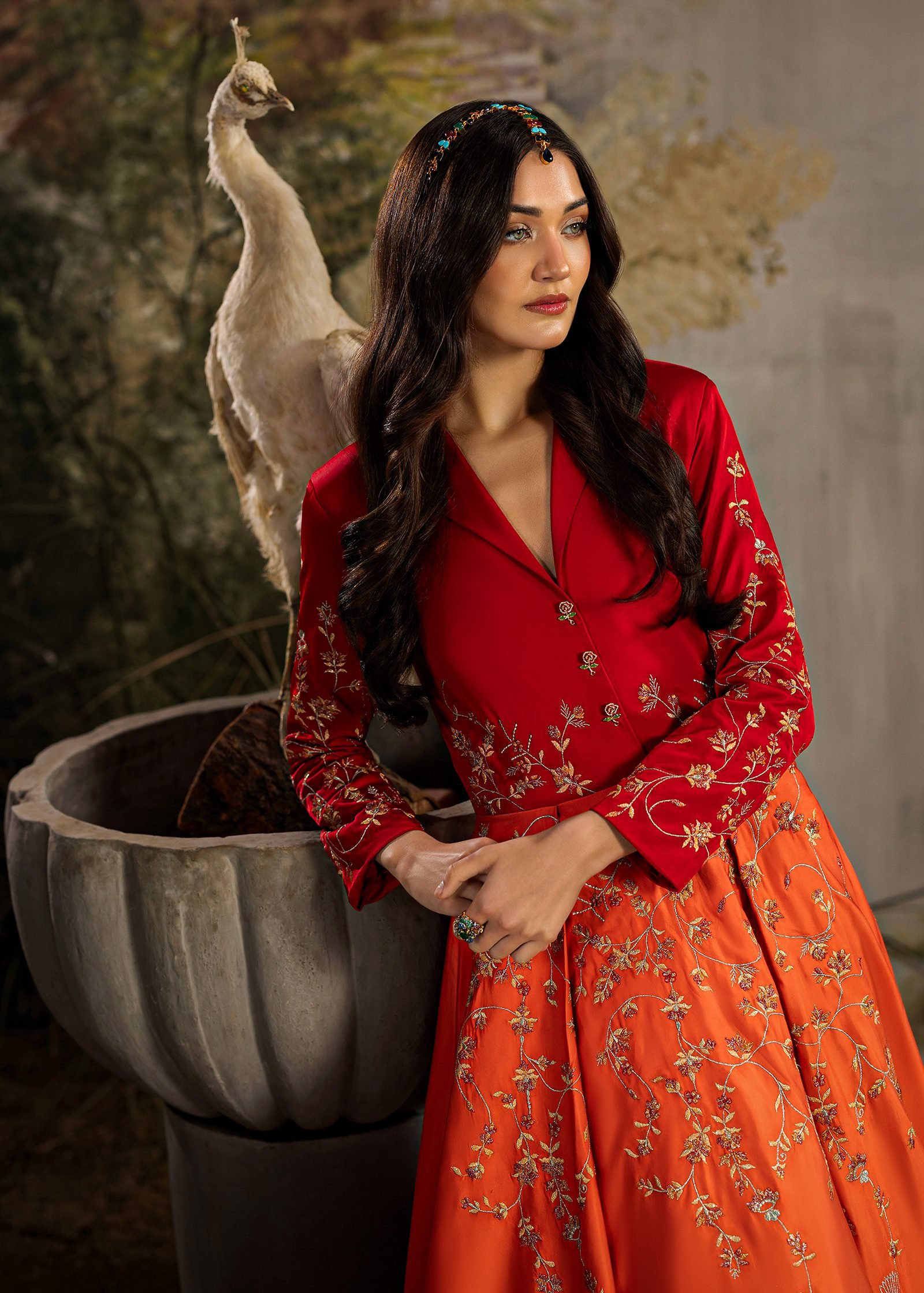 A vibrant red and peach ensemble crafted in smooth satin silk. Fine machine embroidery adds detail and contrast to the fluid silhouette. A balanced design that blends festive color with refined simplicity.