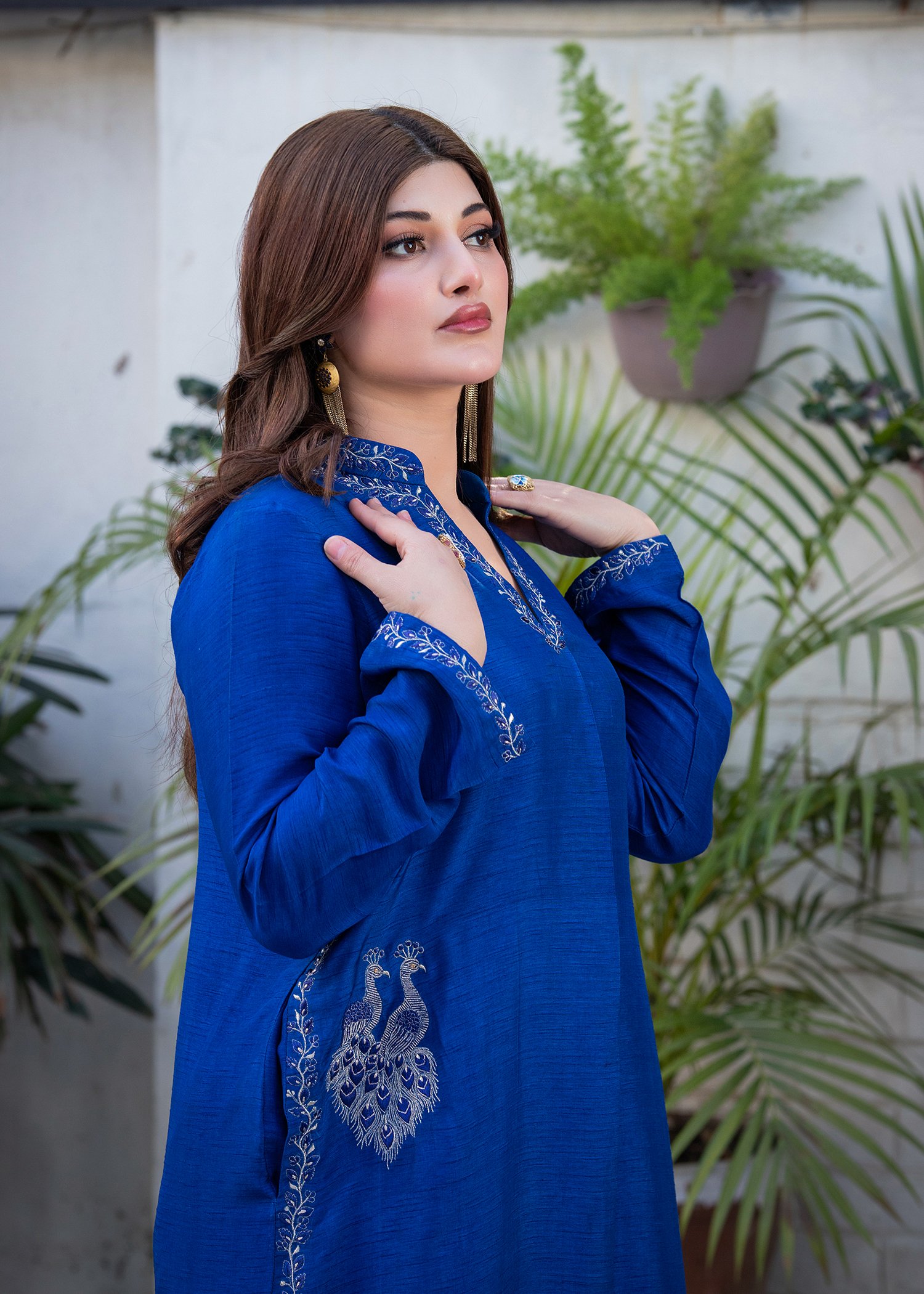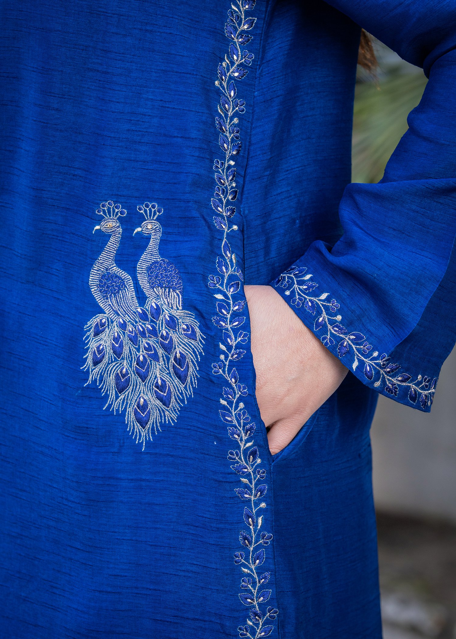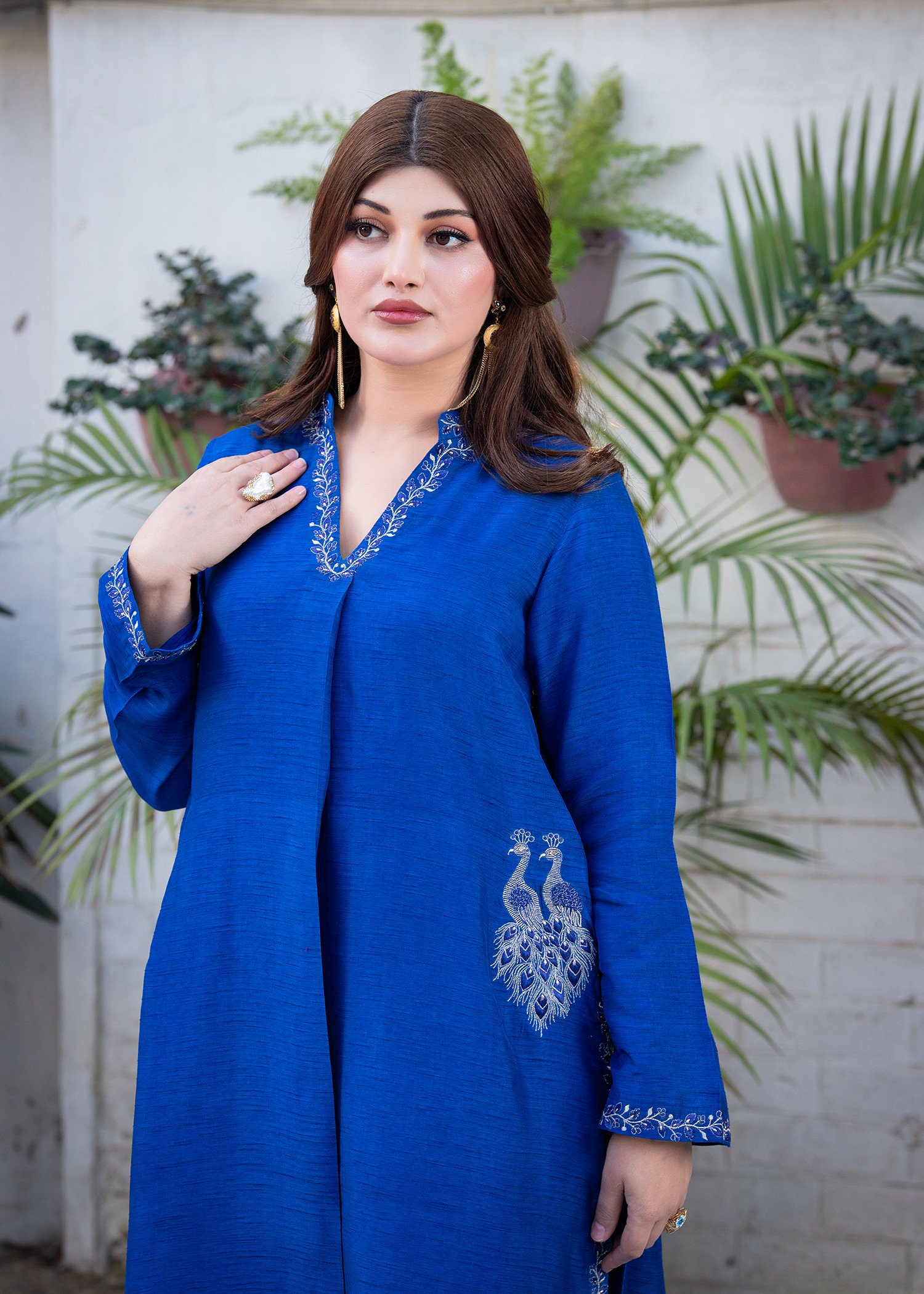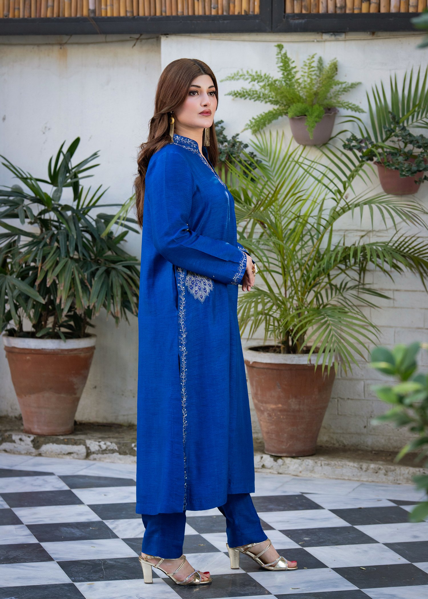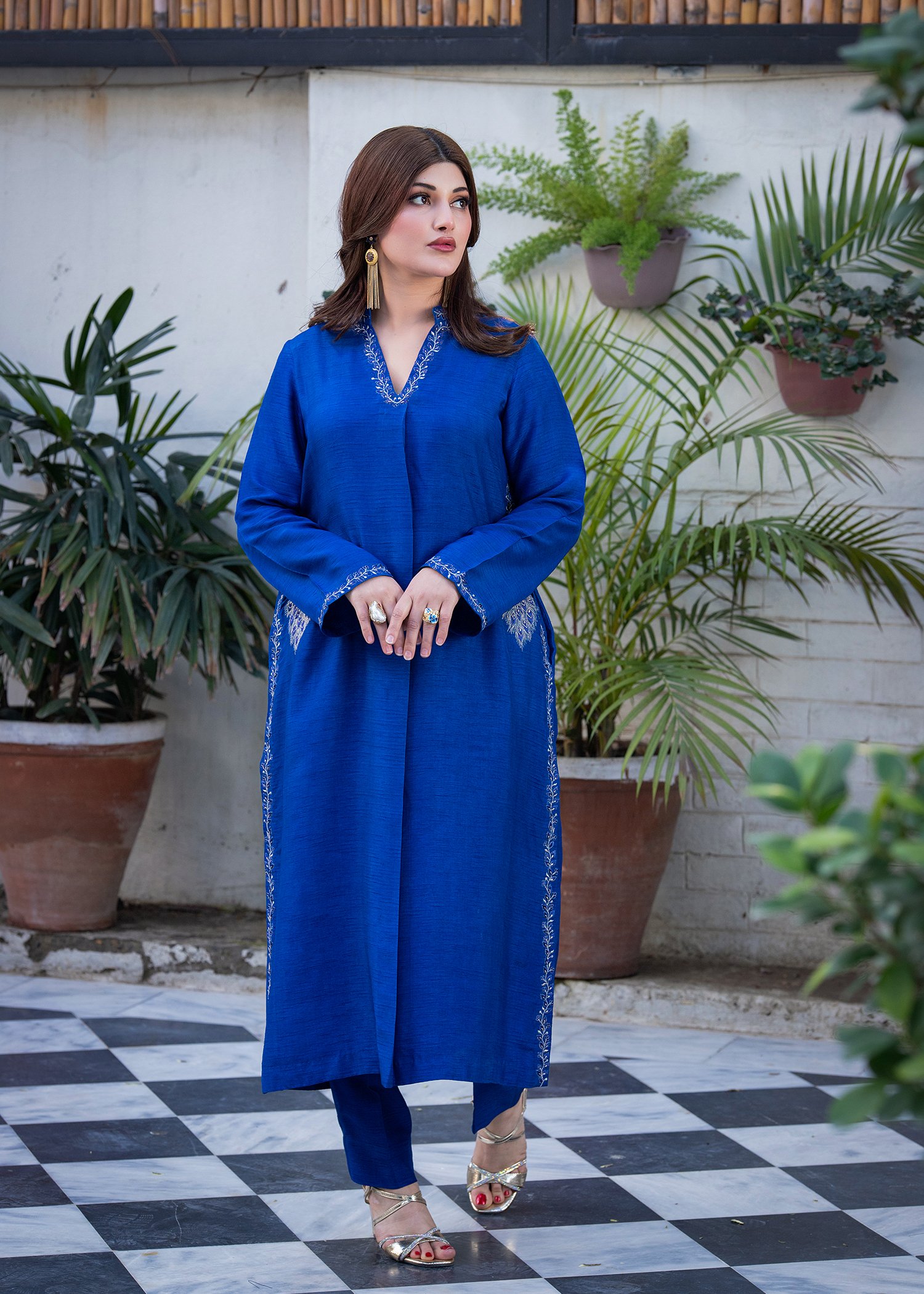 Rendered in a deep Royal Blue, this ensemble is tailored from premium Korean silk for a smooth, structured drape. Precision machine embroidery with resham thread defines the neckline, sleeves, and side panels, while subtle tilla work introduces controlled metallic depth.