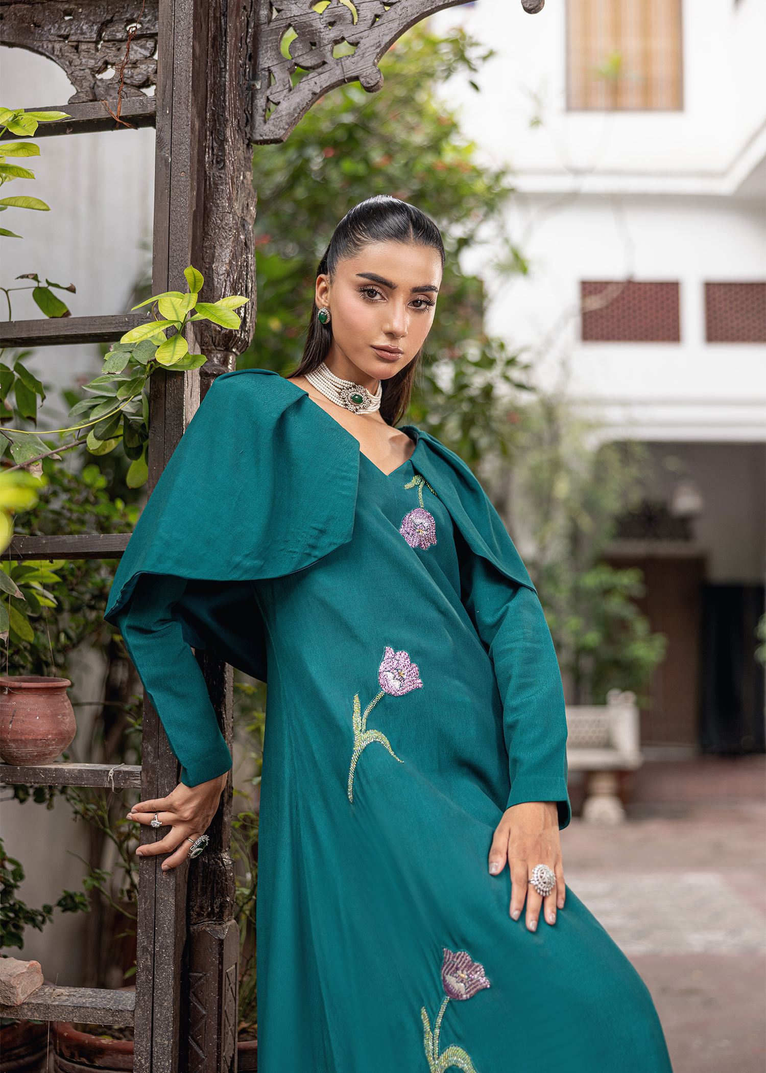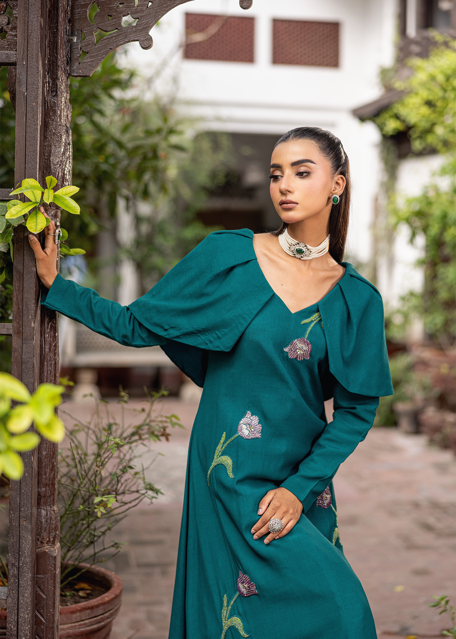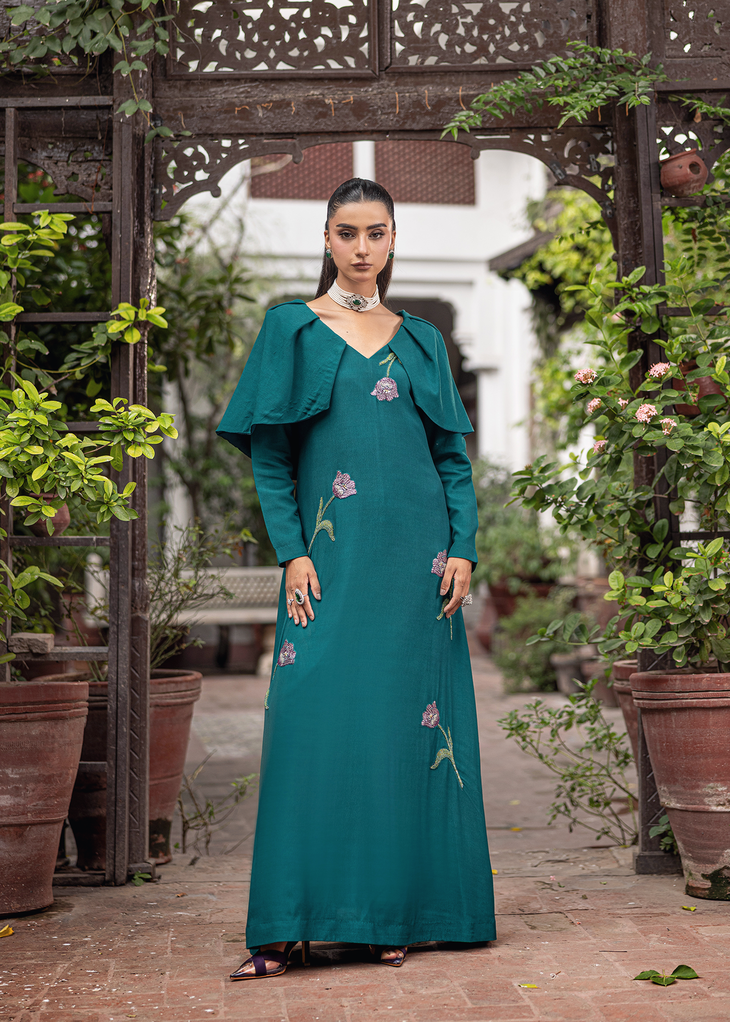 A one-piece gown in teal georgette, accented with floral hand embellishment in katdana. The soft overlay detailing adds fluidity, making it an elegant festive statement.