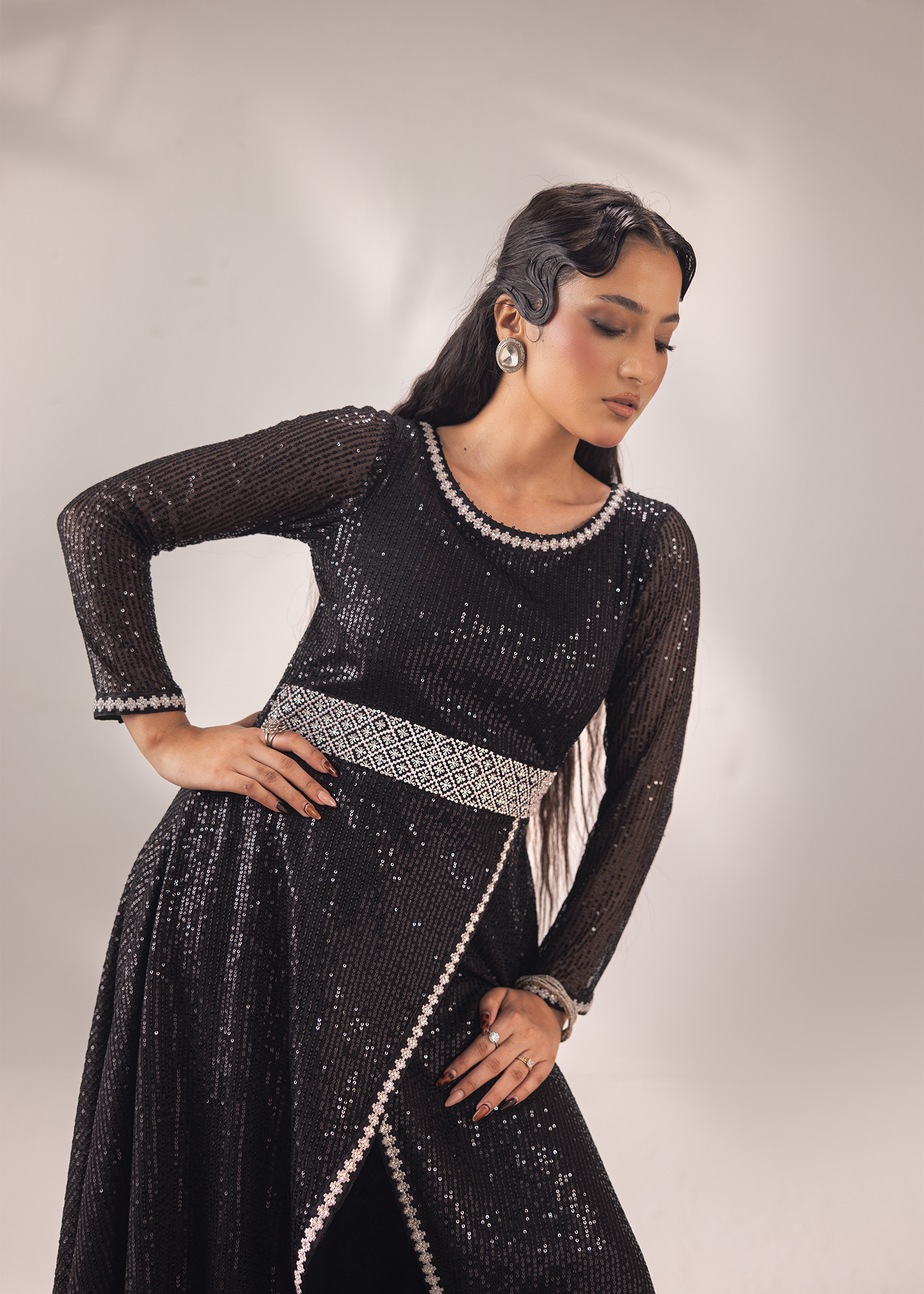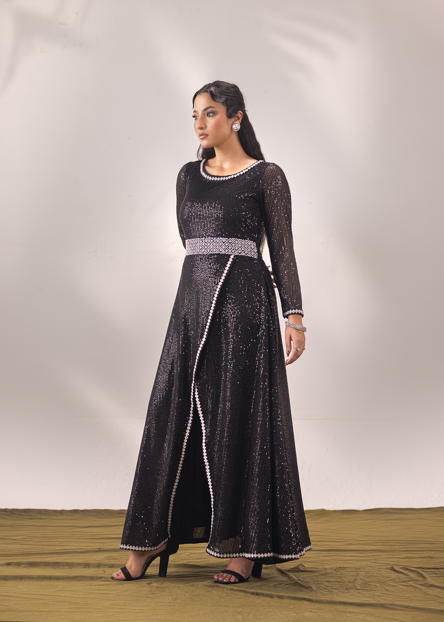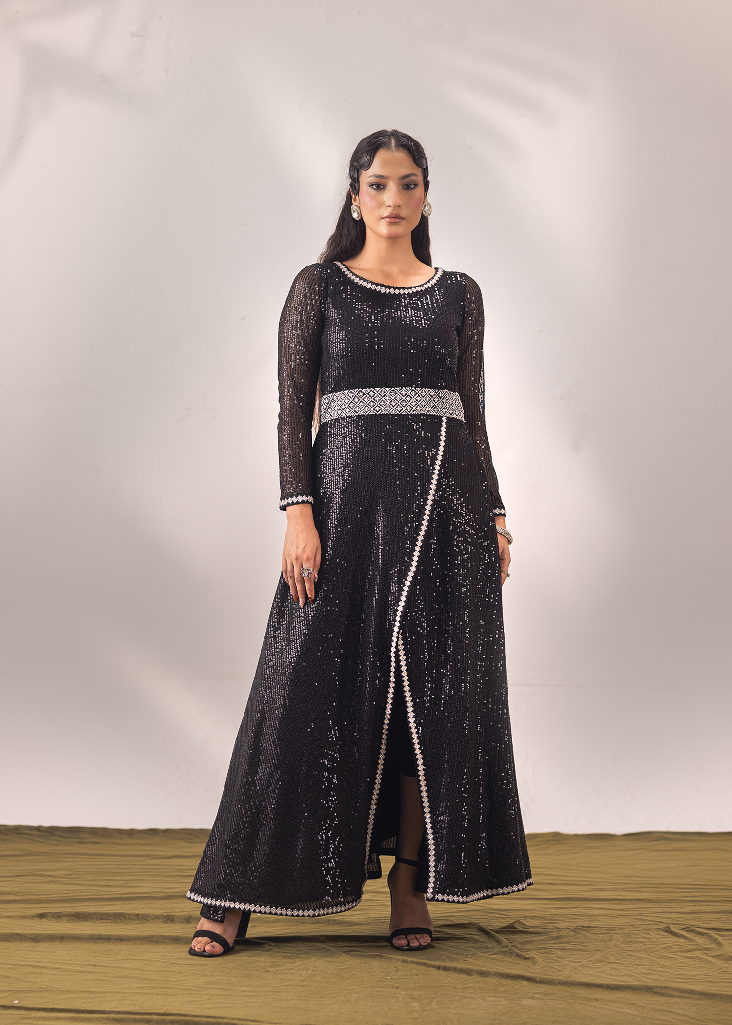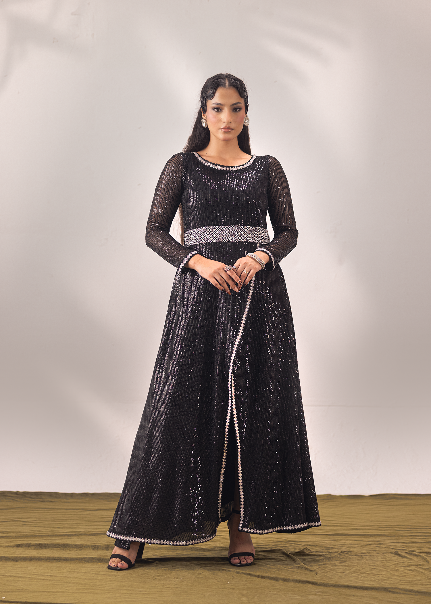 One-piece masterpiece in timeless black, crafted from sequined net and silk organza. The silhouette is elevated with exquisite hand embroidery and meticulous hand embellishments featuring Swarovski crystals, sequins, and katdana. A statement of elegance and modern allure, perfect for evening soirées and high-fashion occasions.