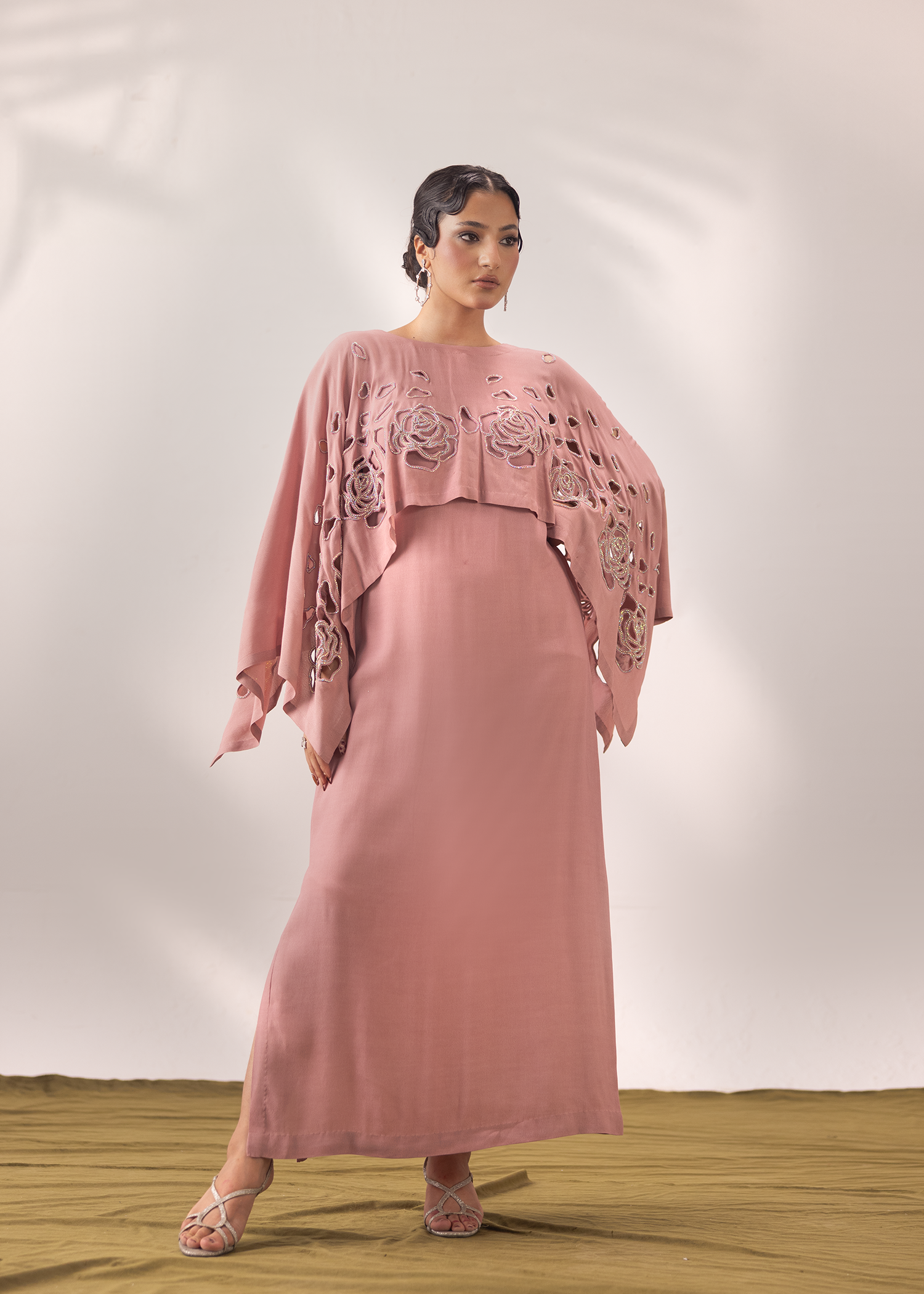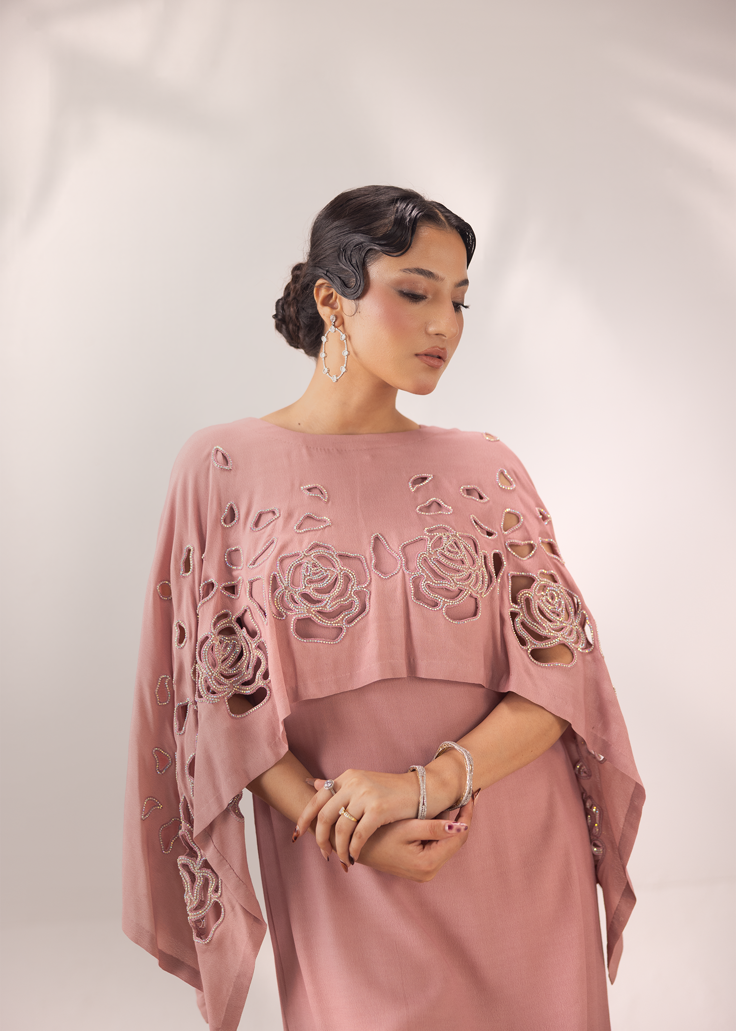 A two-piece set in flamingo pink georgette, featuring delicate cutwork outlined with rhinestones. The flowing silhouette and cape-style overlay create a modern yet graceful statement.