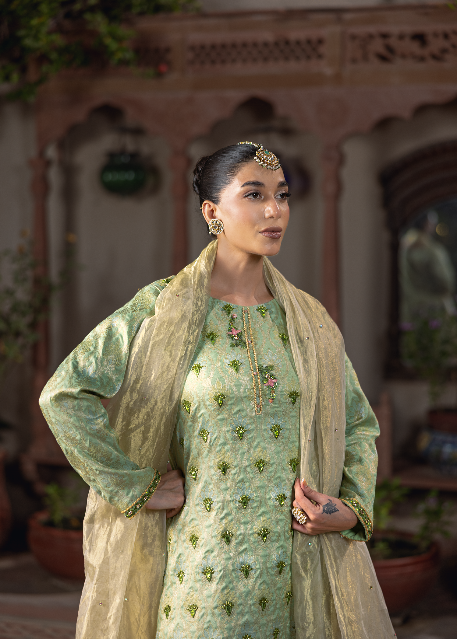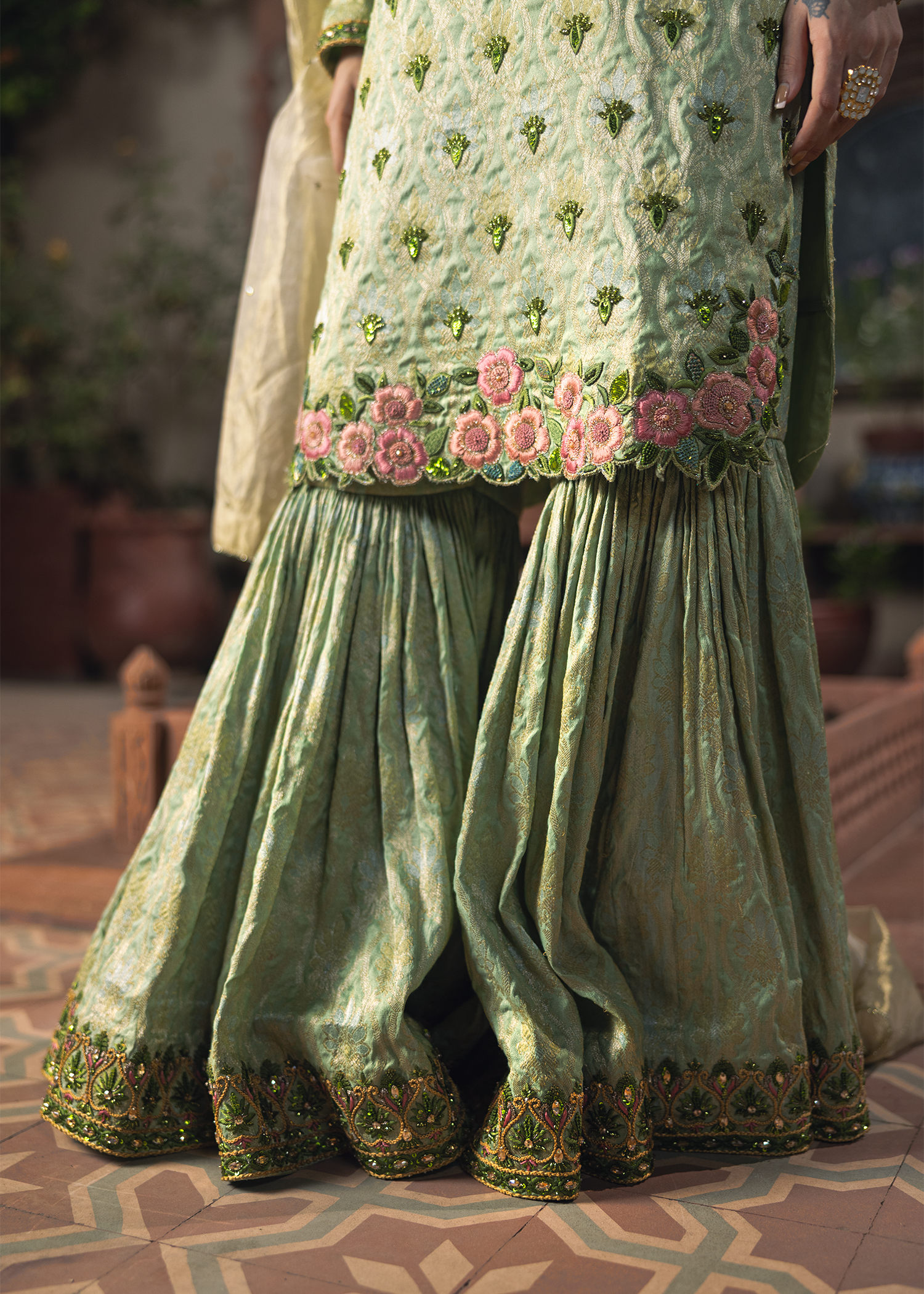 A three-piece set in refreshing mint green, crafted from banaras and tissue. The kurta and gharara feature delicate cutwork, enhanced with hand embroidery and further embellished with katdana and sequins. Paired with a soft dupatta, the look captures refined elegance with artisanal detailing.