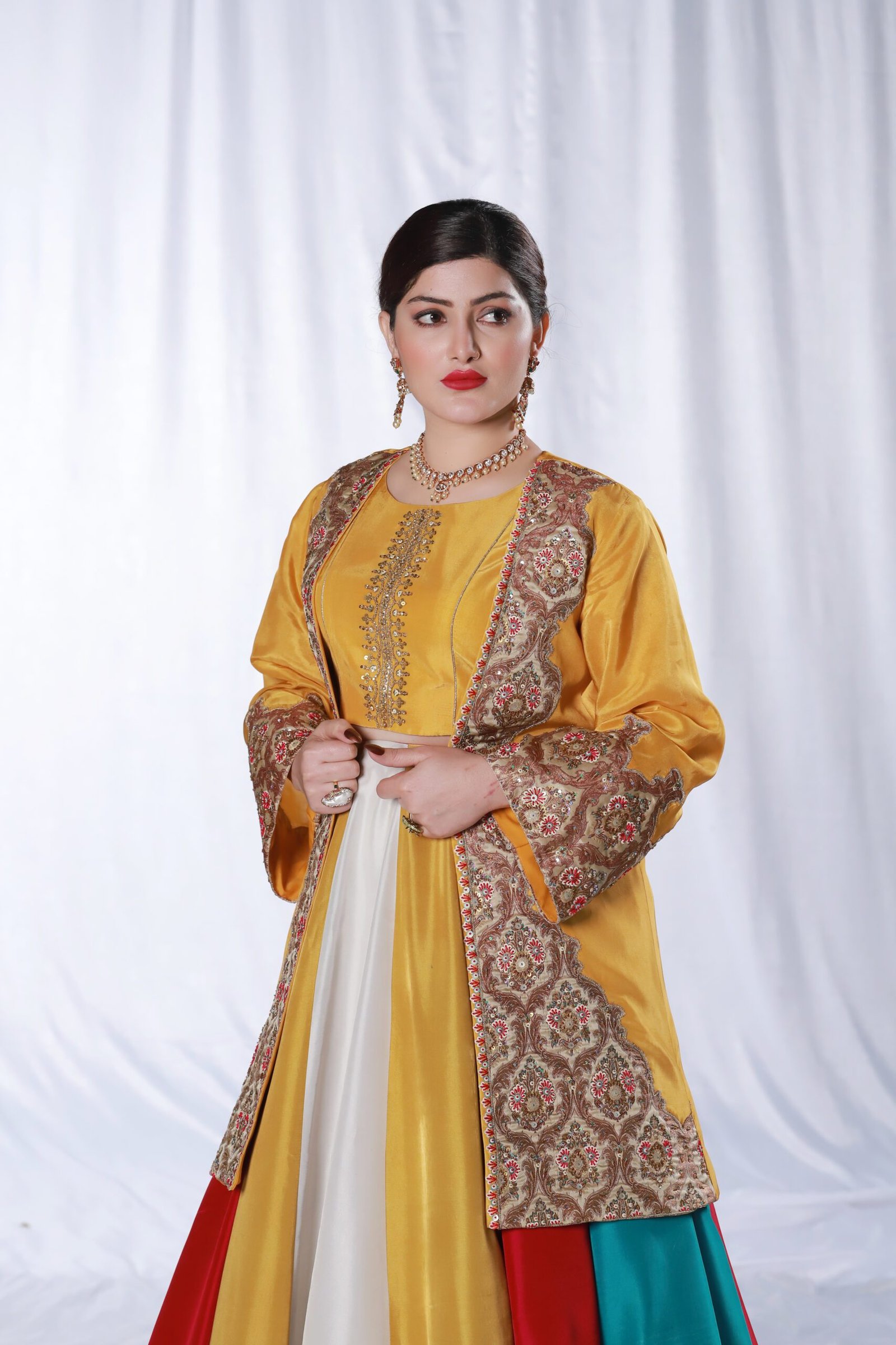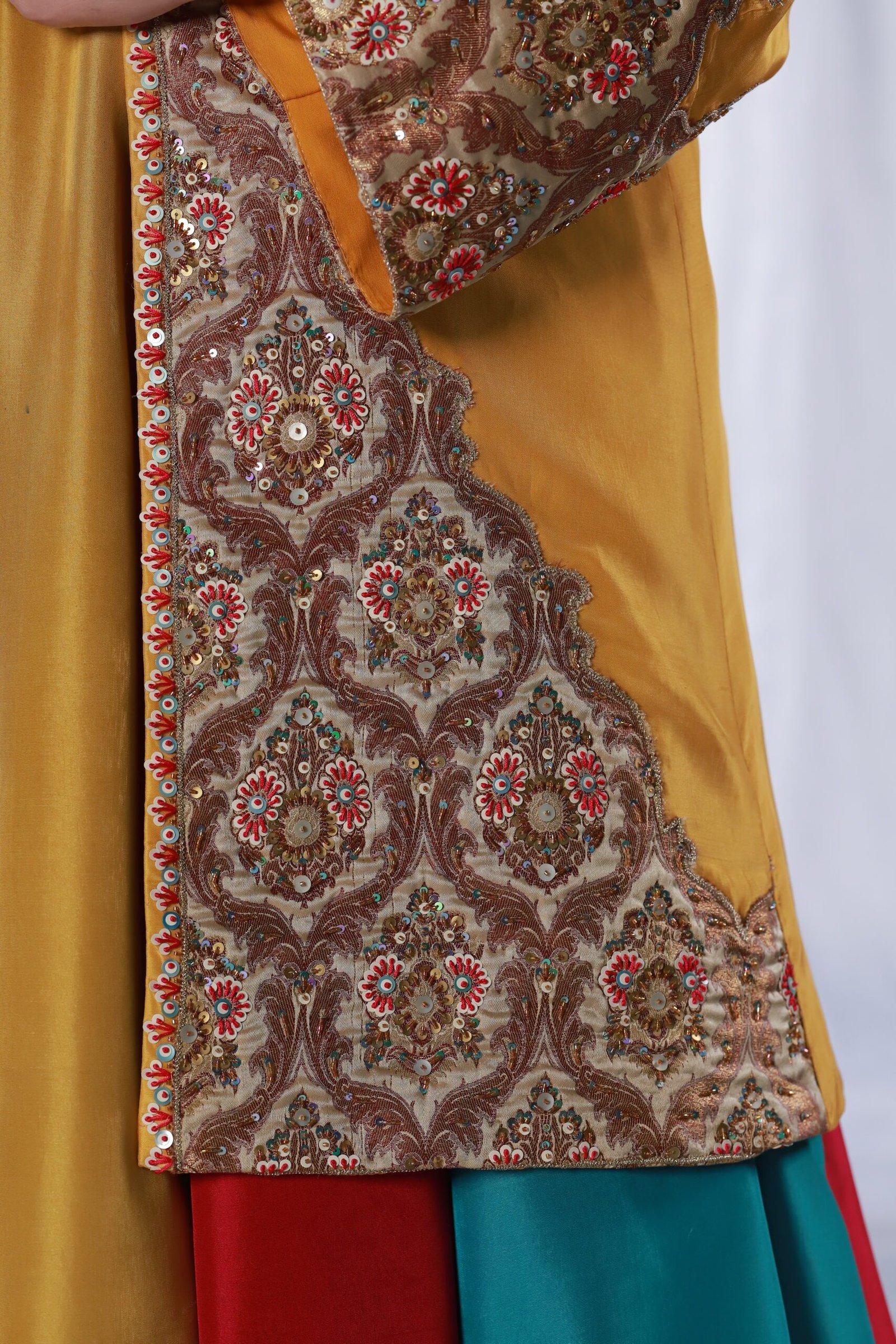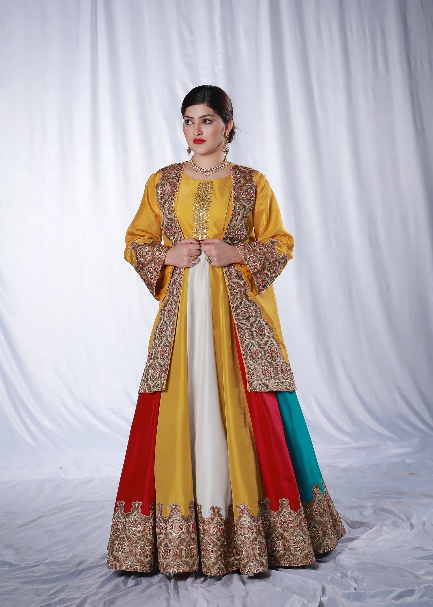 This three-piece ensemble is crafted on soft tessel silk, designed in a striking palette of mustard, pink, blue, and off-white. The front open jacket features intricate applique work paired with delicate hand embroidery, finished with resham, sequin, katdana, and moti detailing for a refined, textured look. The panels of the dress create a graceful flare, while the ornate embroidered borders add richness and depth.