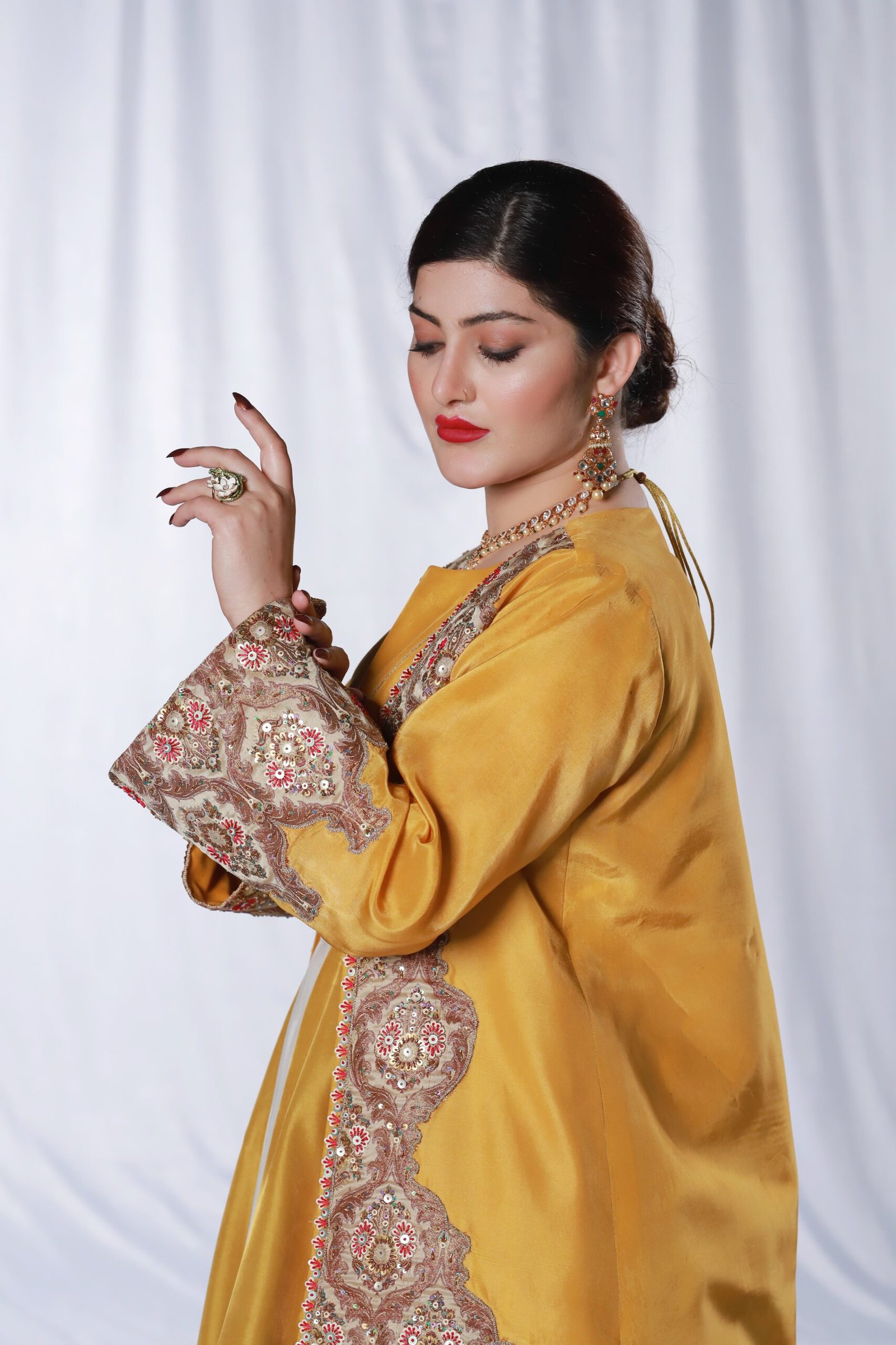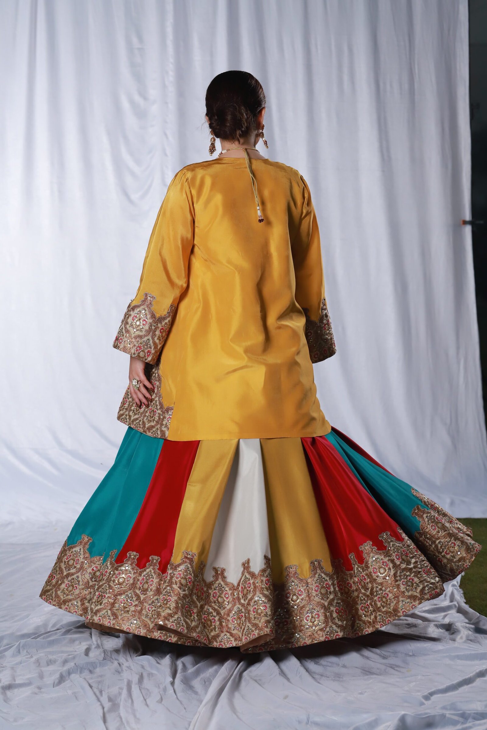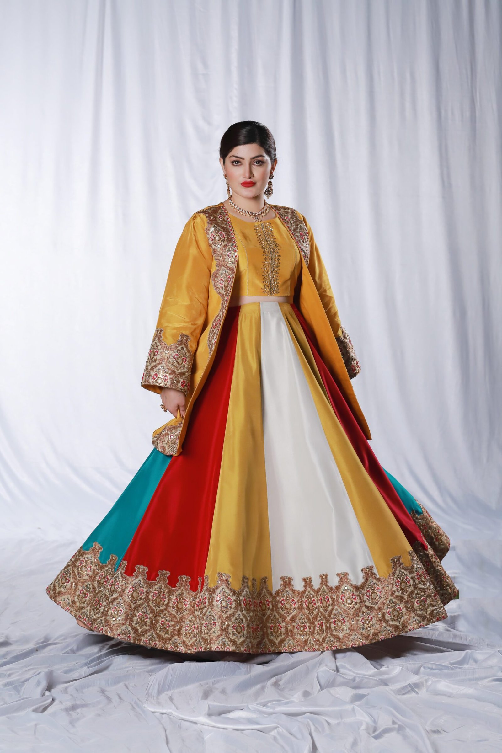 This three-piece ensemble is crafted on soft tessel silk, designed in a striking palette of mustard, pink, blue, and off-white. The front open jacket features intricate applique work paired with delicate hand embroidery, finished with resham, sequin, katdana, and moti detailing for a refined, textured look. The panels of the dress create a graceful flare, while the ornate embroidered borders add richness and depth.