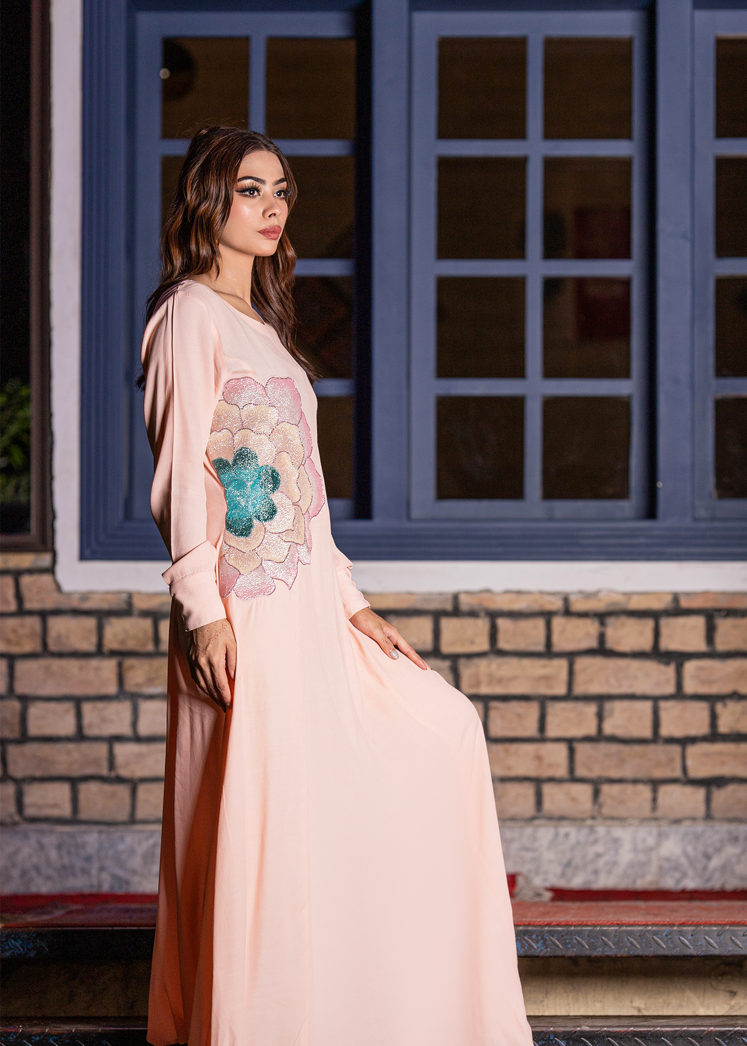 Soft peach georgette one-piece adorned with refined hand embellishment. Accented with intricate katdana work forming a statement floral motif. Lightweight fabric drapes elegantly, offering a graceful and modern silhouette. Ideal for semi-formal gatherings and contemporary festive wear.