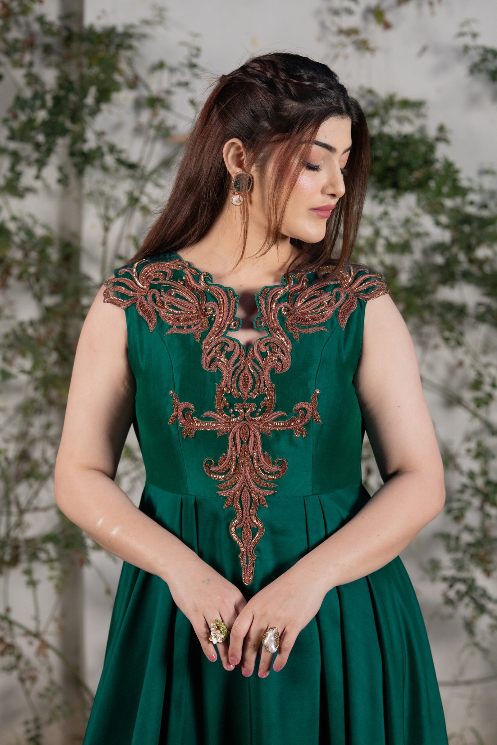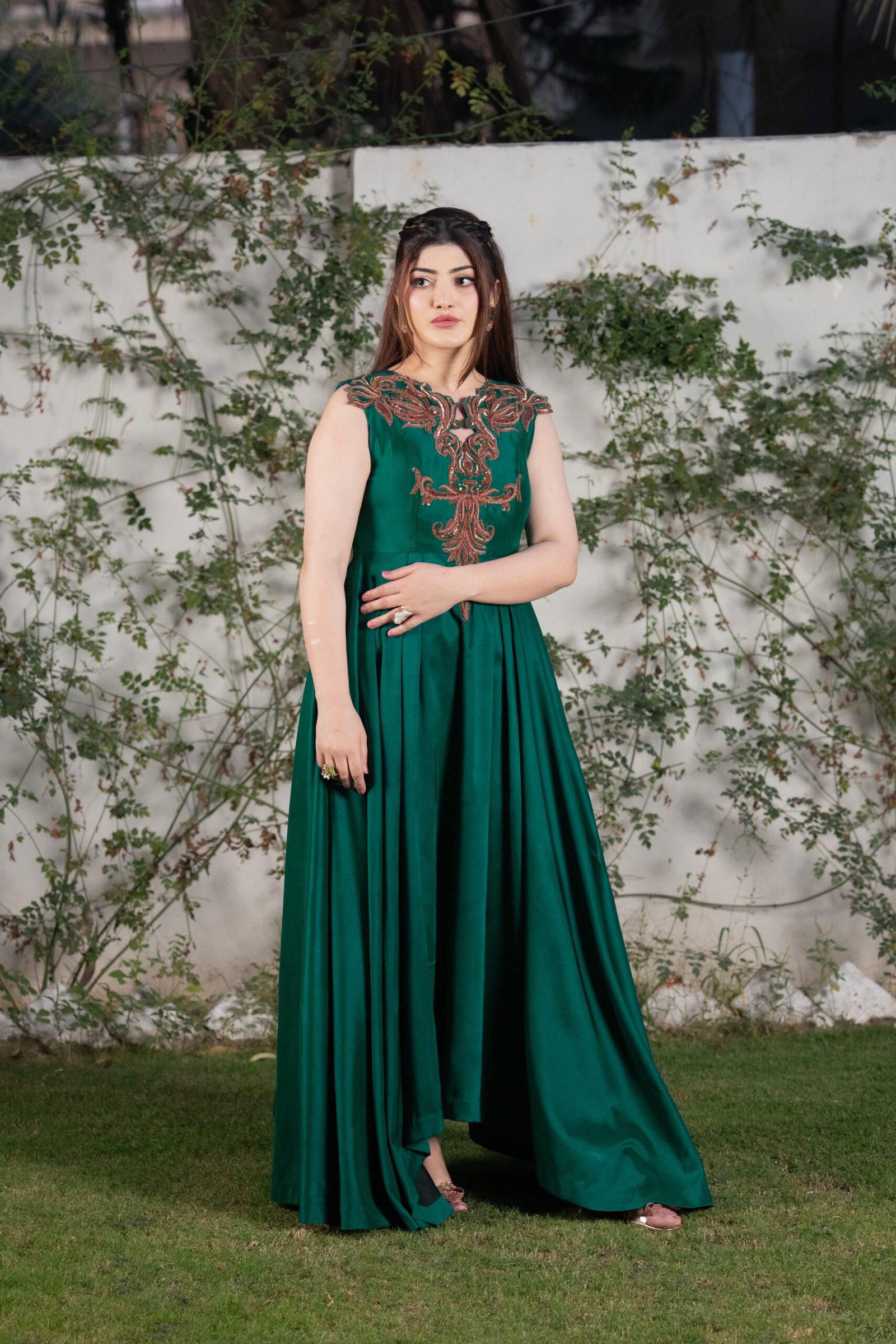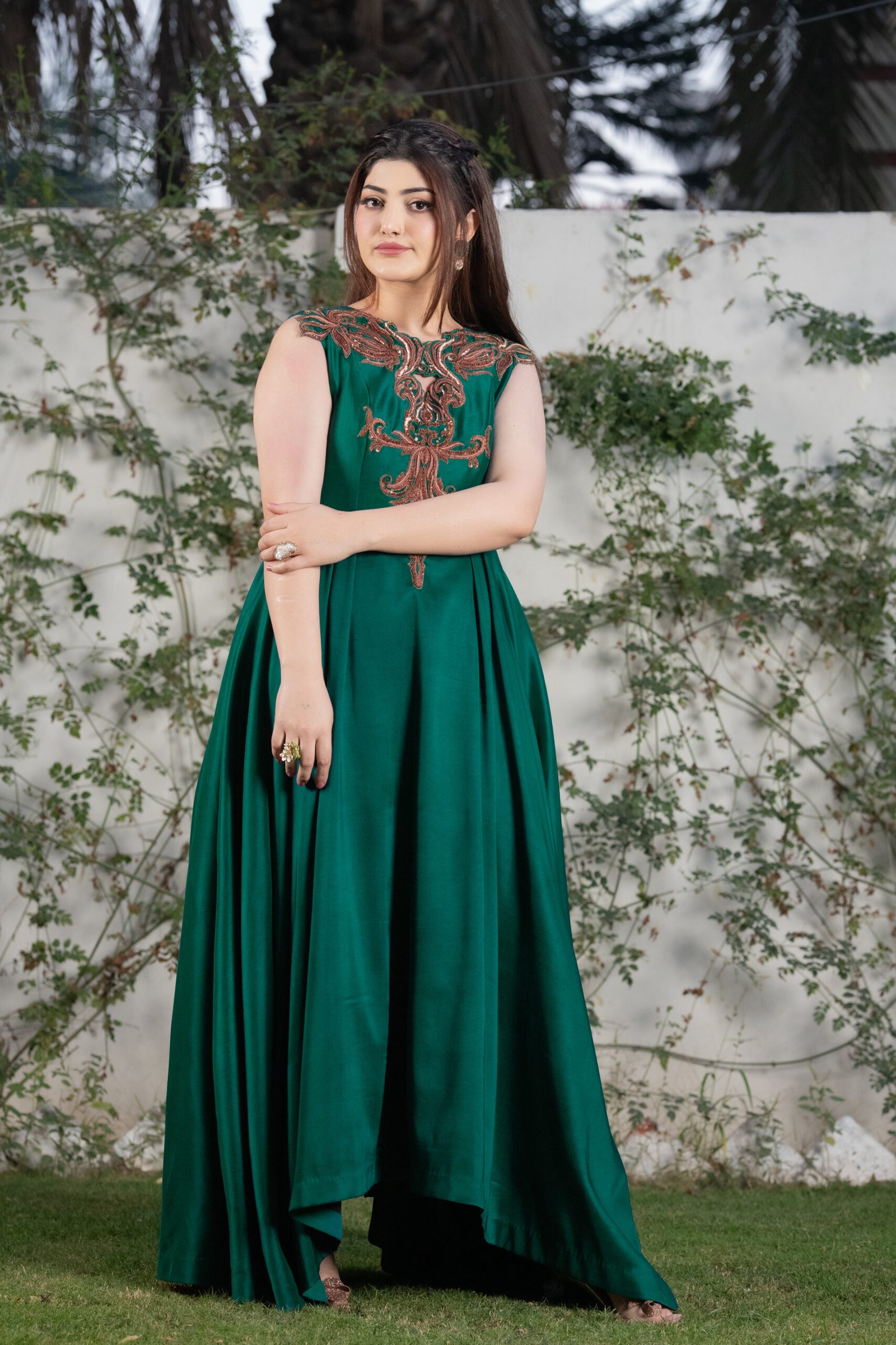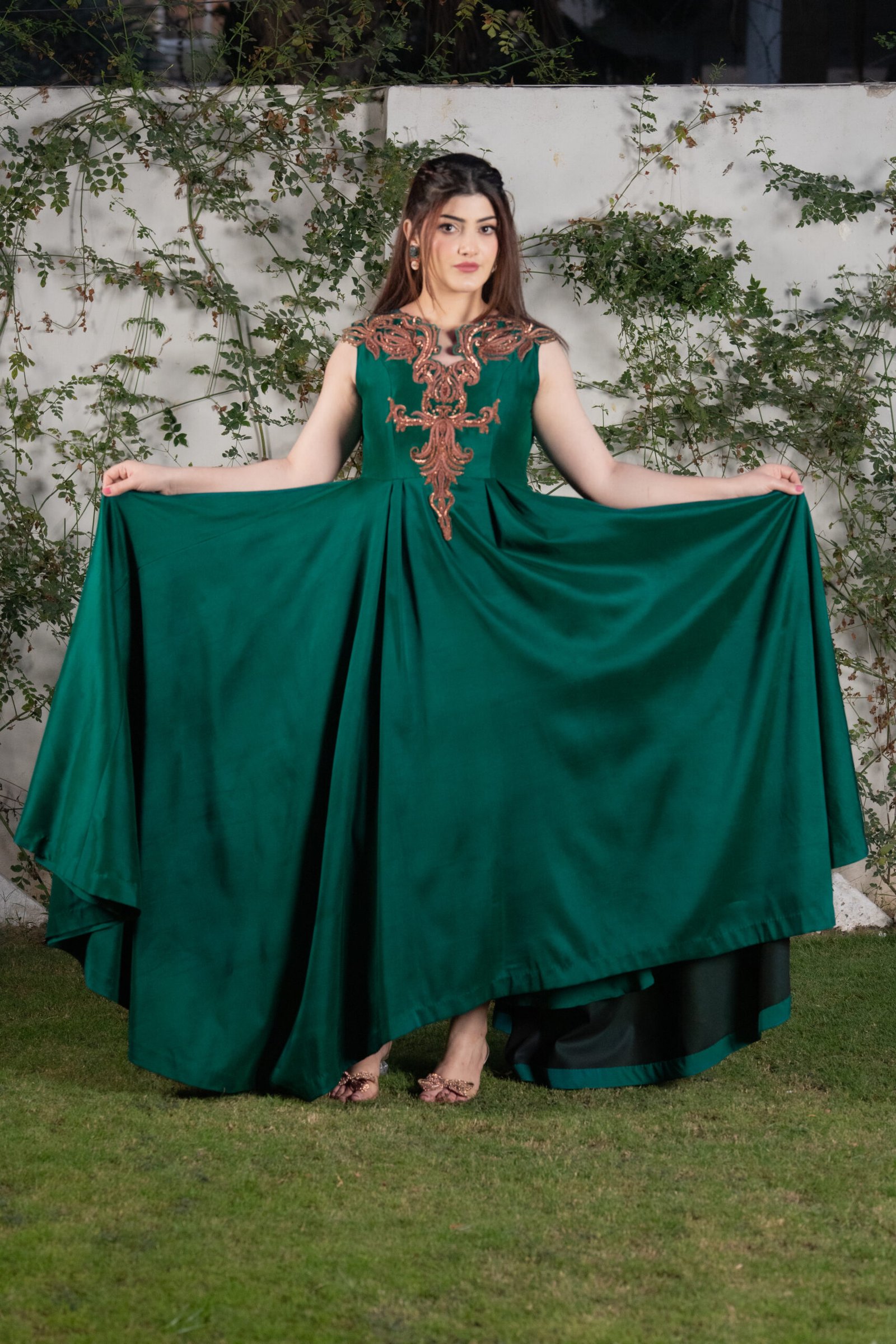 This one-piece green ensemble is crafted from luxurious sheesha silk, offering a smooth, flowing drape and a structured silhouette. The neckline and bodice feature detailed hand embroidery using resham, sequins, and moti, forming an ornate pattern that elevates the outfit with subtle shine and texture. The wide, voluminous flare adds movement and elegance, making it ideal for formal events and evening occasions.