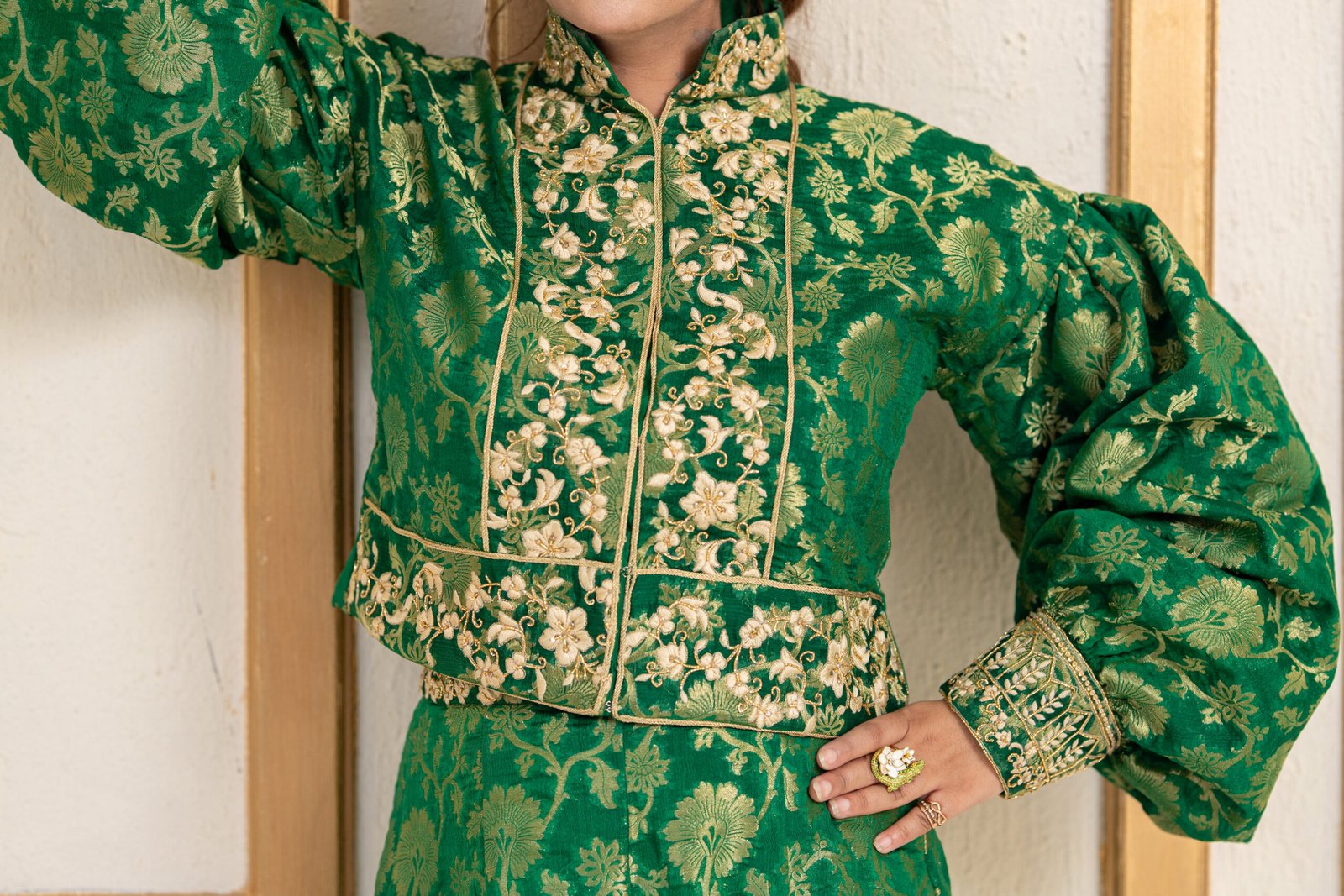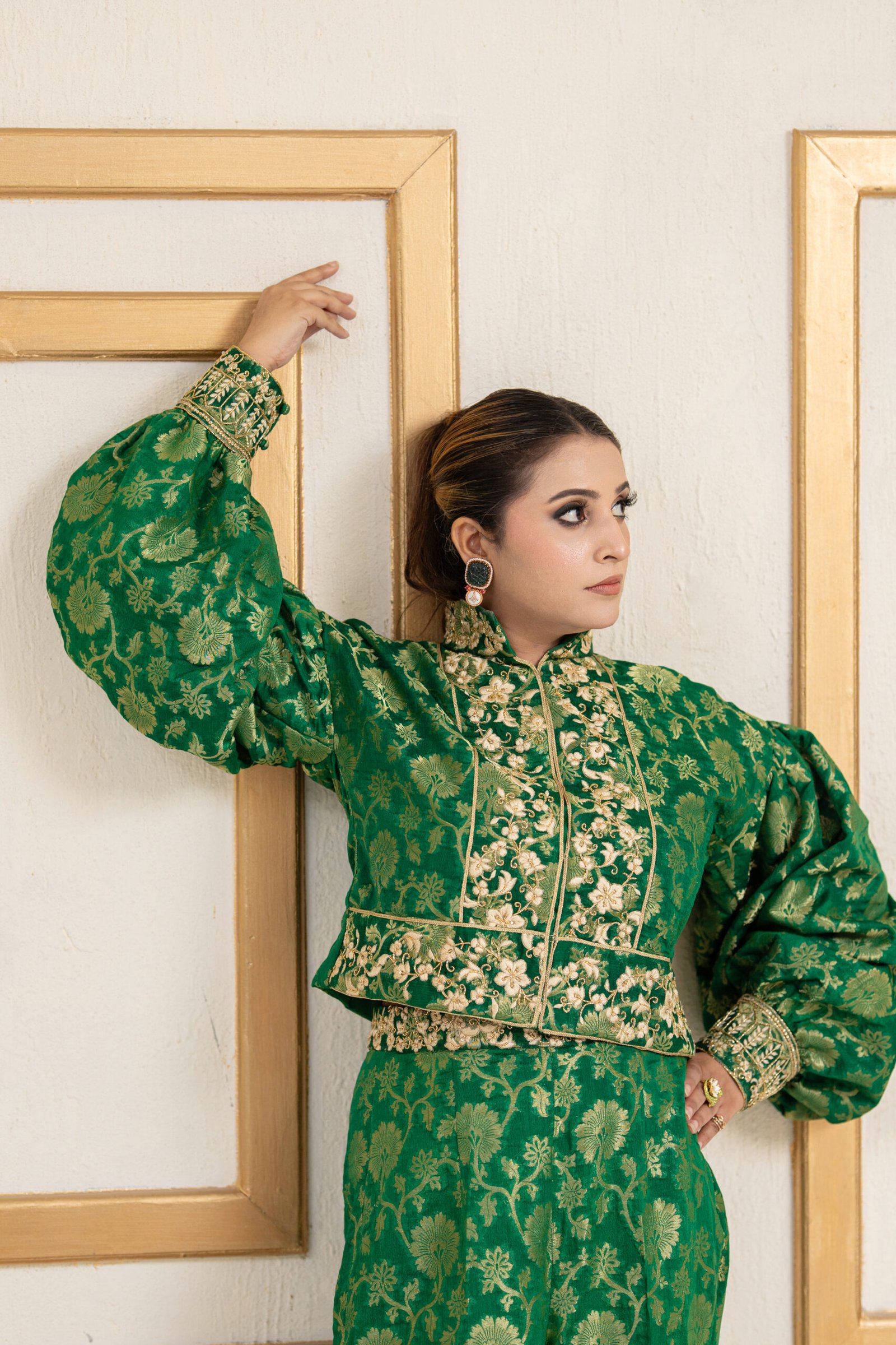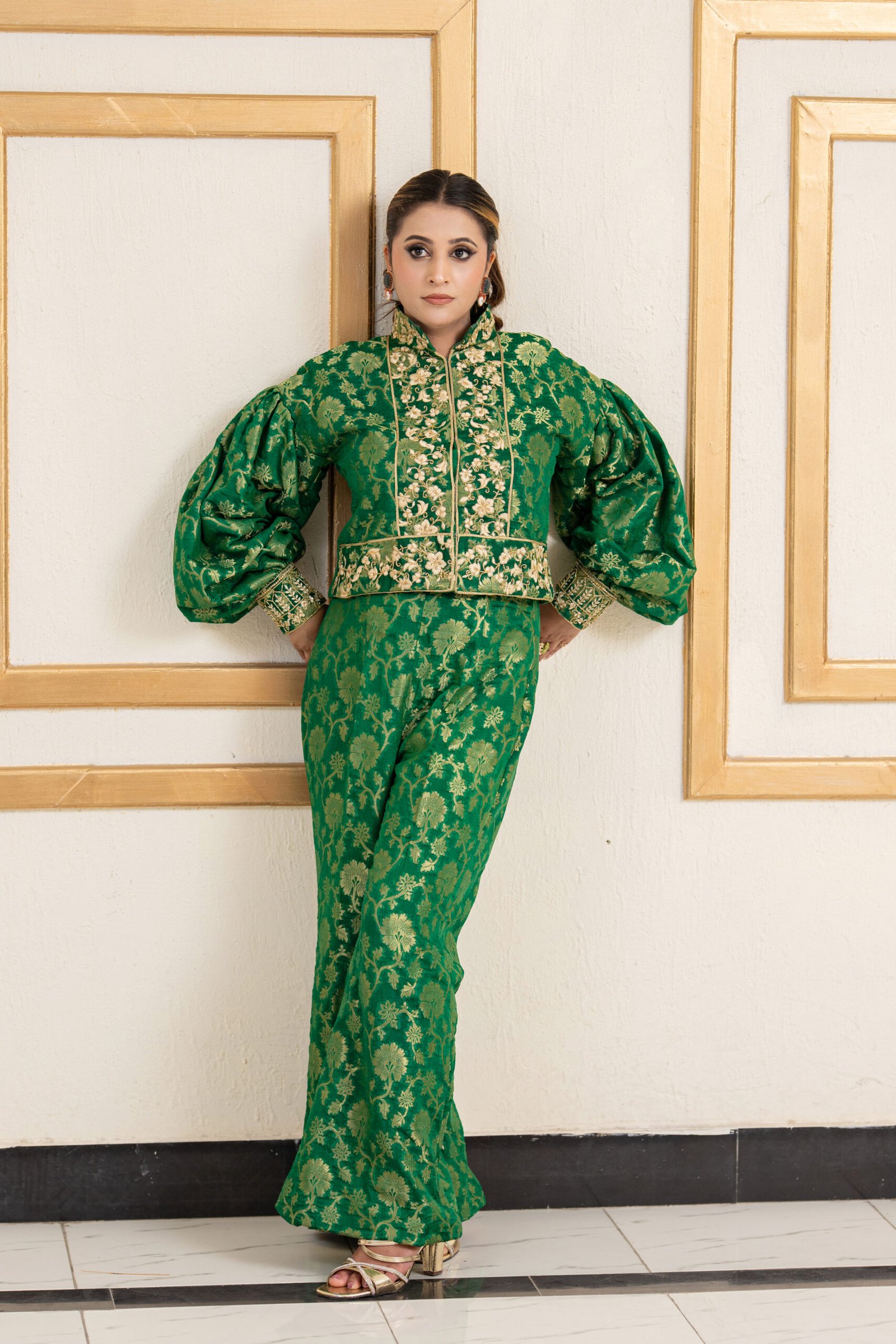 A striking two-piece in forest green jamawar, tailored with precision. The ensemble is enhanced with delicate machine embroidery and further elevated by hand embellishments of katdana and sequins, blending tradition with contemporary sophistication.