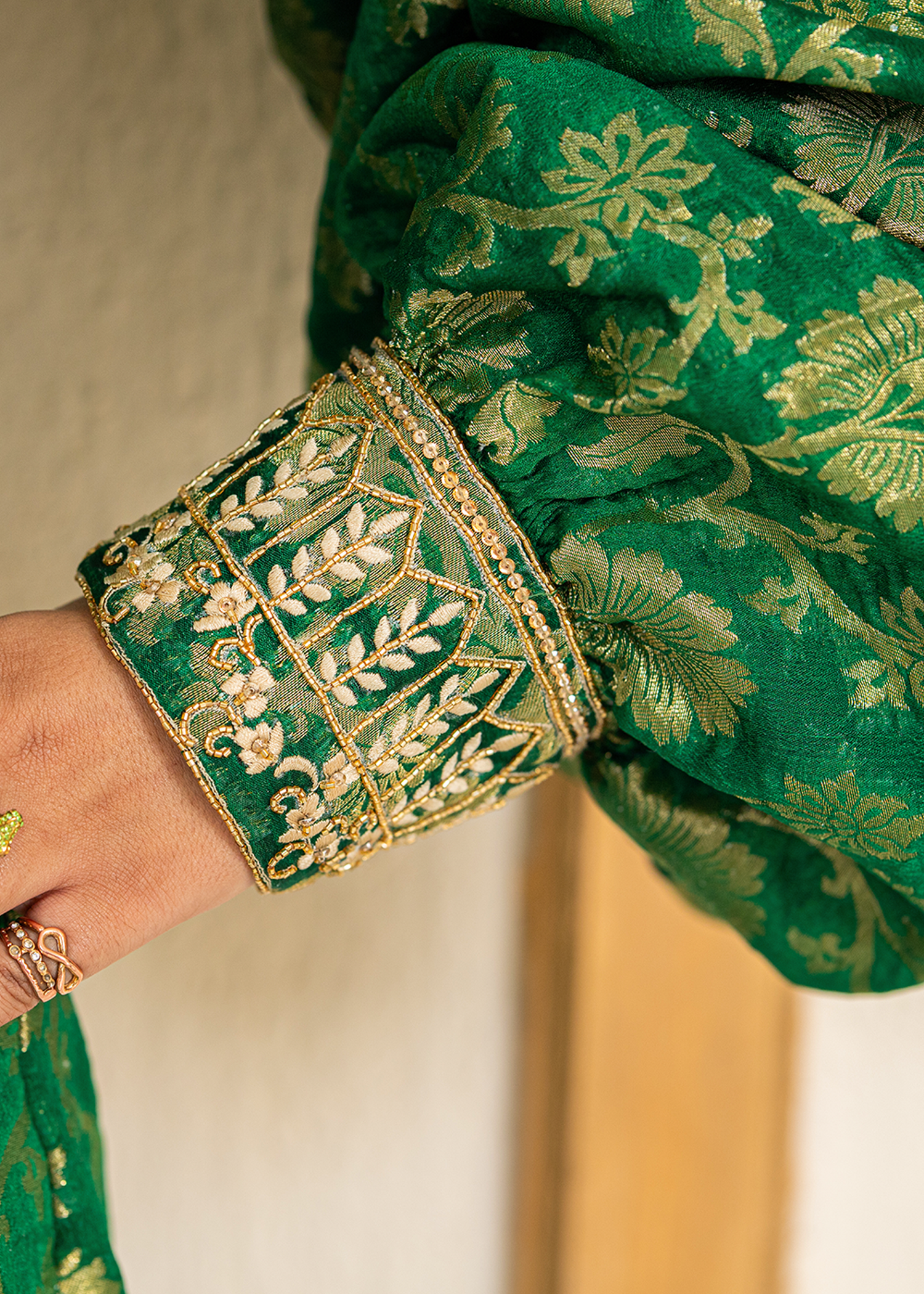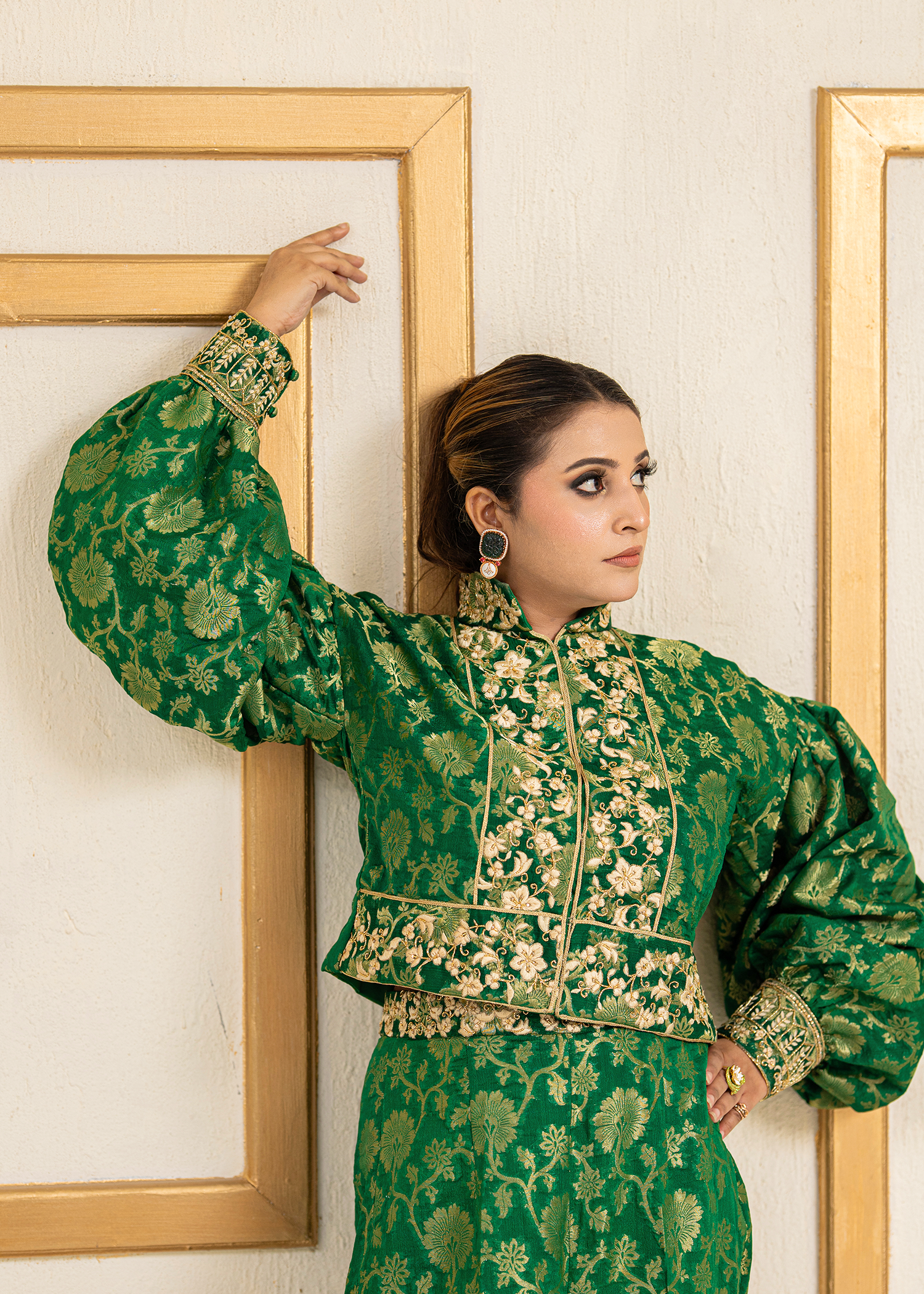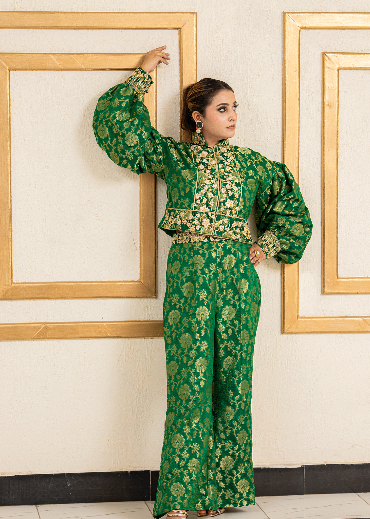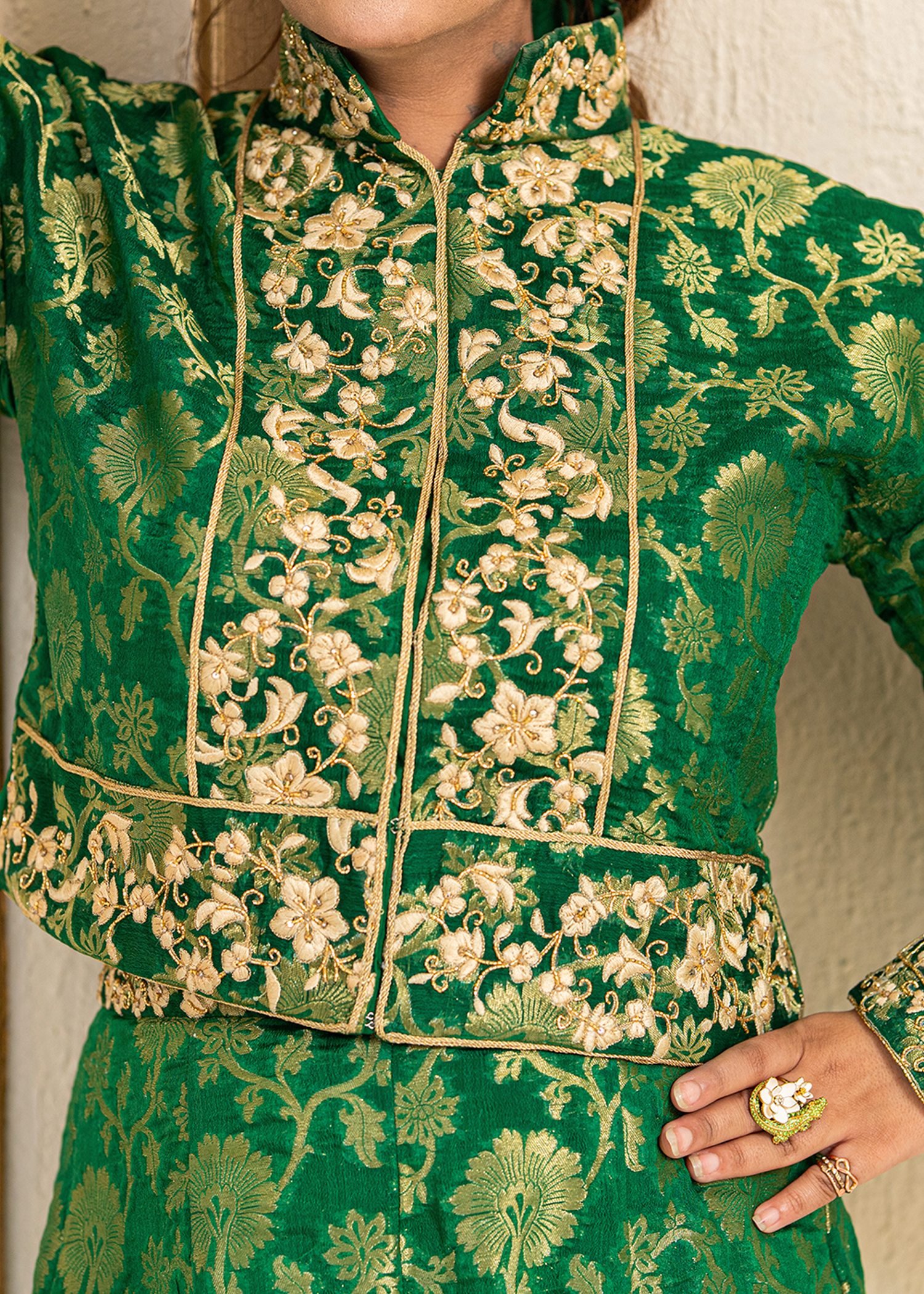 A striking two-piece in forest green jamawar, tailored with precision. The ensemble is enhanced with delicate machine embroidery and further elevated by hand embellishments of katdana and sequins, blending tradition with contemporary sophistication.