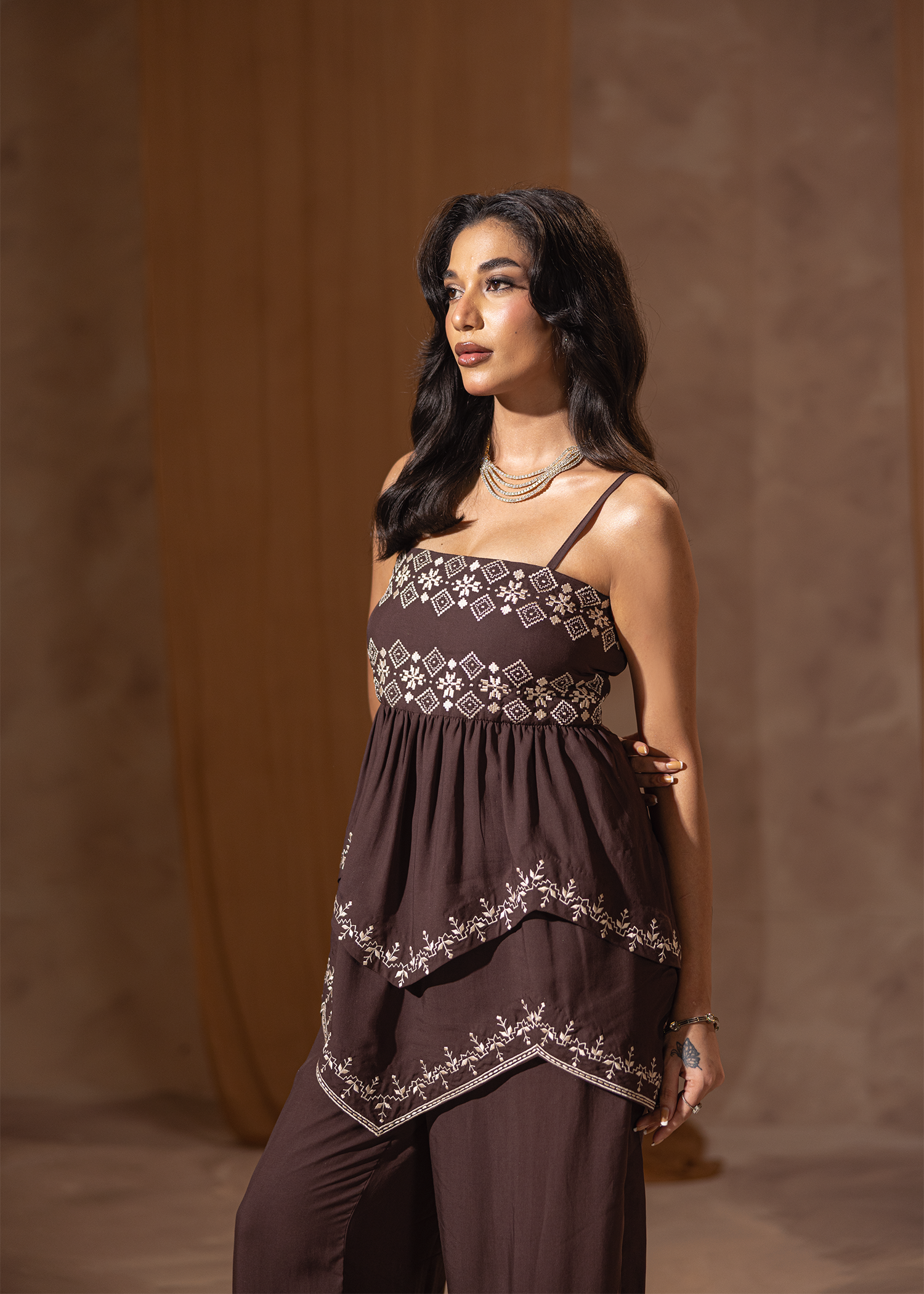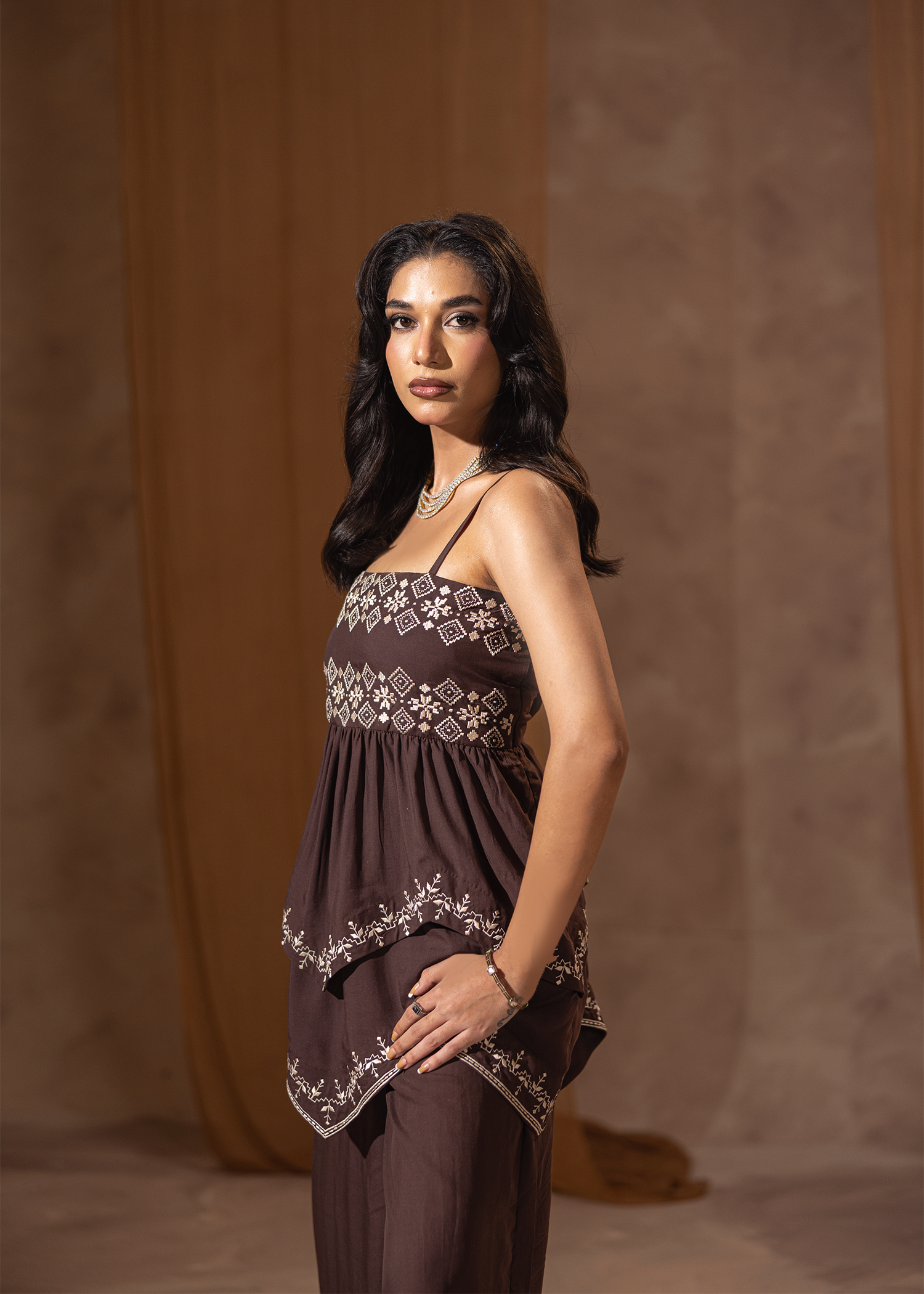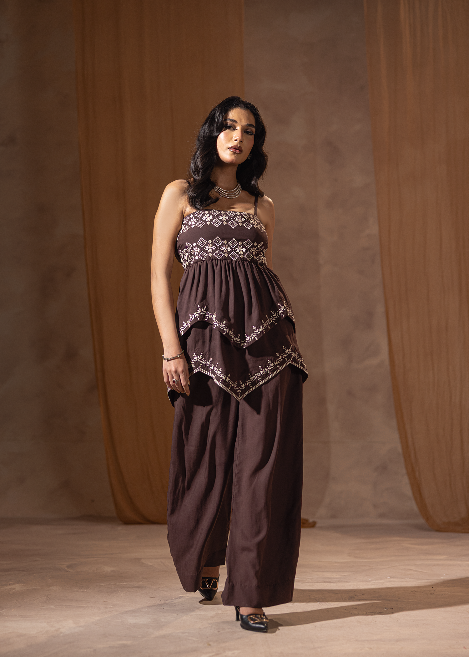 Two-piece set in rich dark brown Arabic linen, adorned with fine machine embroidery. The layered peplum-style top adds a touch of contemporary flair, paired with sleek trousers for an elegant yet modern silhouette. A refined choice for understated festive sophistication.