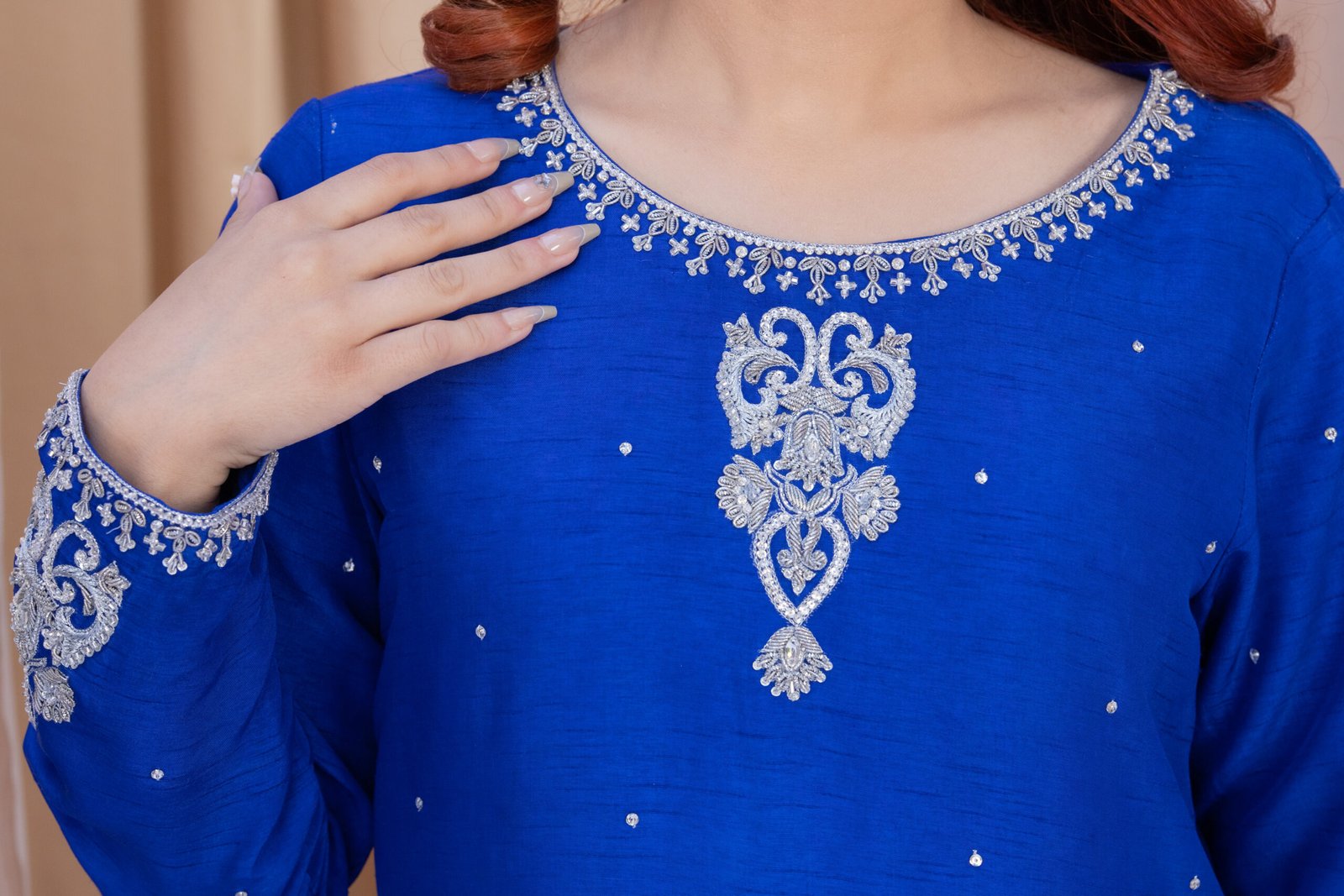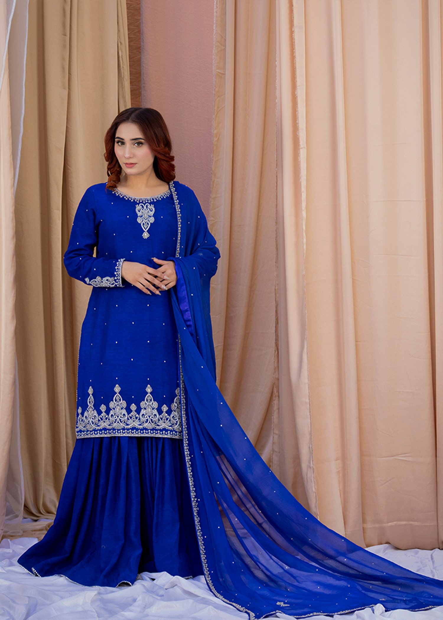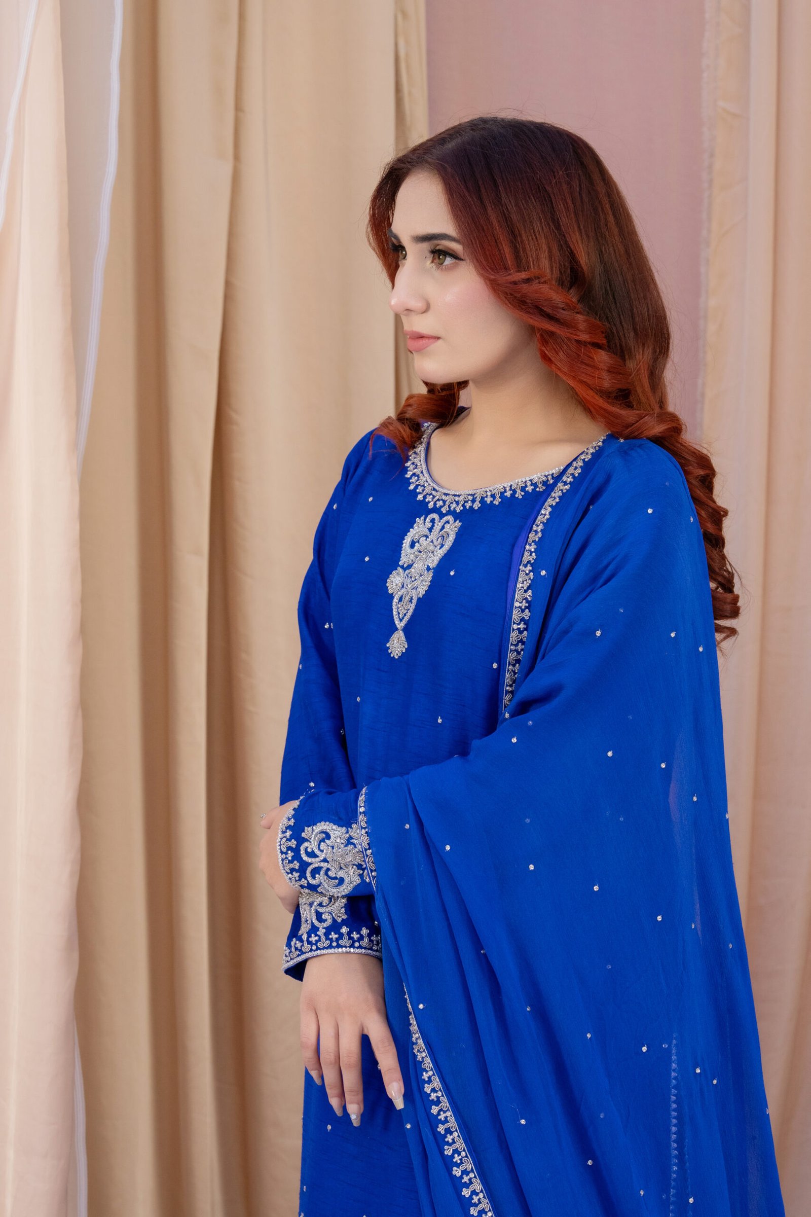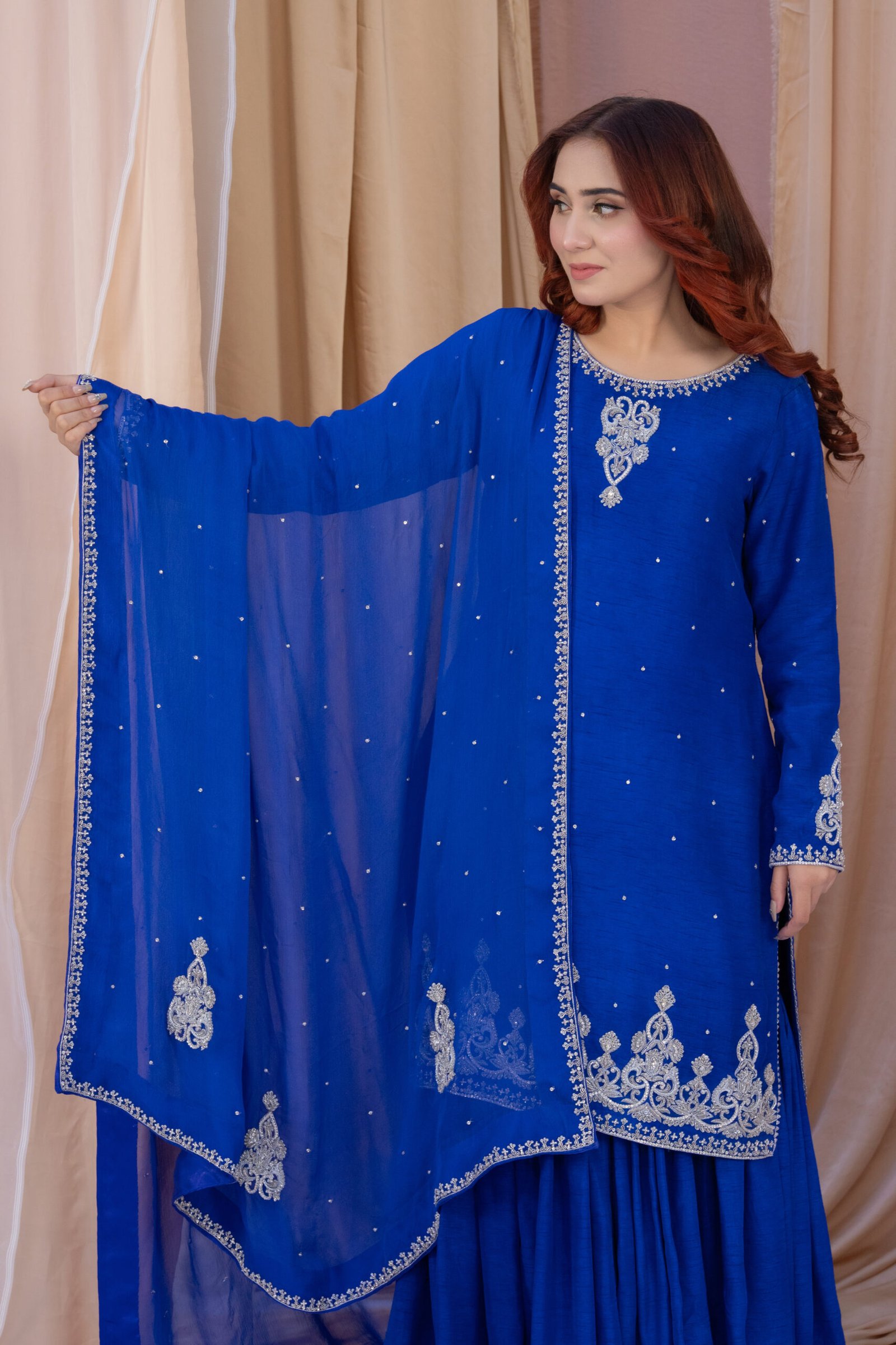This three-piece set in blueberry blue blends Koren silk with a soft chiffon dupatta for a refined, elegant look. The shirt features delicate hand embroidery with dhabka, katdana, sequins, and stones, adding subtle sparkle along the neckline, sleeves, and hem. The coordinated dupatta carries light embellishment along the borders, completing the outfit with a polished finish.