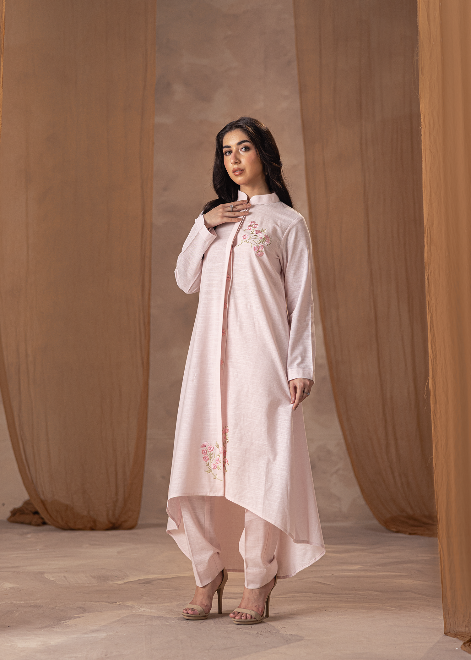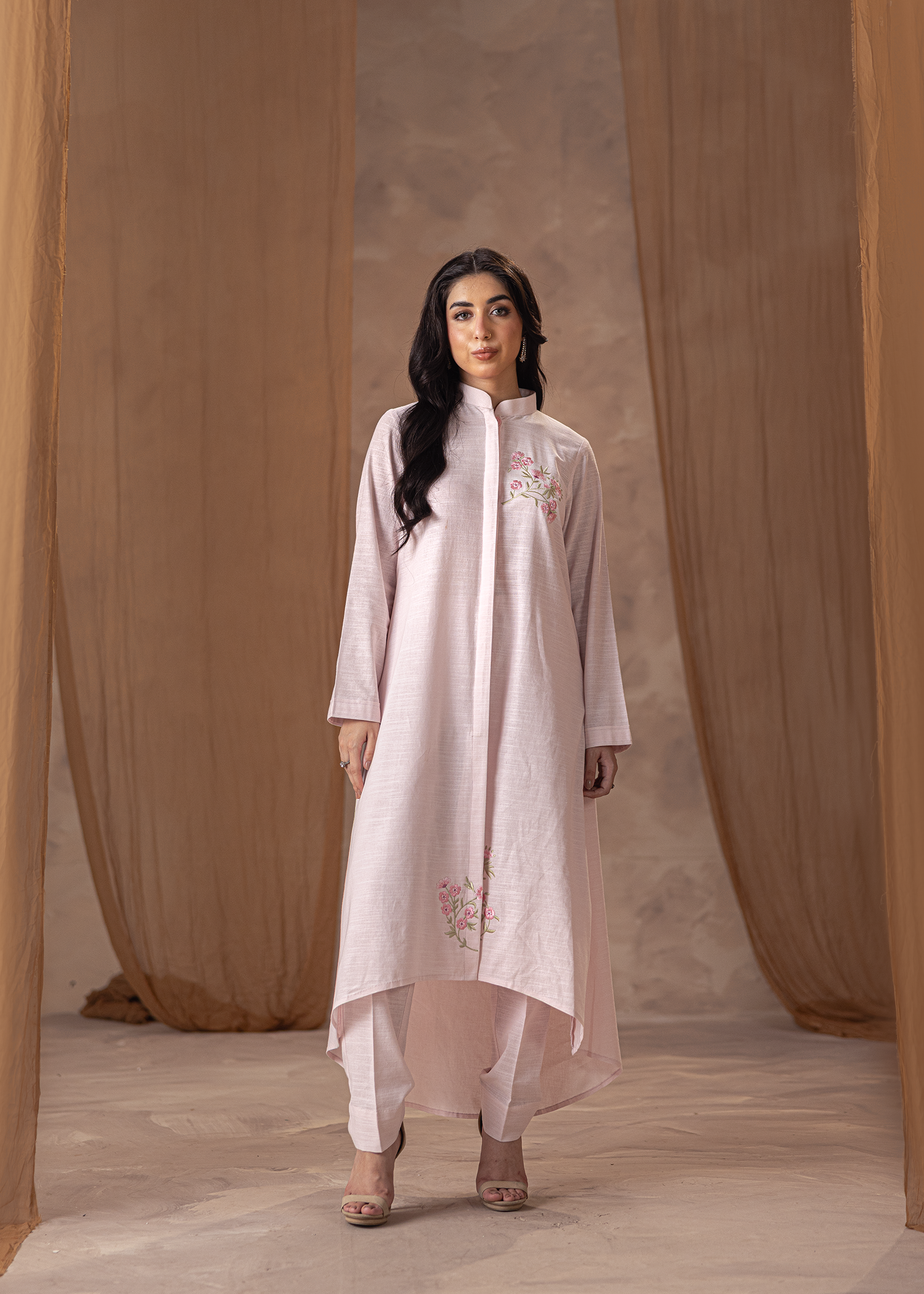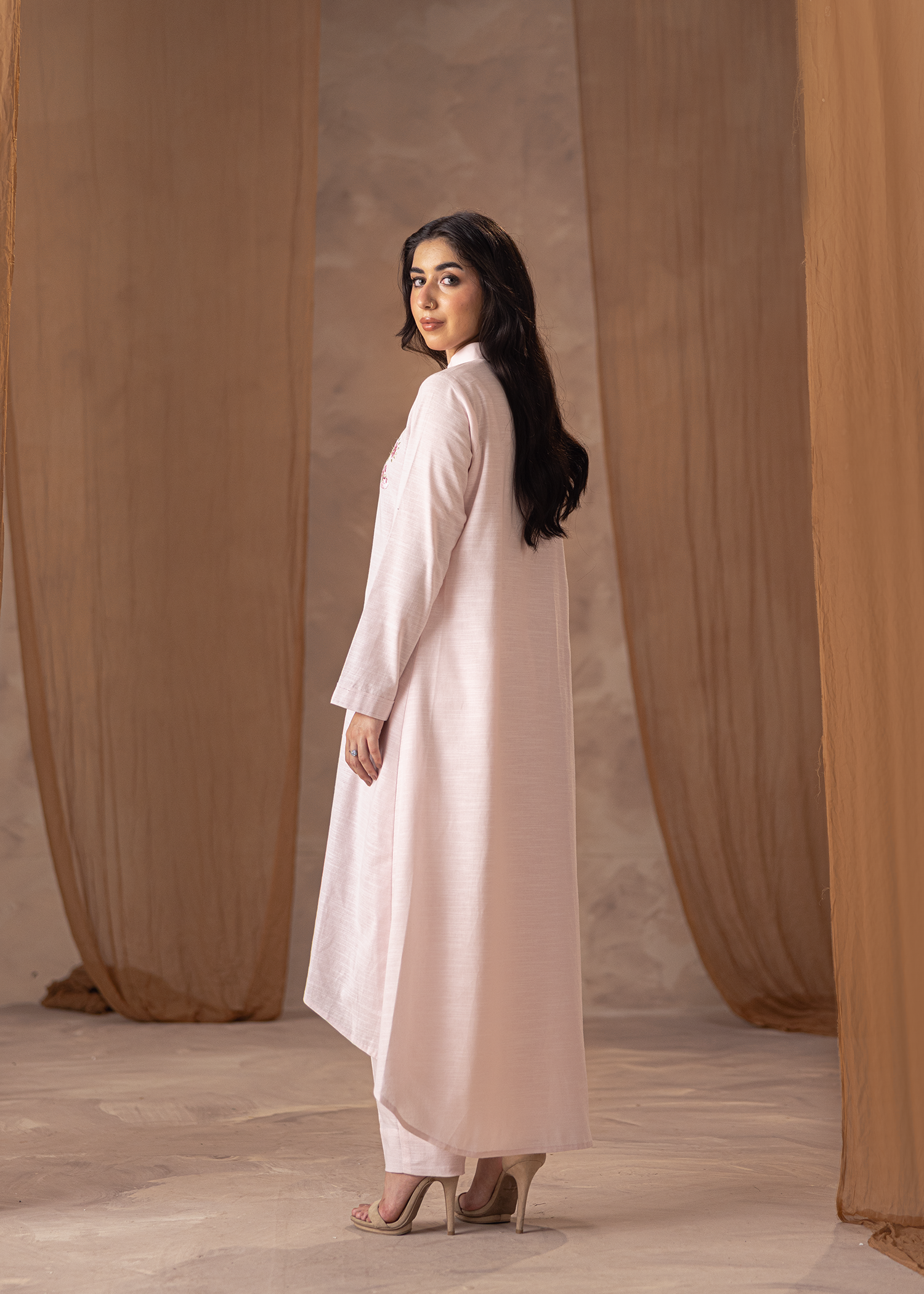 A two-piece set in blush pink khaddar, detailed with delicate machine embroidery. Minimal yet refined, it reflects graceful modest wear with timeless appeal.