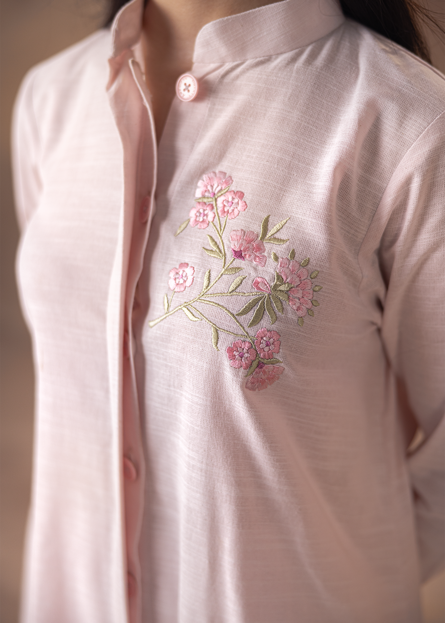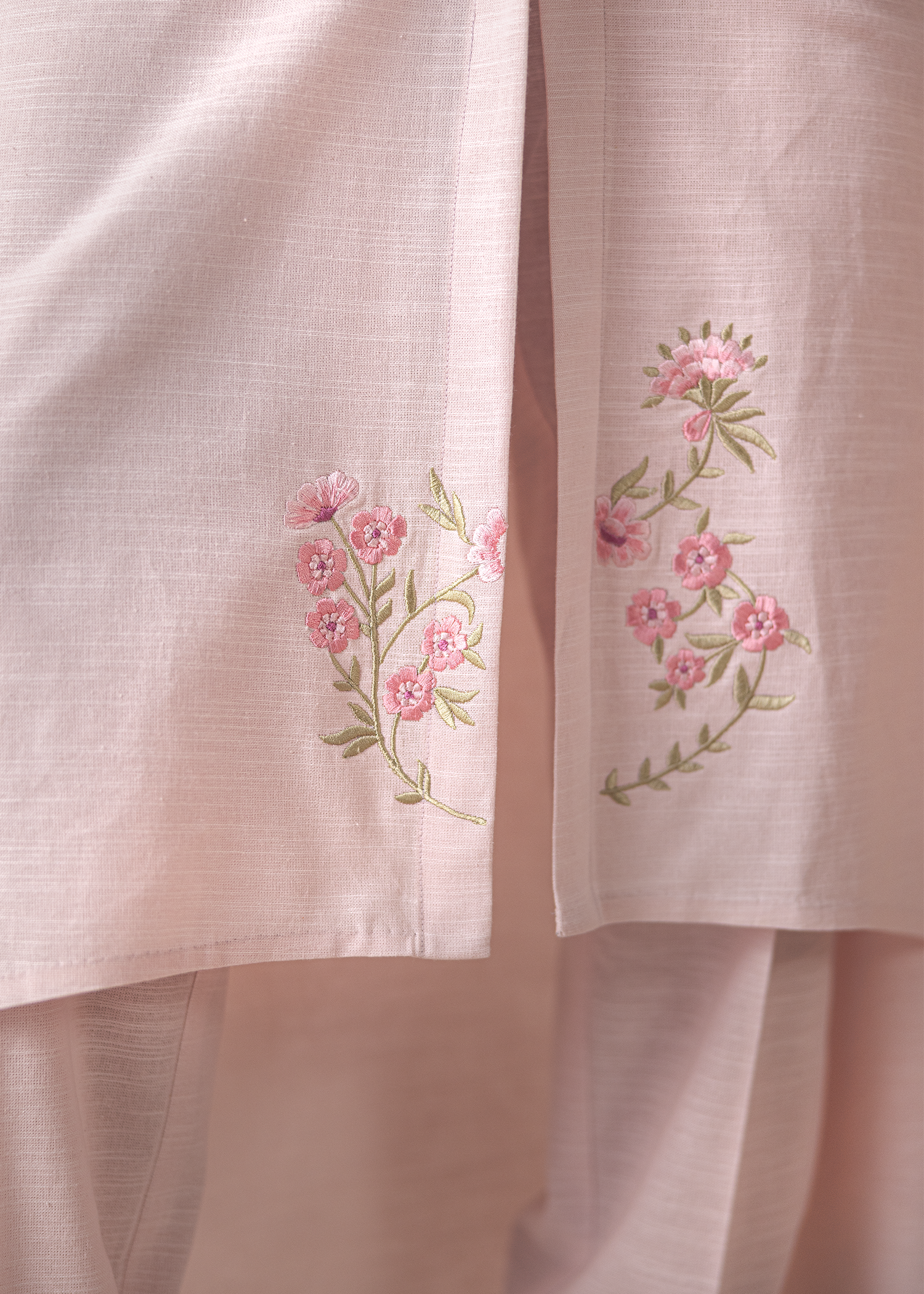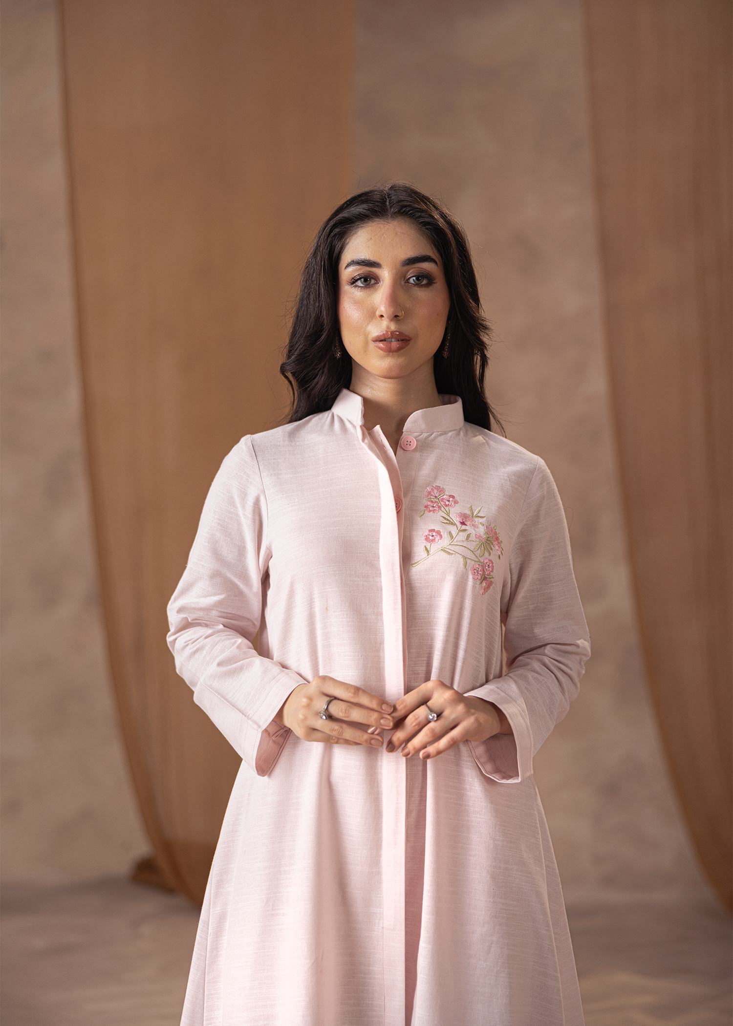 A two-piece set in blush pink khaddar, detailed with delicate machine embroidery. Minimal yet refined, it reflects graceful modest wear with timeless appeal.