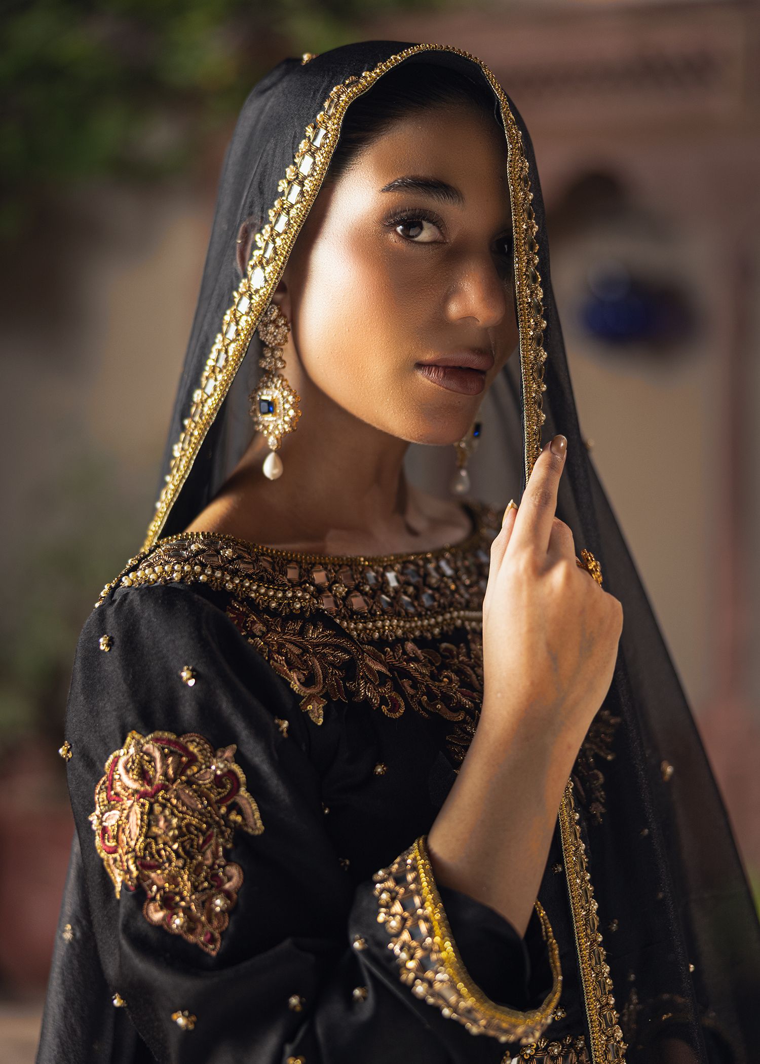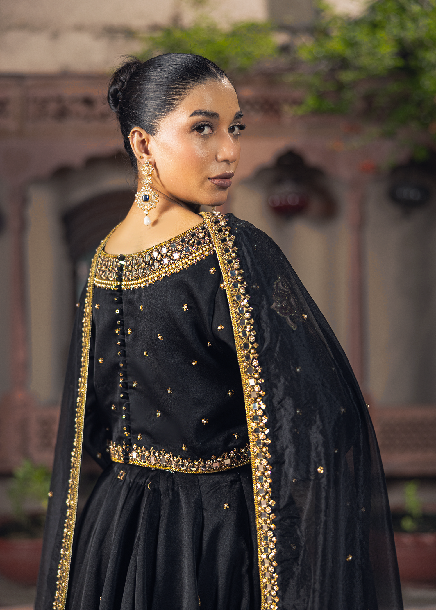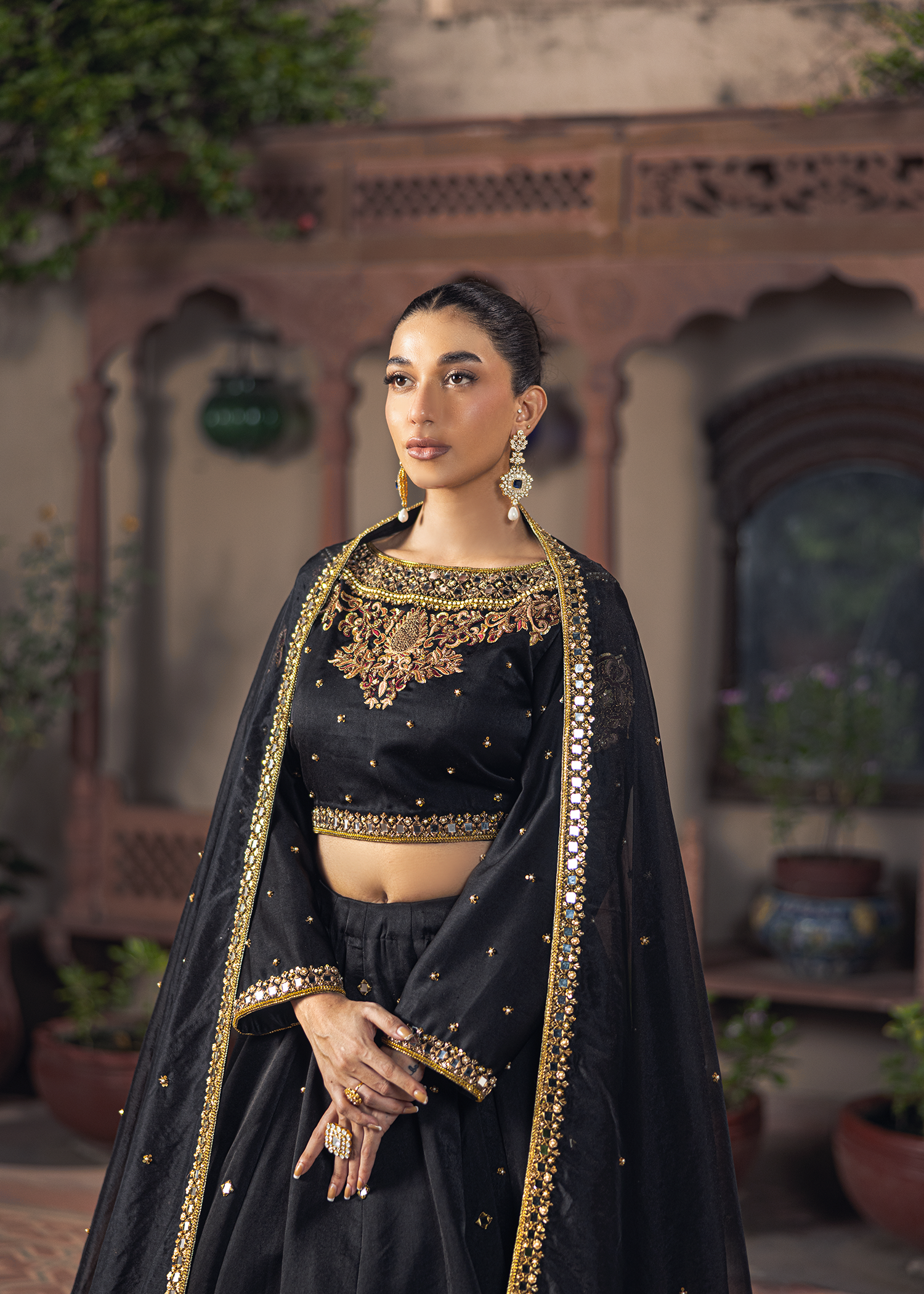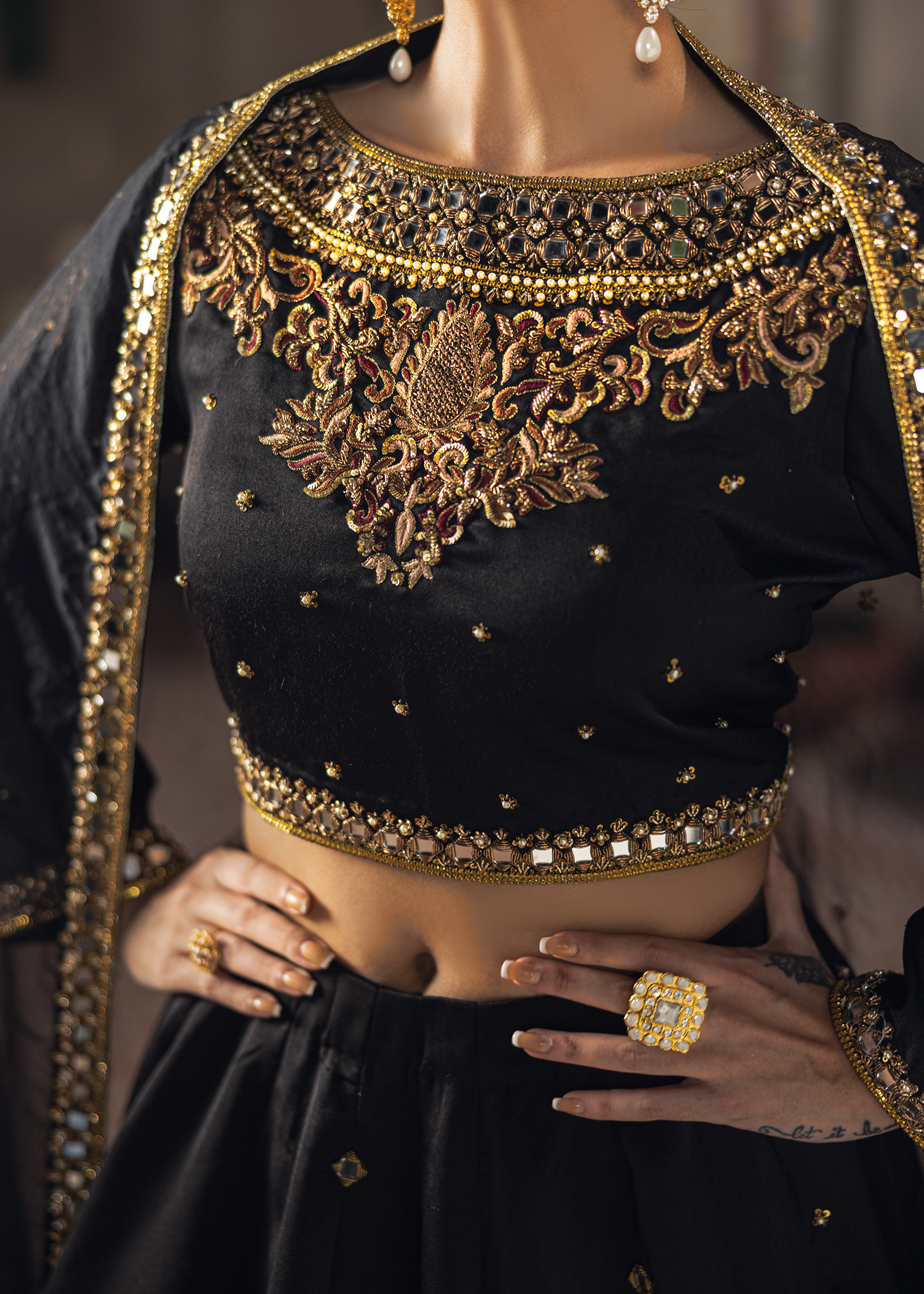 A three-piece set in jet black velvet silk with organza. The blouse and lehenga are enriched with mirror and zardozi embellishments, while the dupatta carries a finely detailed border, creating a statement of timeless elegance with contemporary allure.