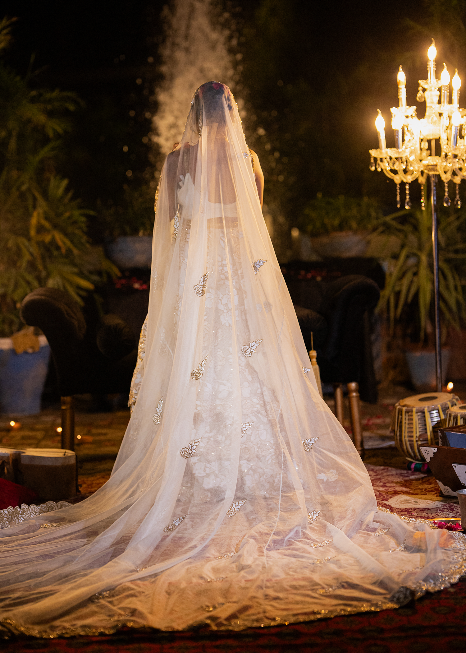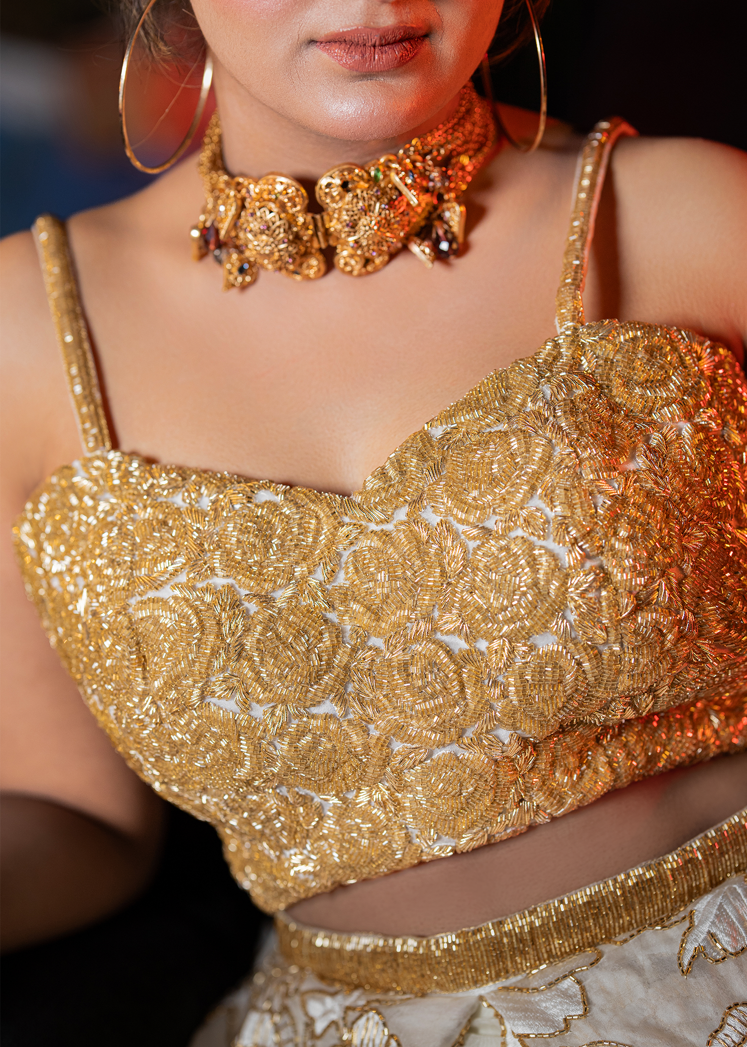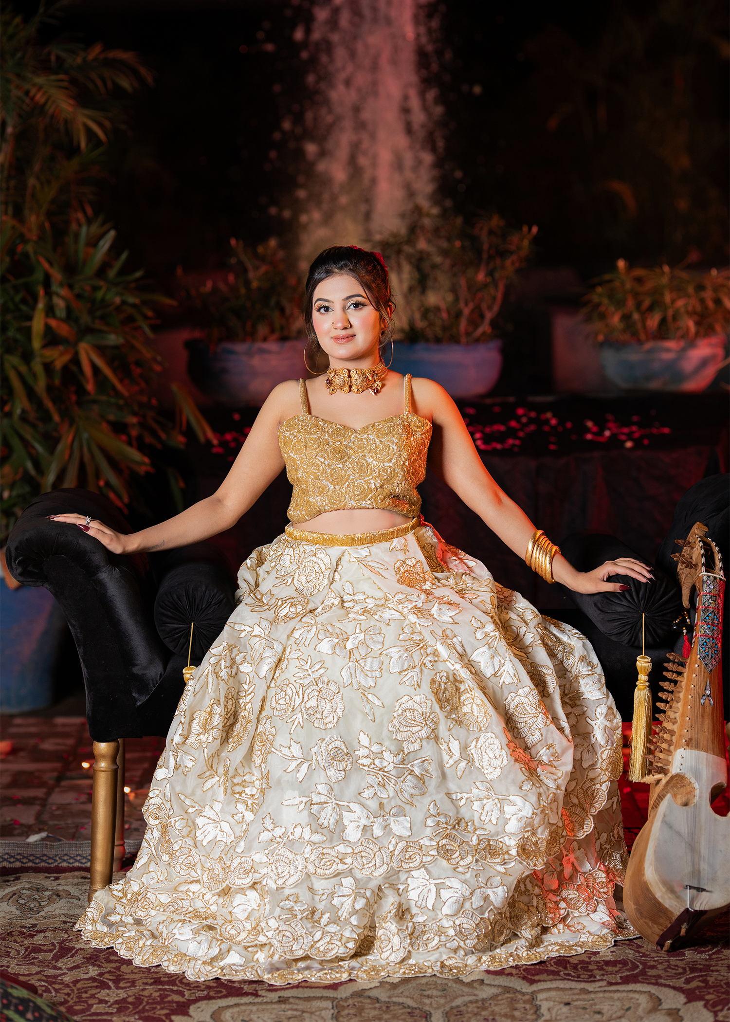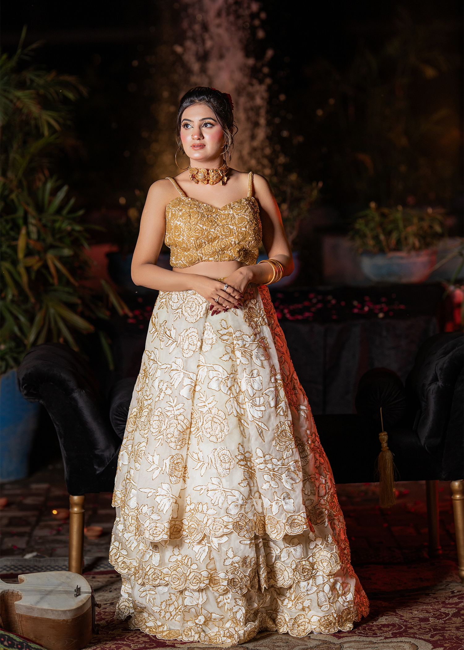 An exquisite four-piece complete masterpiece in ivory organza fabric, with long veil dupatta, stylish blouse, three layer heavy lehnga, and churidar pajama crafted with machine embroidery and meticulously embellished with cutdana. The floral patterns add a regal charm, blending tradition with contemporary finesse, a timeless silhouette for those who appreciate understated opulence.