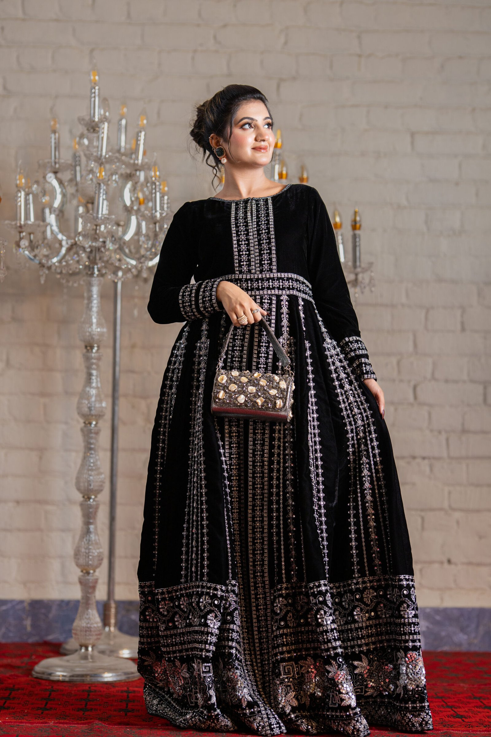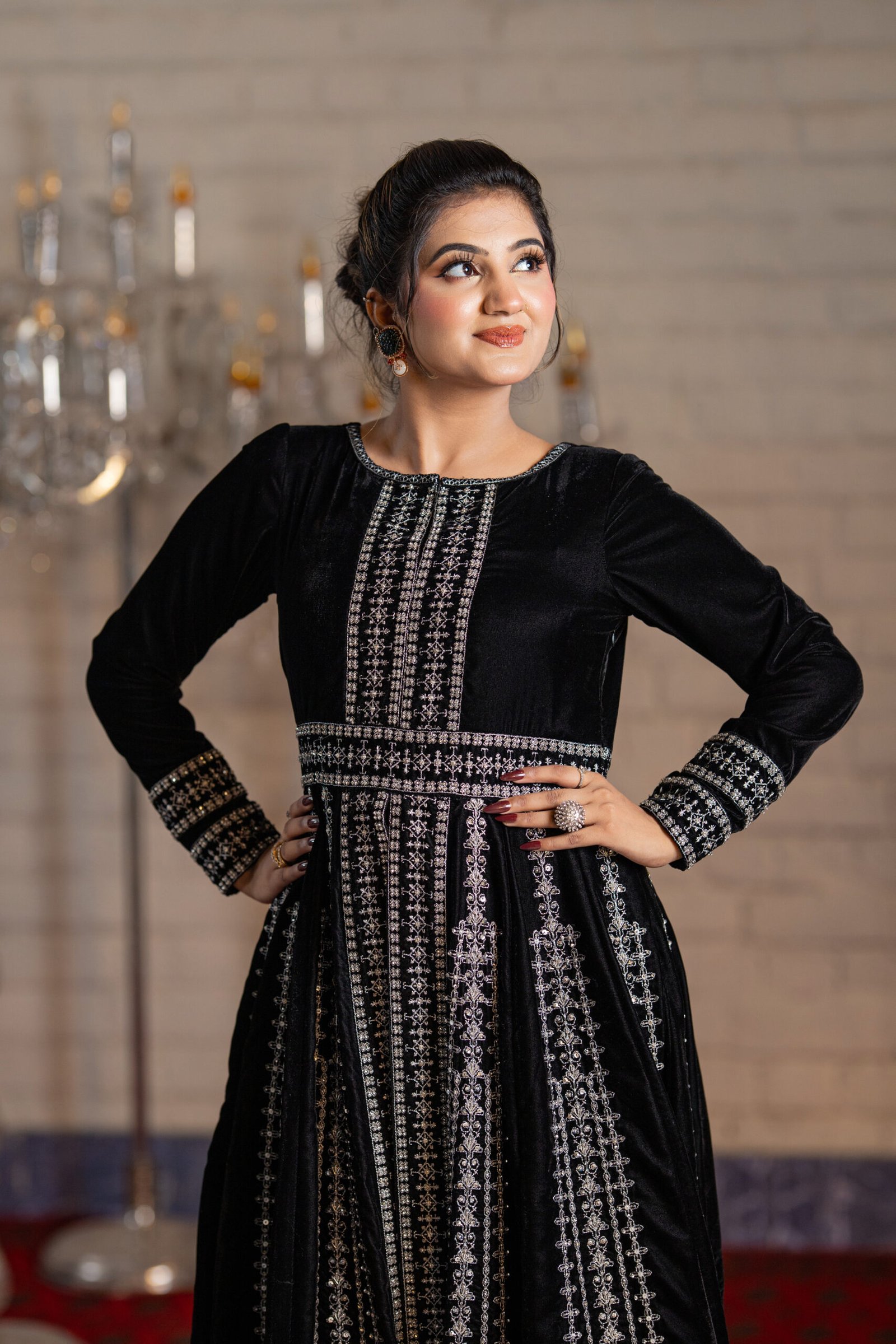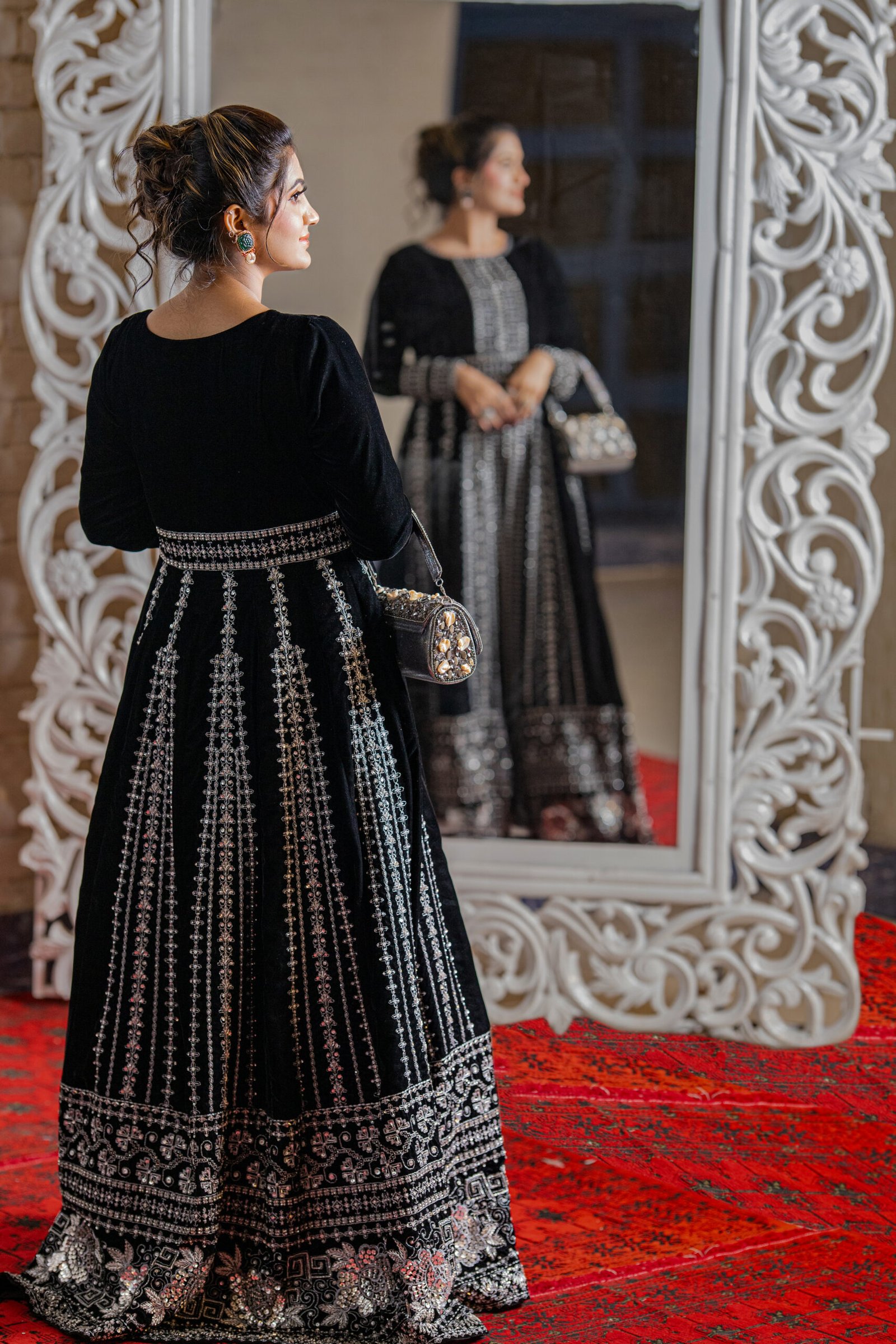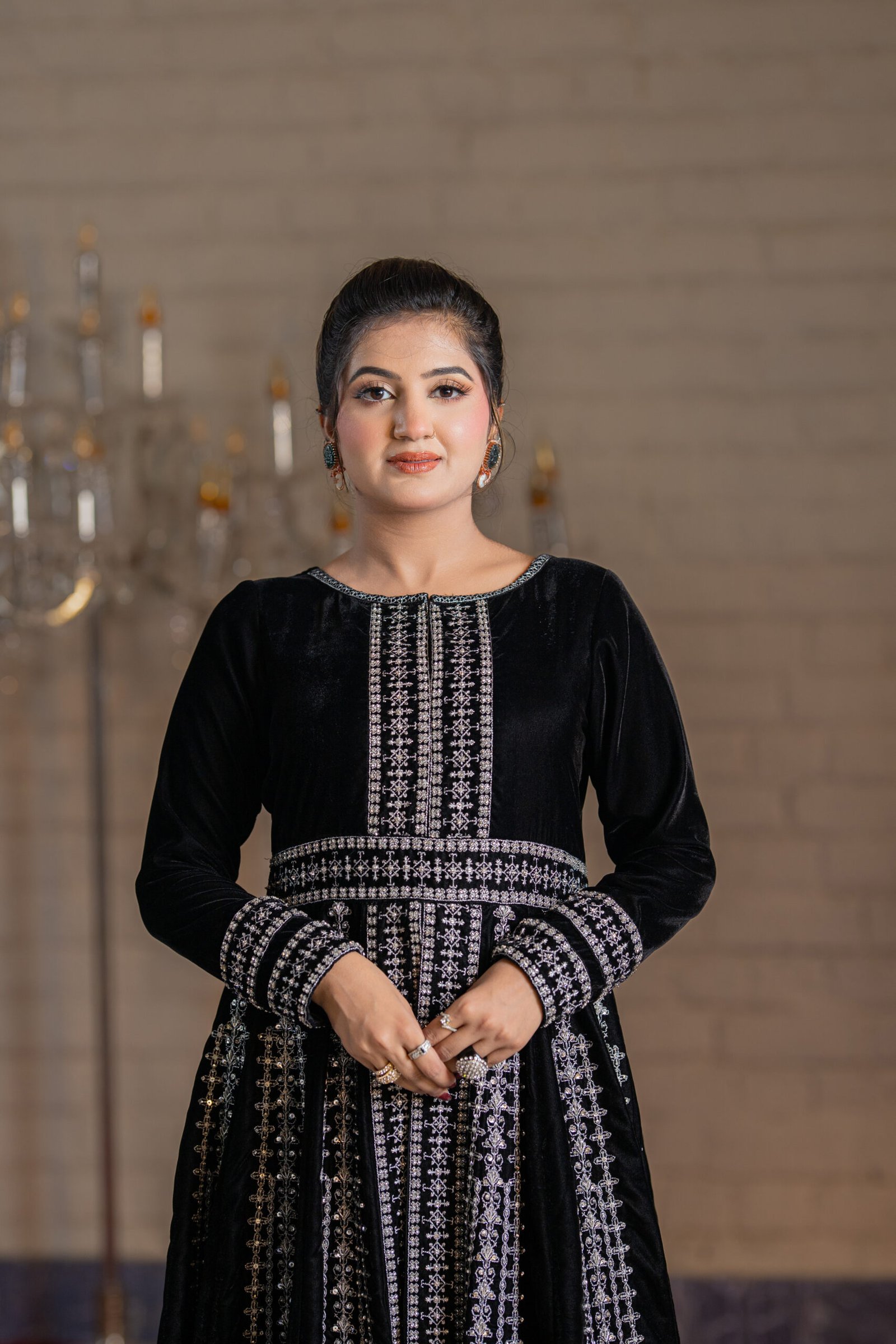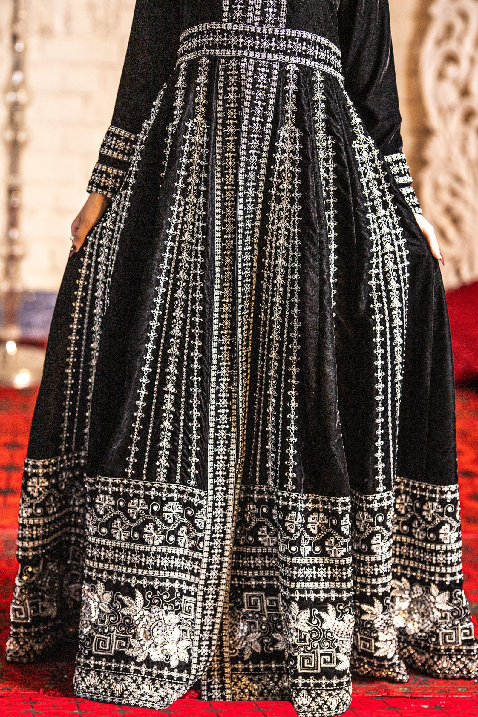 An exquisite one-piece masterpiece in black phoenix velvet, crafted with signature machine embroidery and meticulously embellished with Swarovski, sequins, and katdana. The geometric patterns add a regal charm, blending tradition with contemporary finesse, a timeless silhouette for those who appreciate understated opulence.