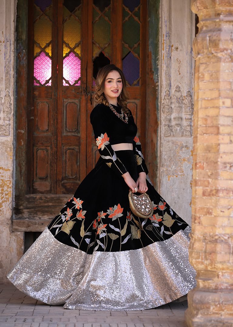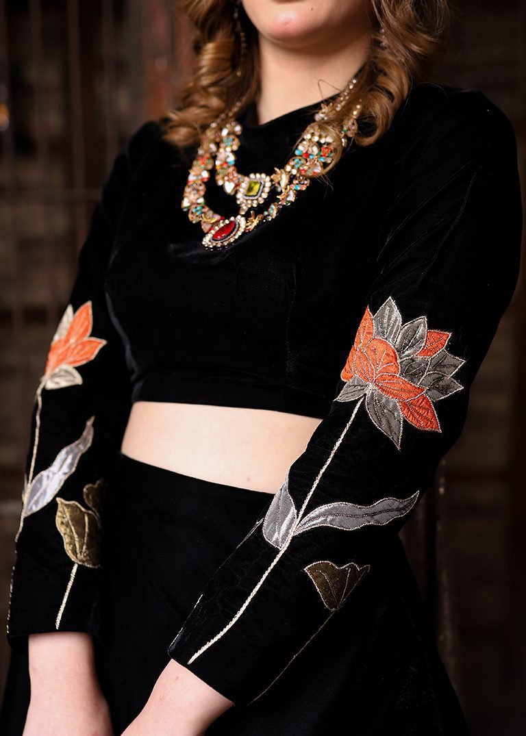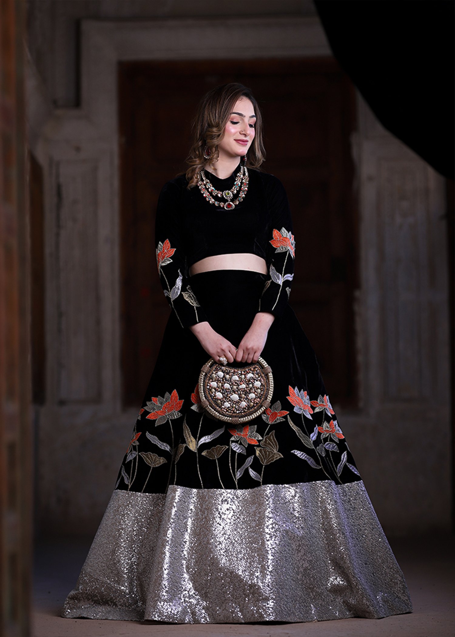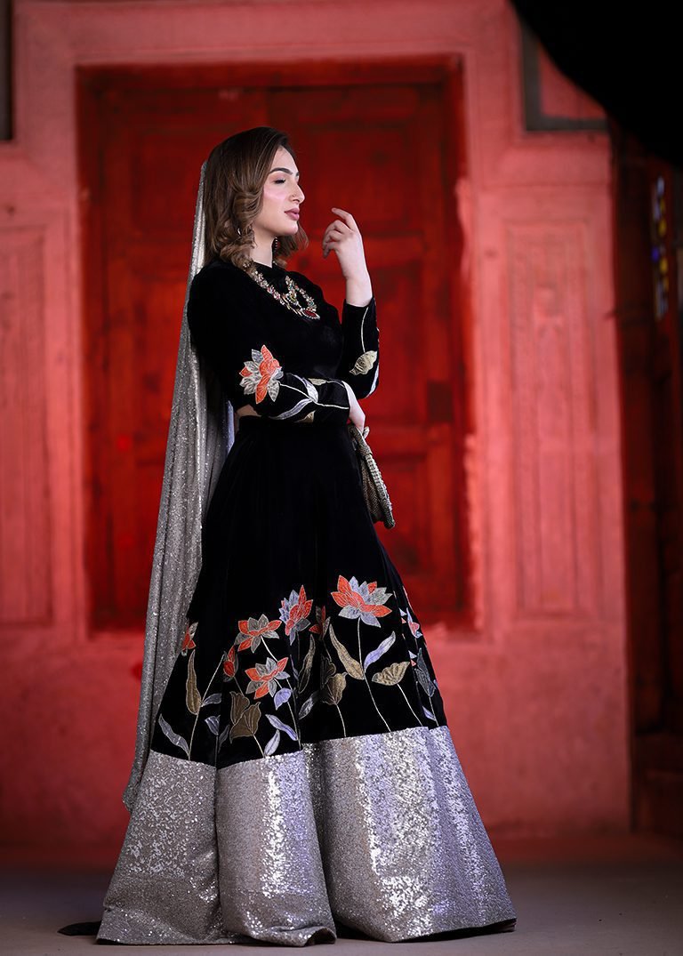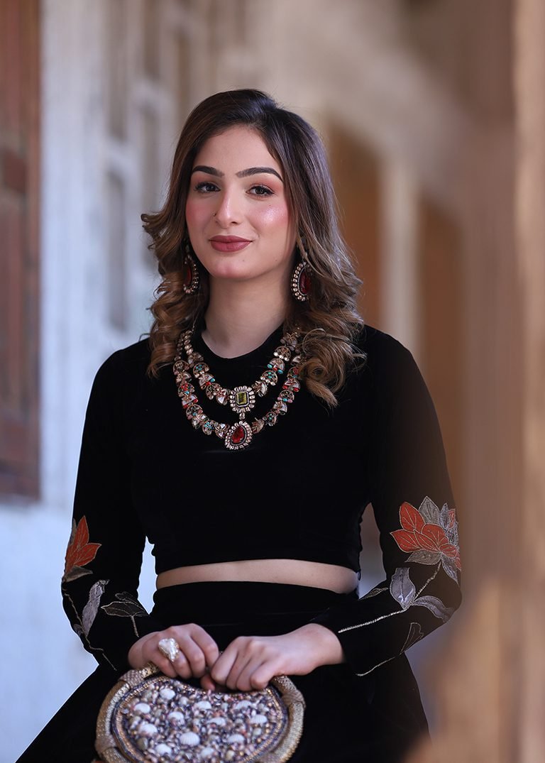 Crafted in rich black tones, this three-piece ensemble combines appliqué detailing on tissue fabric with velvet and sequin elements. The result is a refined silhouette that feels elegant without being overstated.