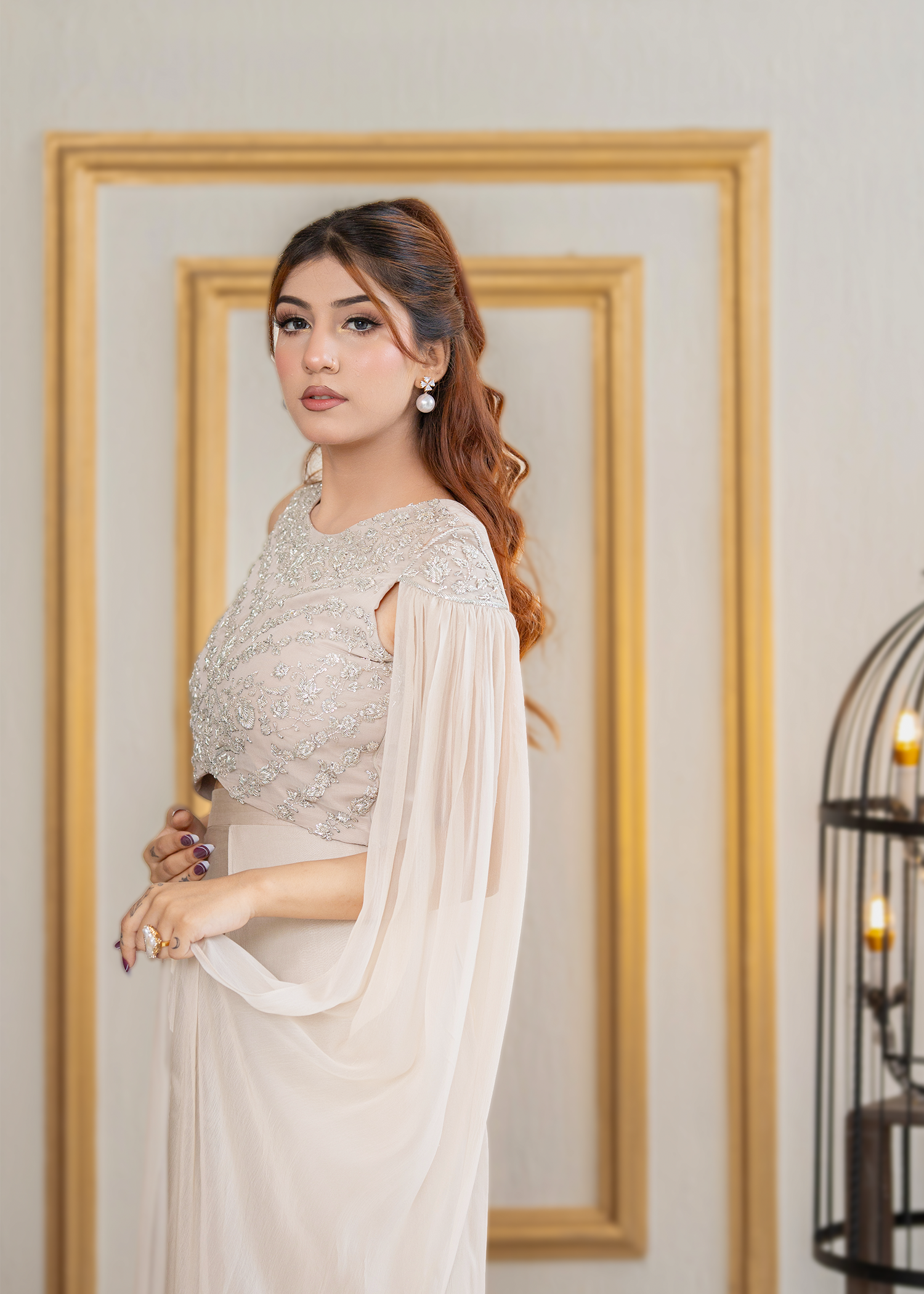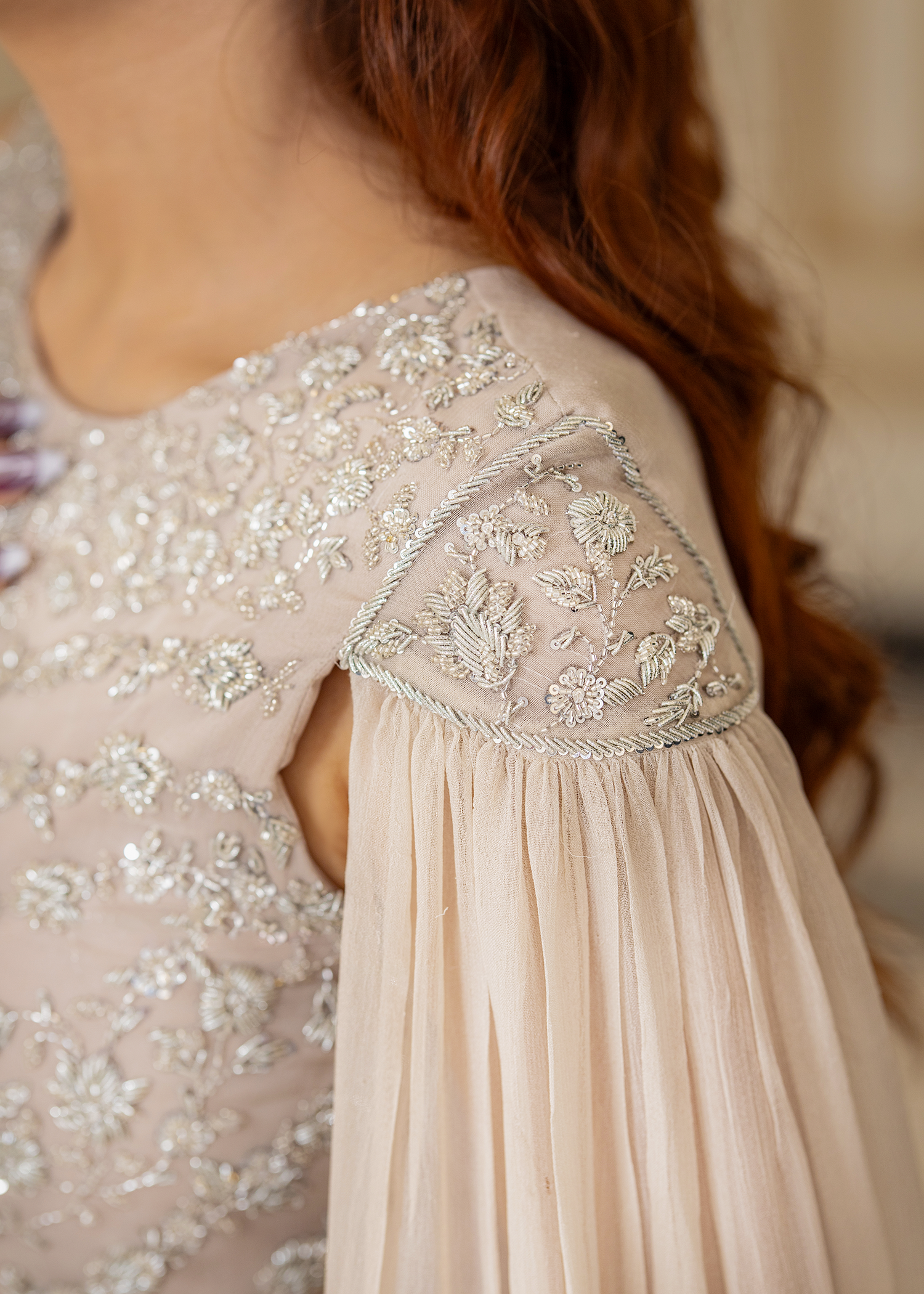 A refined two-piece in silk grey, tailored from pure chiffon and sheesha silk. Accented with intricate hand embroidery, this ensemble embodies quiet sophistication and timeless elegance.