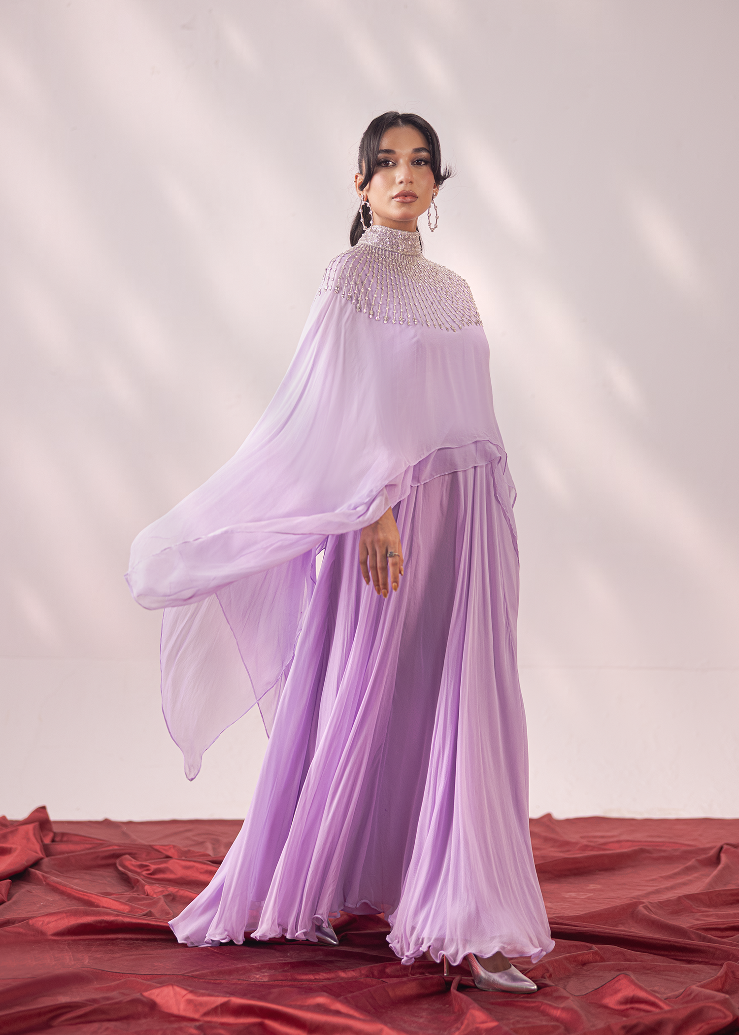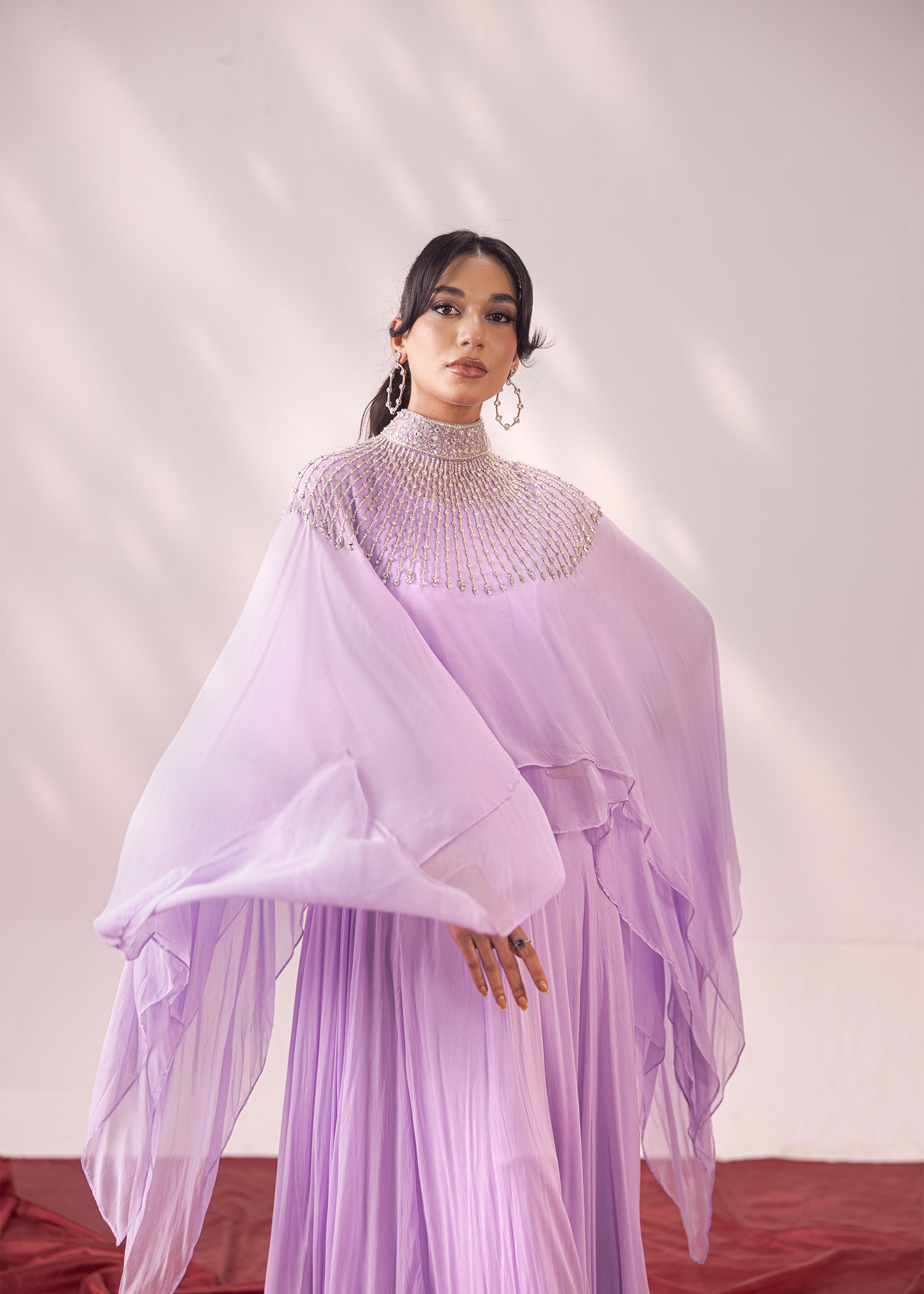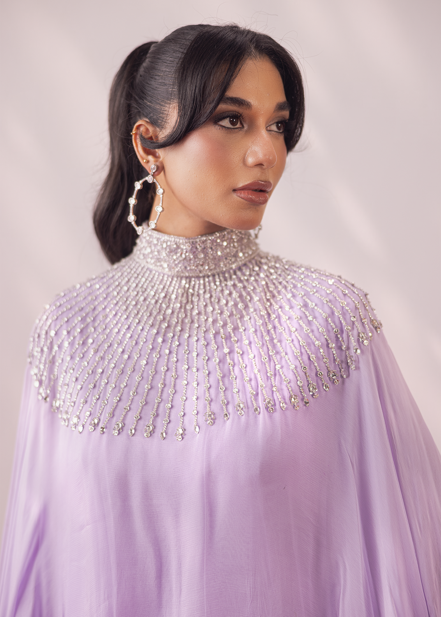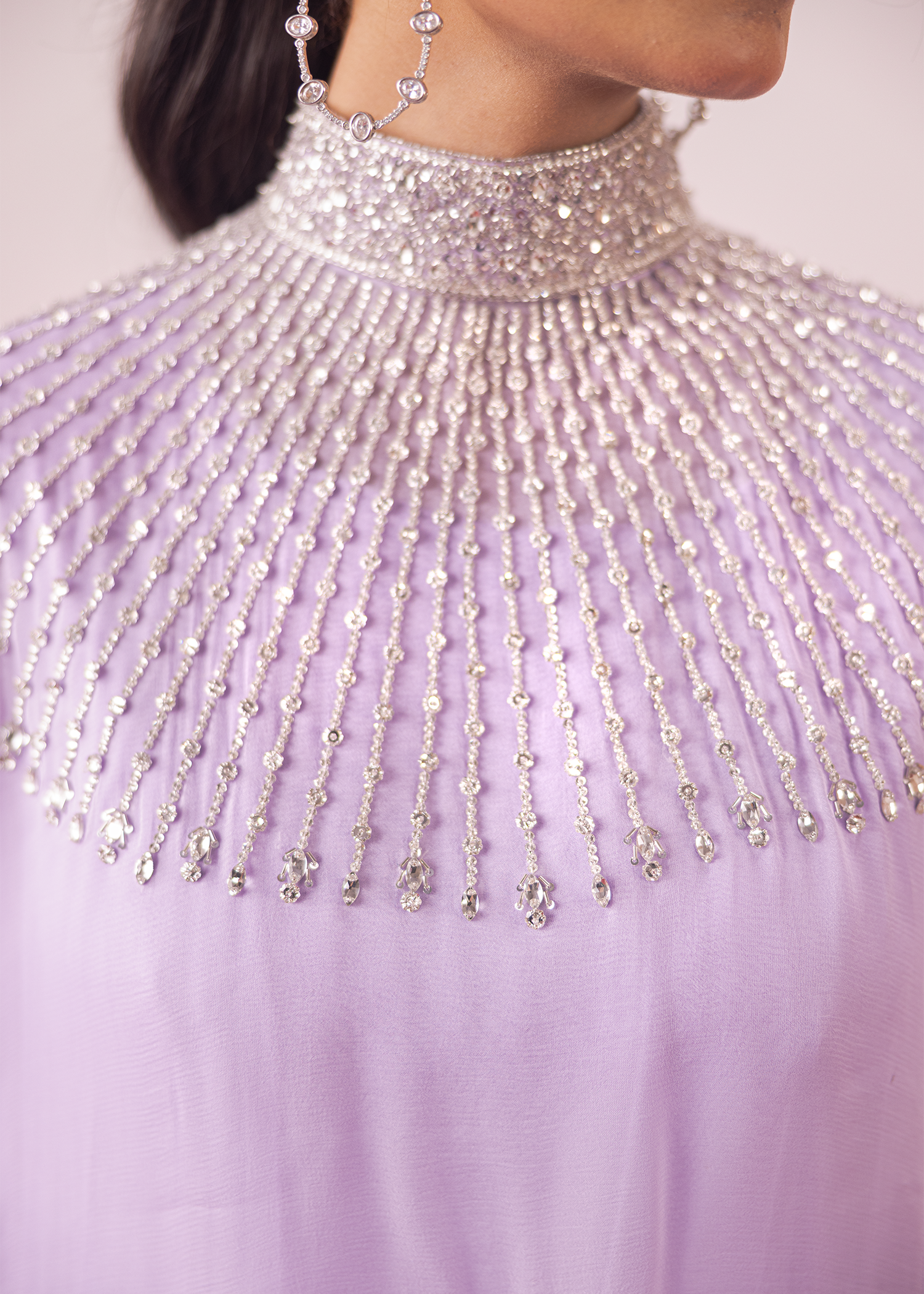 A two-piece ensemble in soft lilac chiffon, designed with fluid layers for graceful movement. Hand-embellished with Swarovski and stones, the high neckline adds a radiant, couture finish.