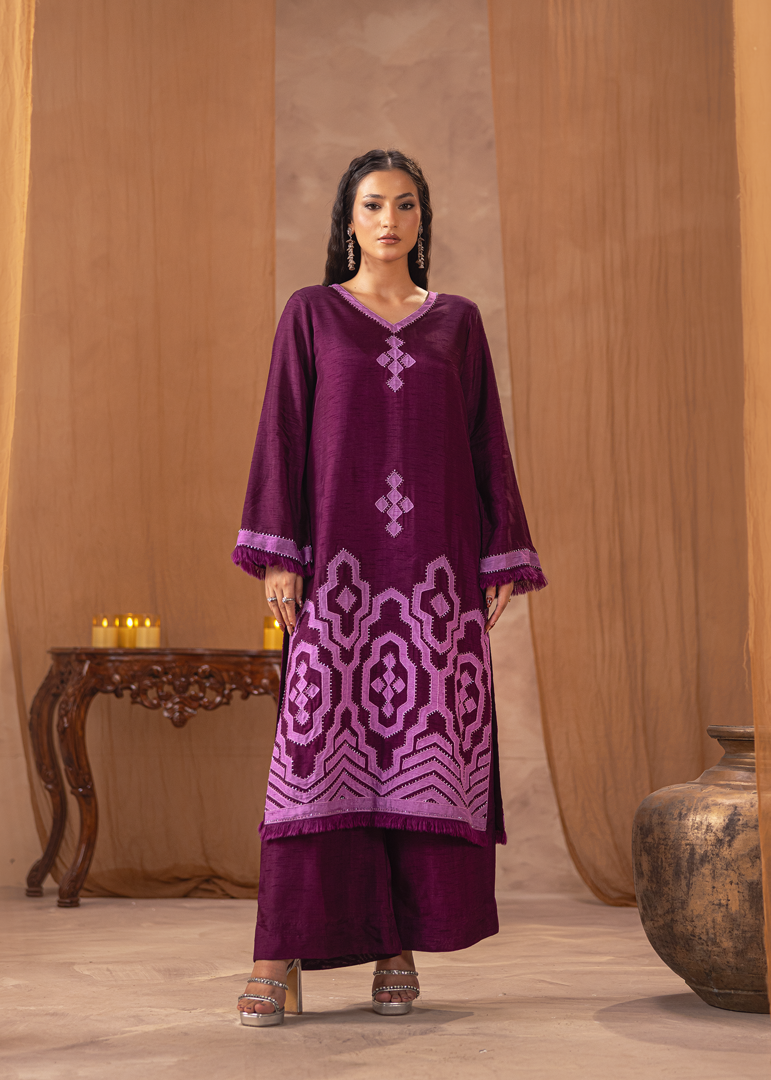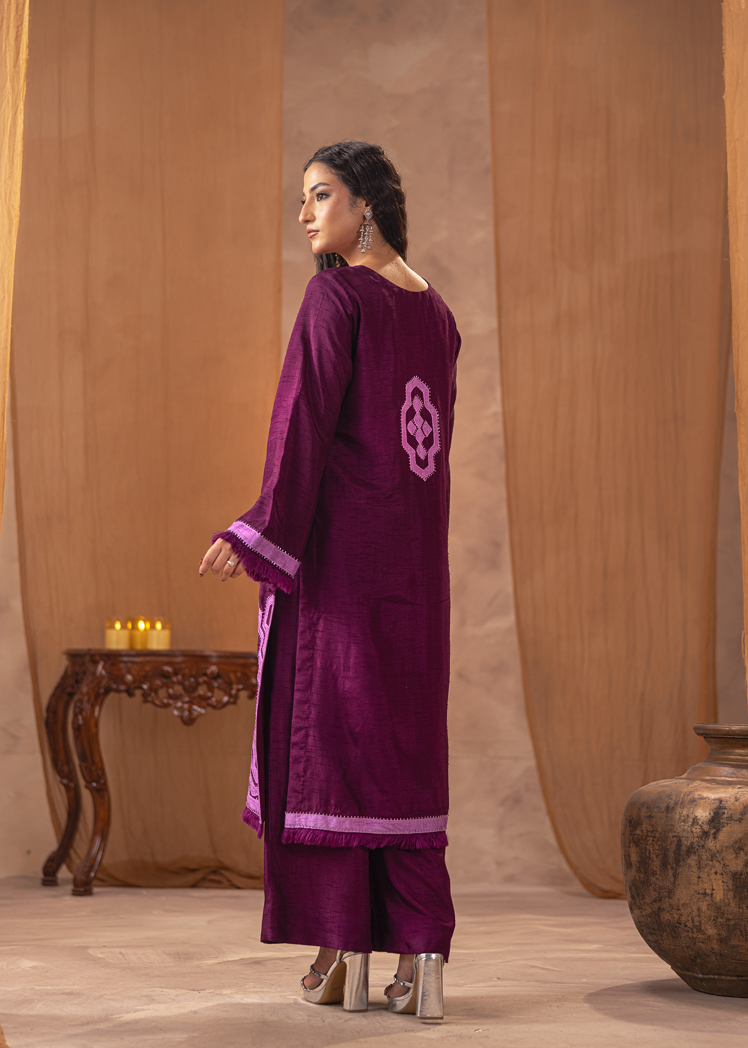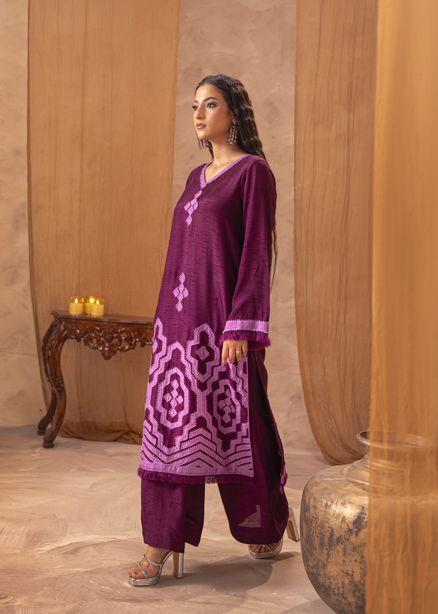 Two-piece set in rich dark brown Arabic linen, adorned with fine machine embroidery. The layered peplum-style top adds a touch of contemporary flair, paired with sleek trousers for an elegant yet modern silhouette. A refined choice for understated festive sophistication.