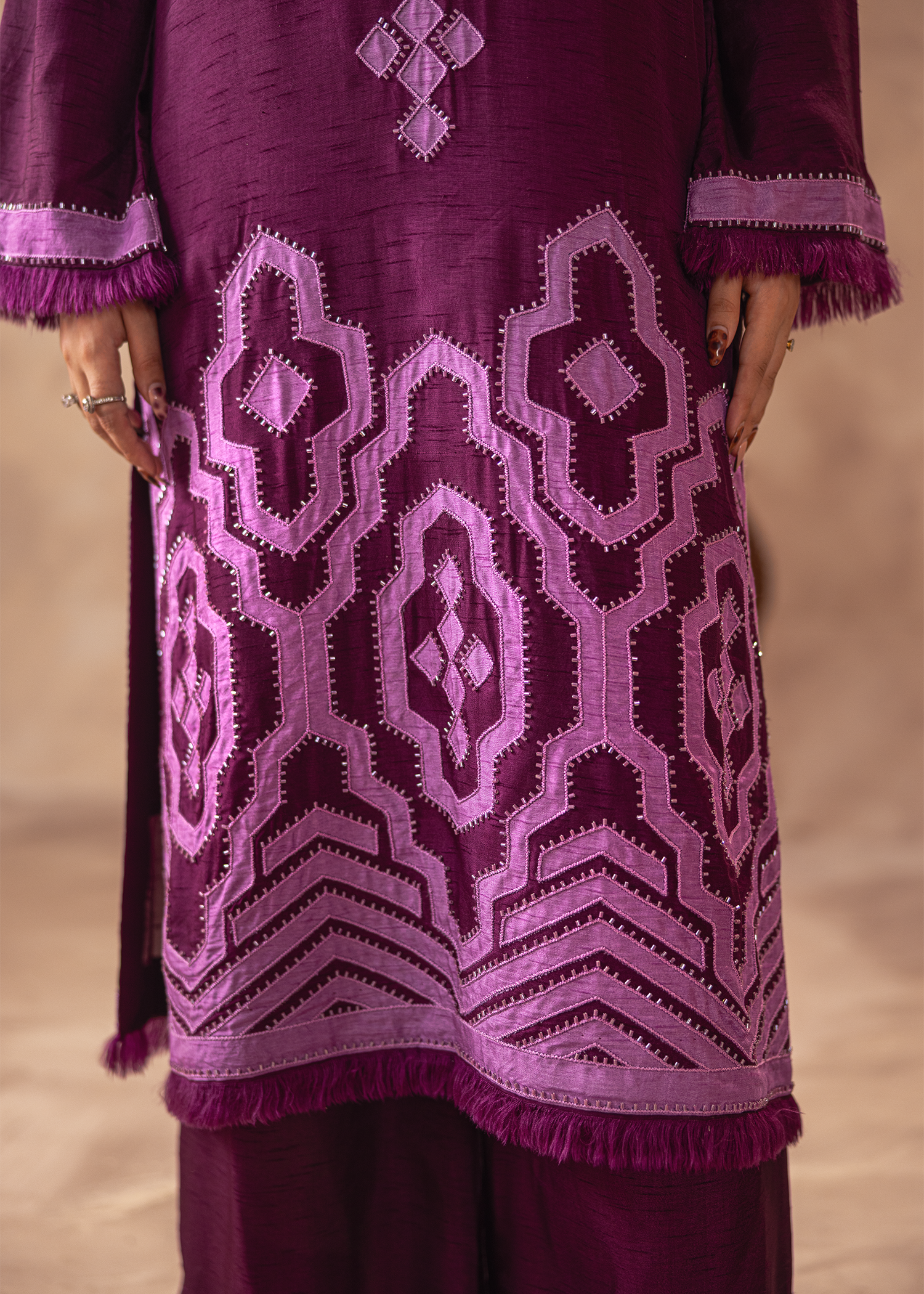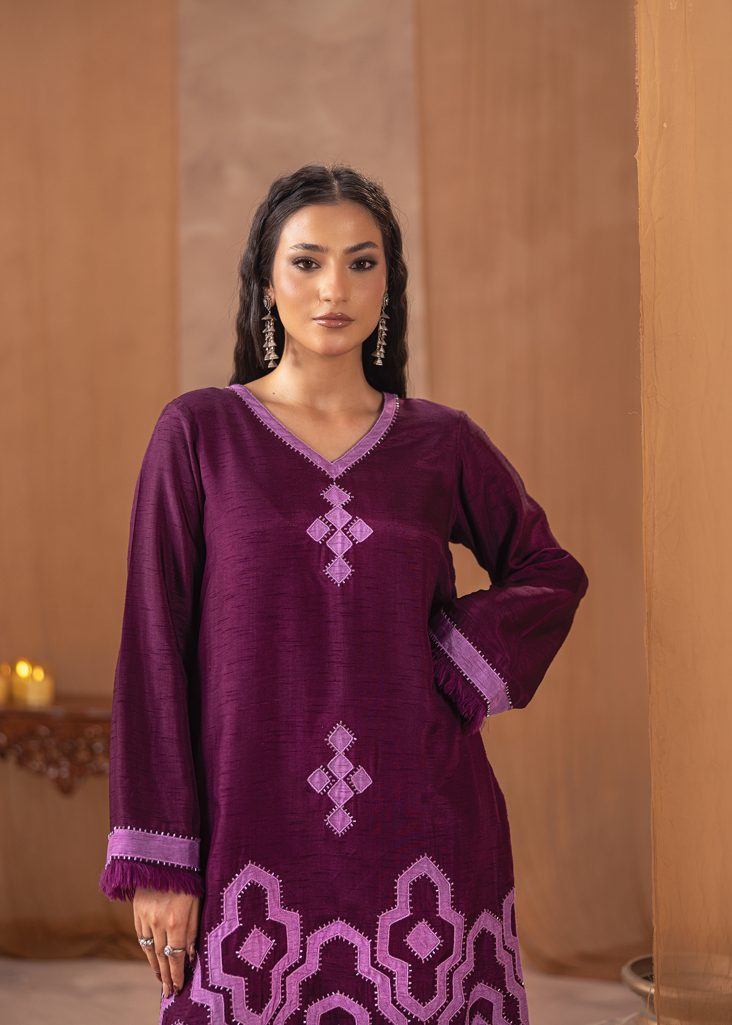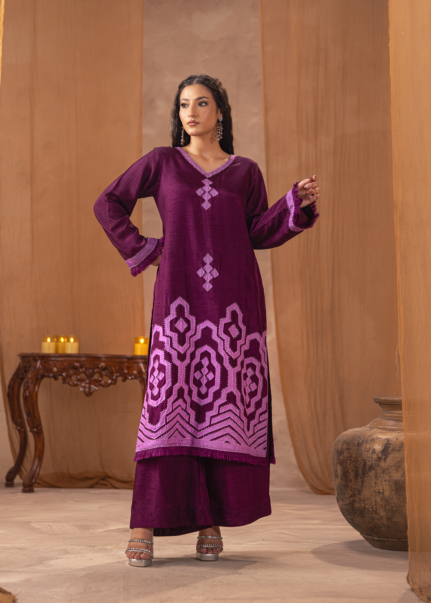 Two-piece set in rich dark brown Arabic linen, adorned with fine machine embroidery. The layered peplum-style top adds a touch of contemporary flair, paired with sleek trousers for an elegant yet modern silhouette. A refined choice for understated festive sophistication.