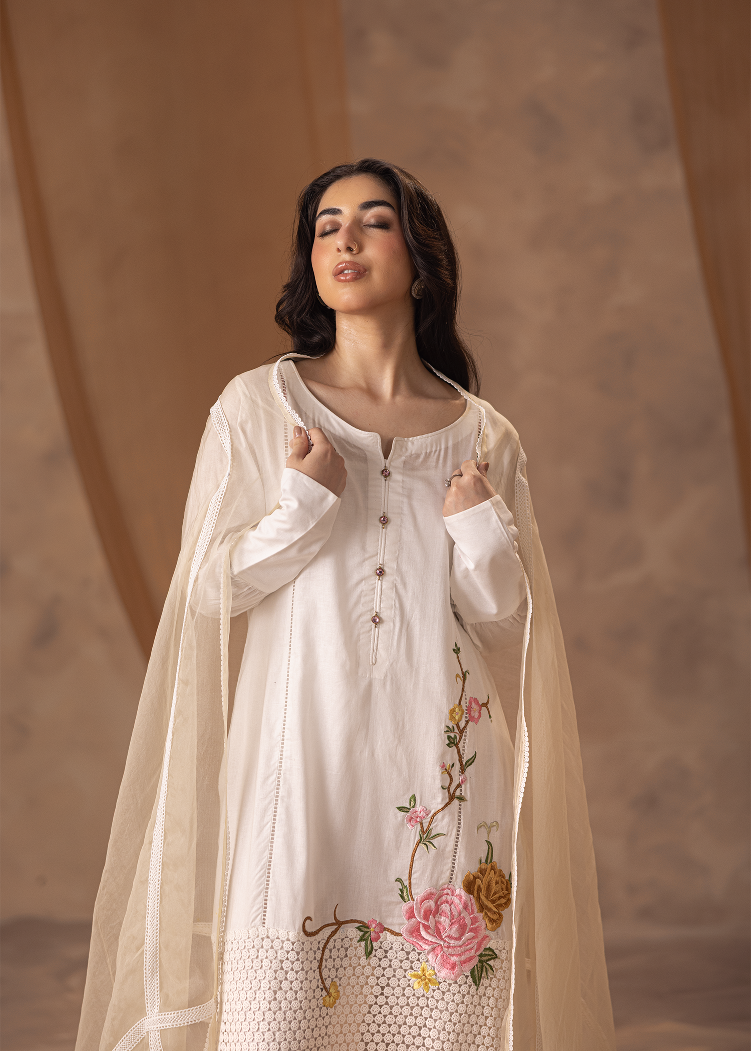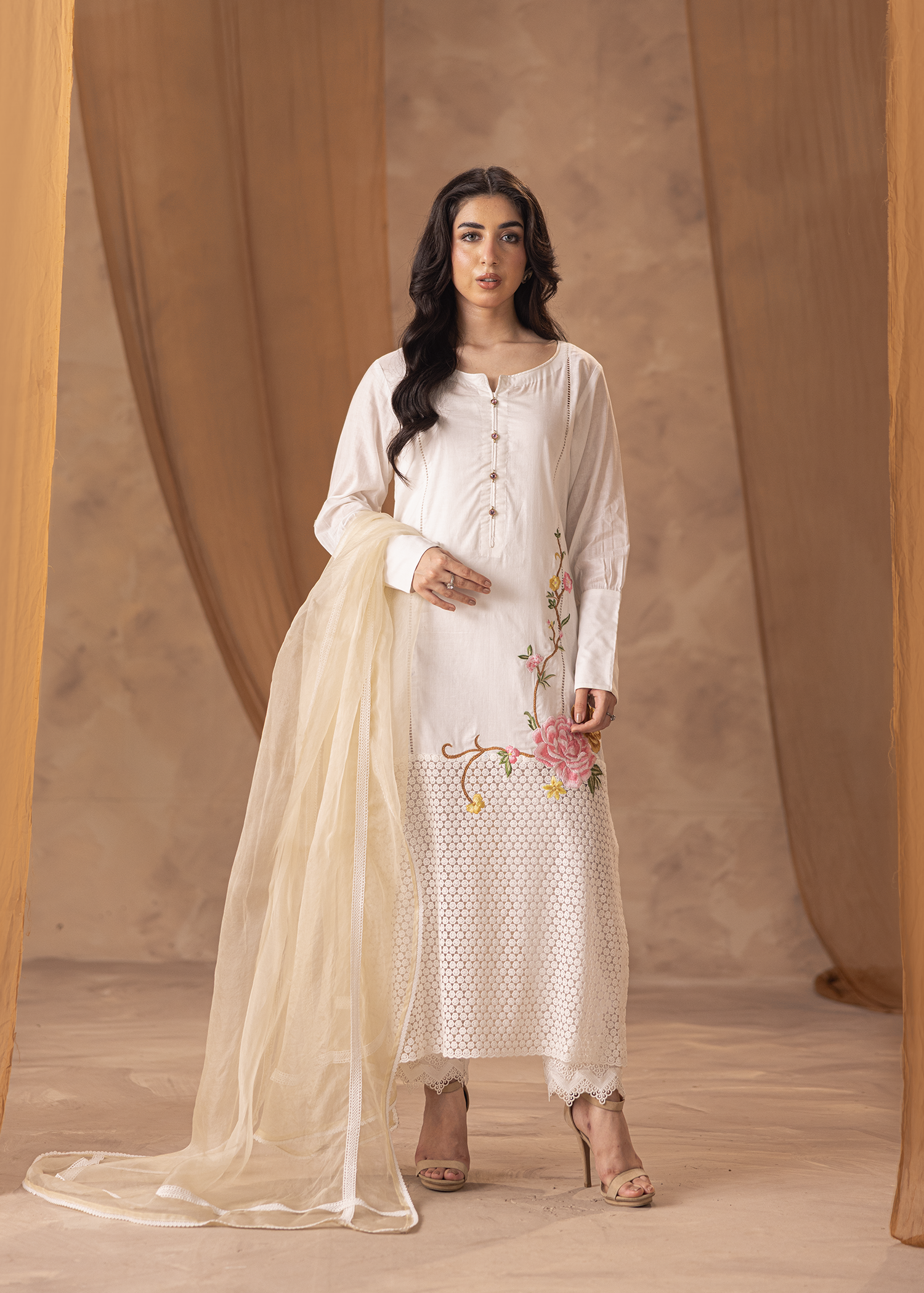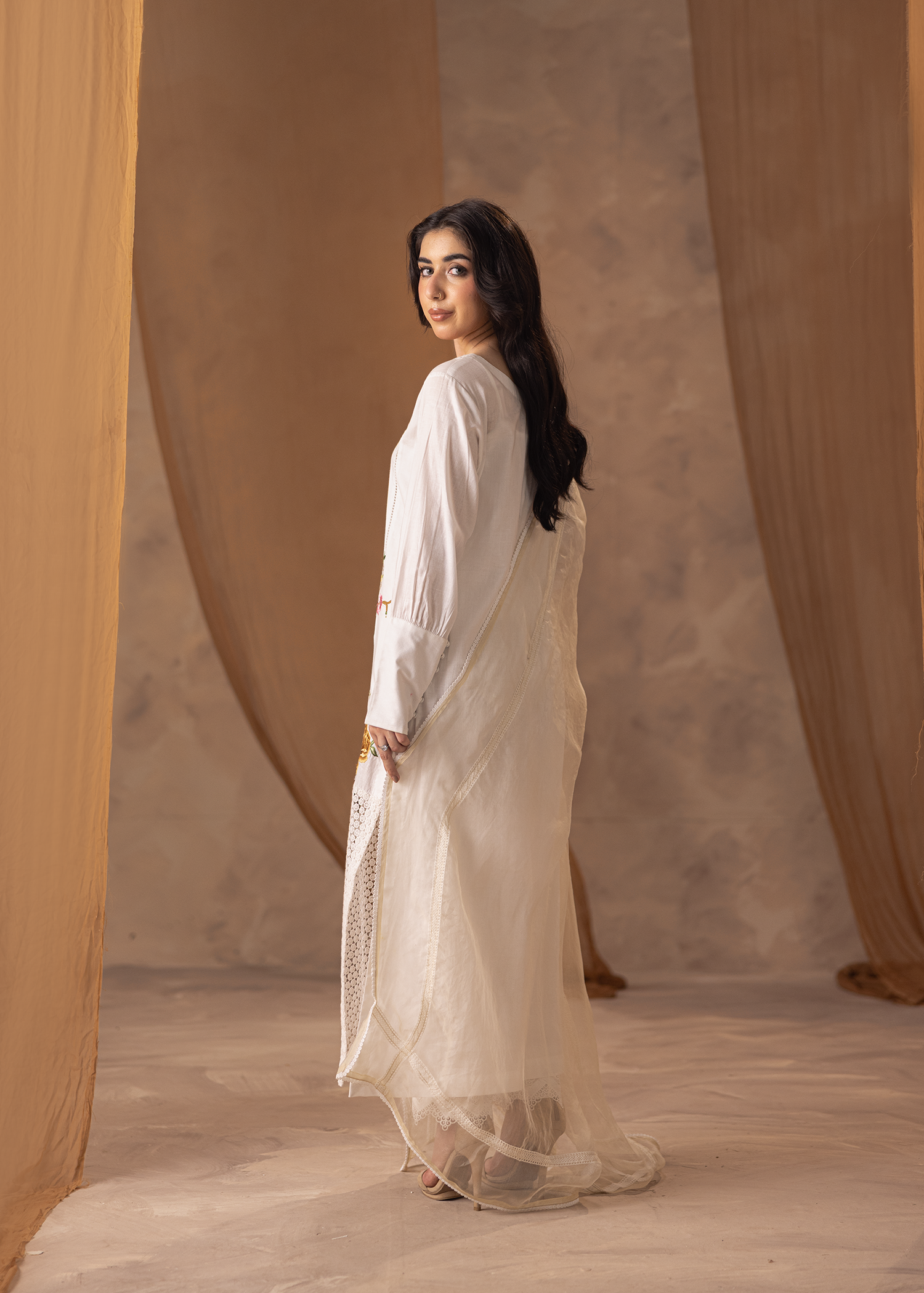 A three-piece ensemble in pristine white, crafted from lawn, net, and organza. Defined by delicate machine embroidery, it embodies understated elegance with a graceful flow.