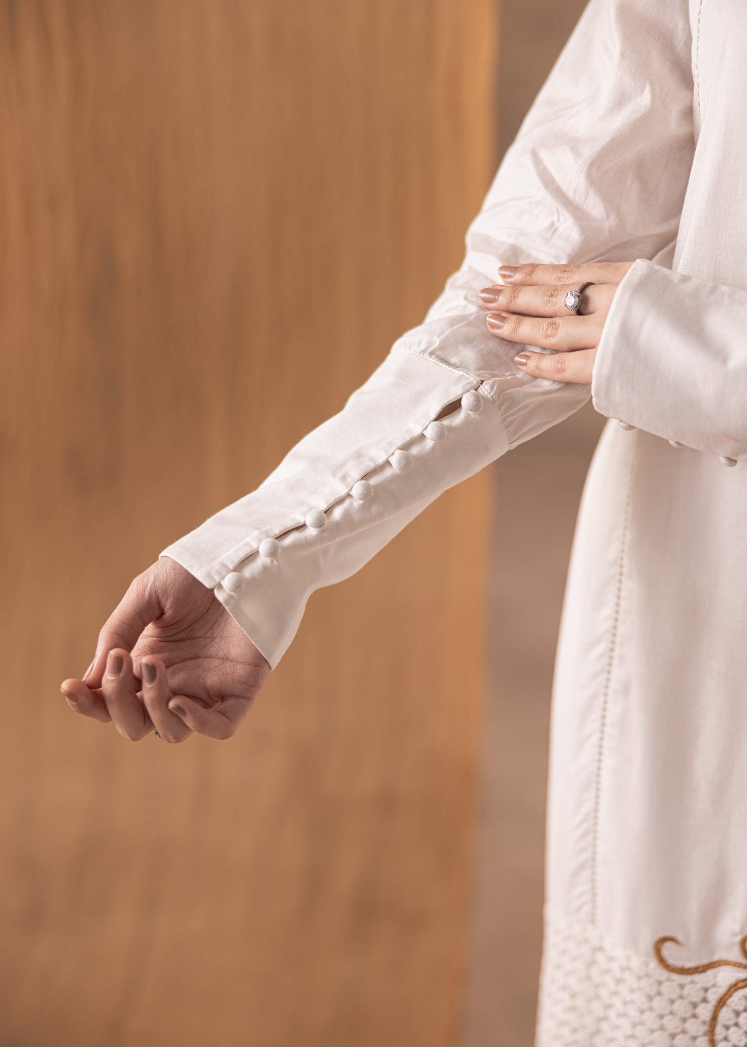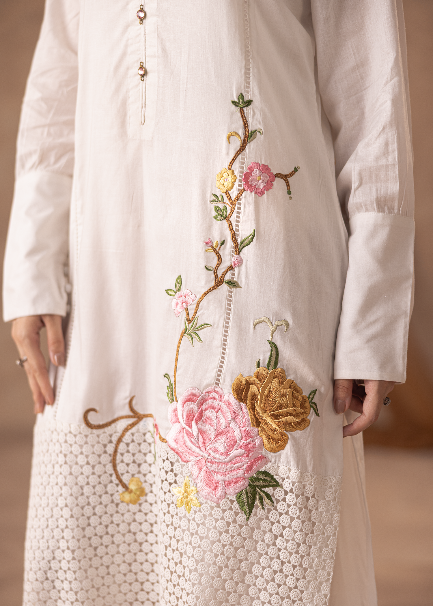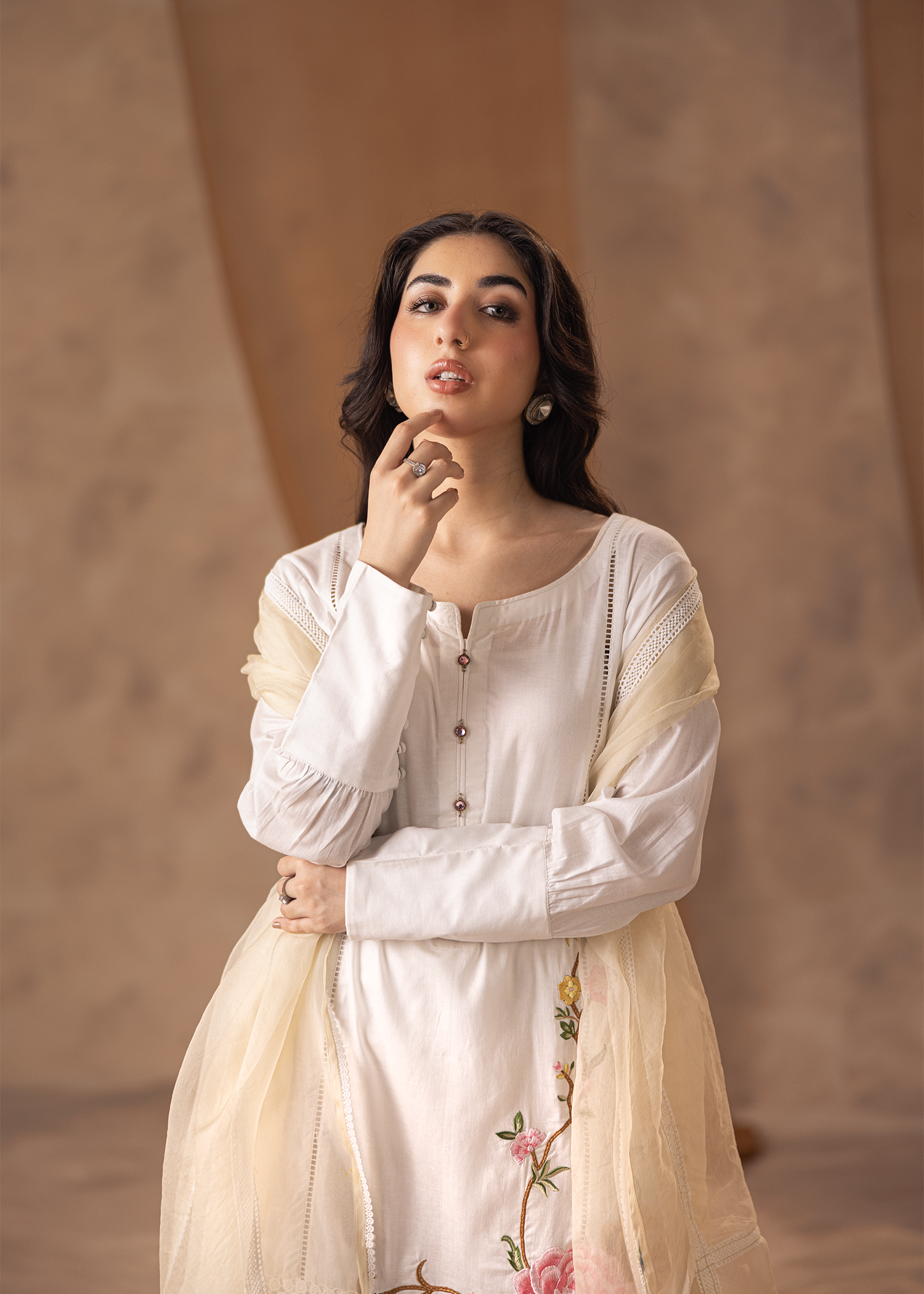 A three-piece ensemble in pristine white, crafted from lawn, net, and organza. Defined by delicate machine embroidery, it embodies understated elegance with a graceful flow.