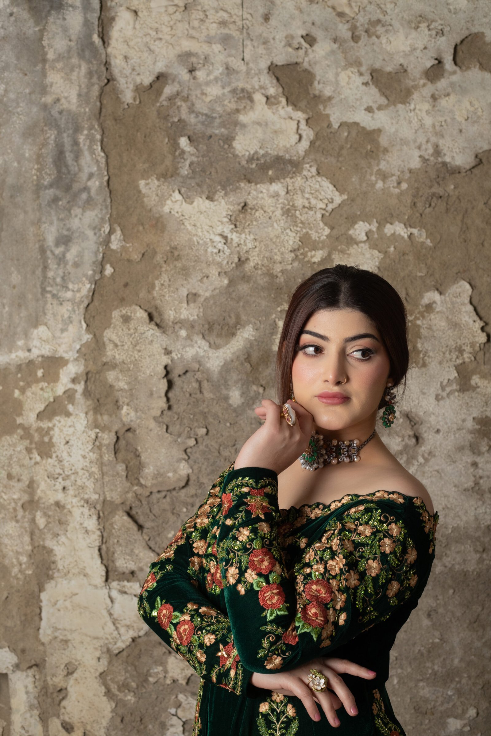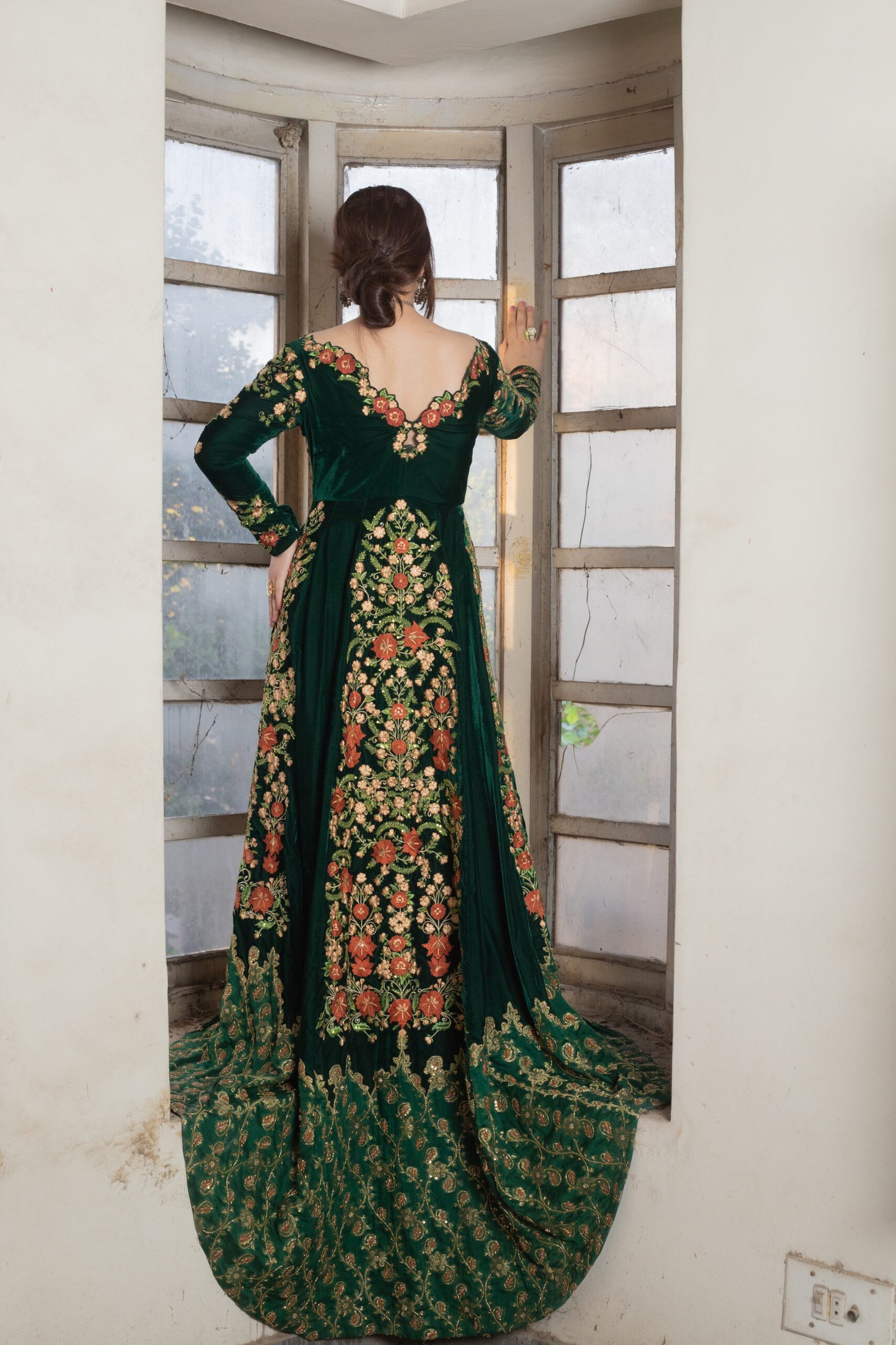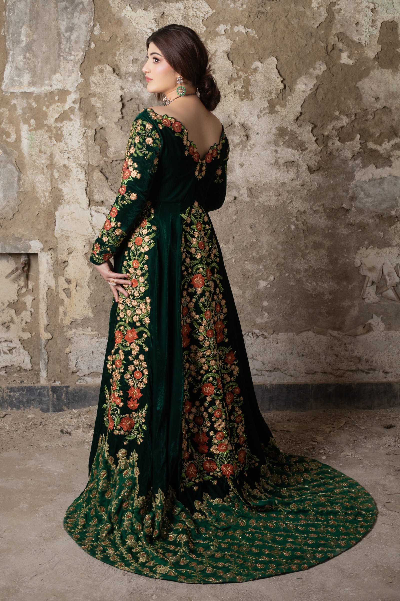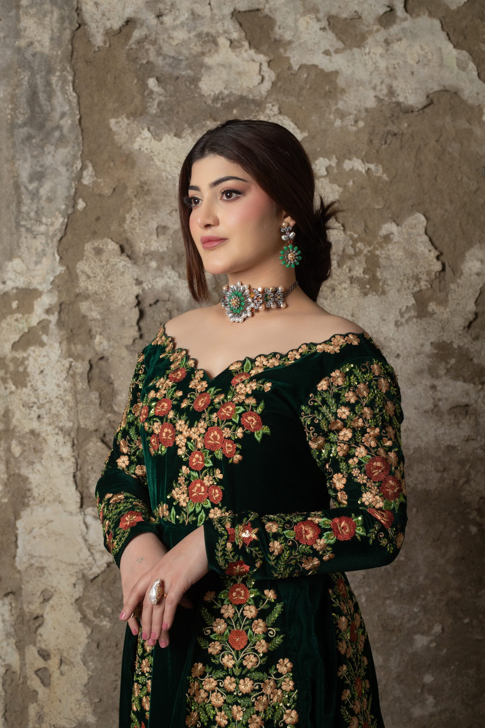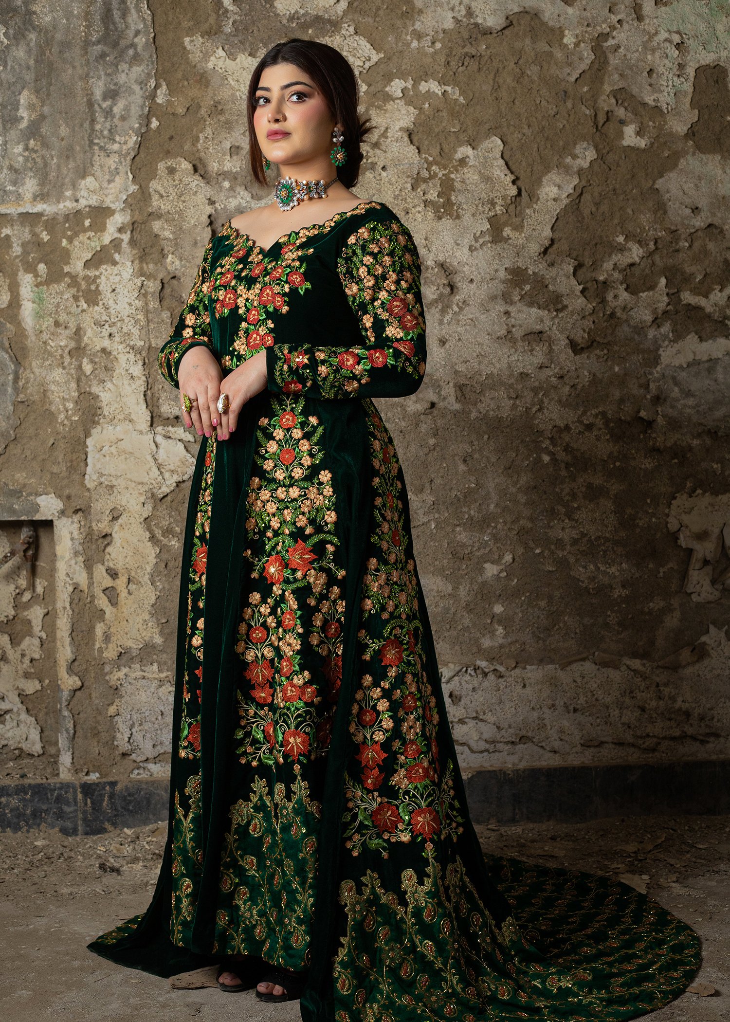 This dark green masterpiece is crafted on plush velvet and brought to life with intricate handwork. The outfit features detailed Rasham thread embroidery, elevated with katdana, betki, and fine sequin detailing that creates a rich, dimensional finish. The floral pattern runs seamlessly across the bodice, sleeves, and the sweeping hem, giving the piece a regal presence. The long, graceful fall enhances its formal silhouette and makes it ideal for festive and evening occasions. A single-piece statement outfit designed for women who want refined craftsmanship and effortless elegance.