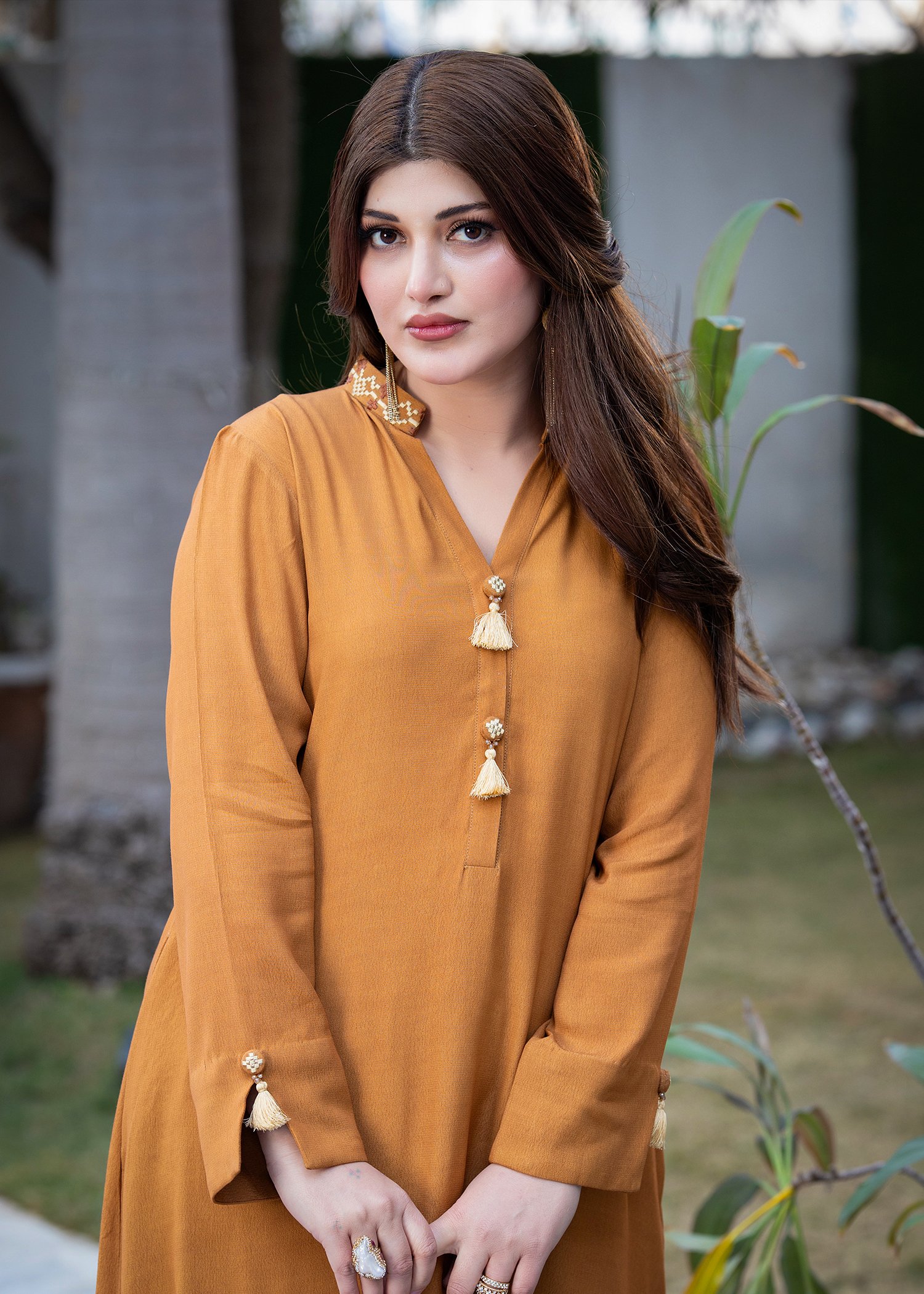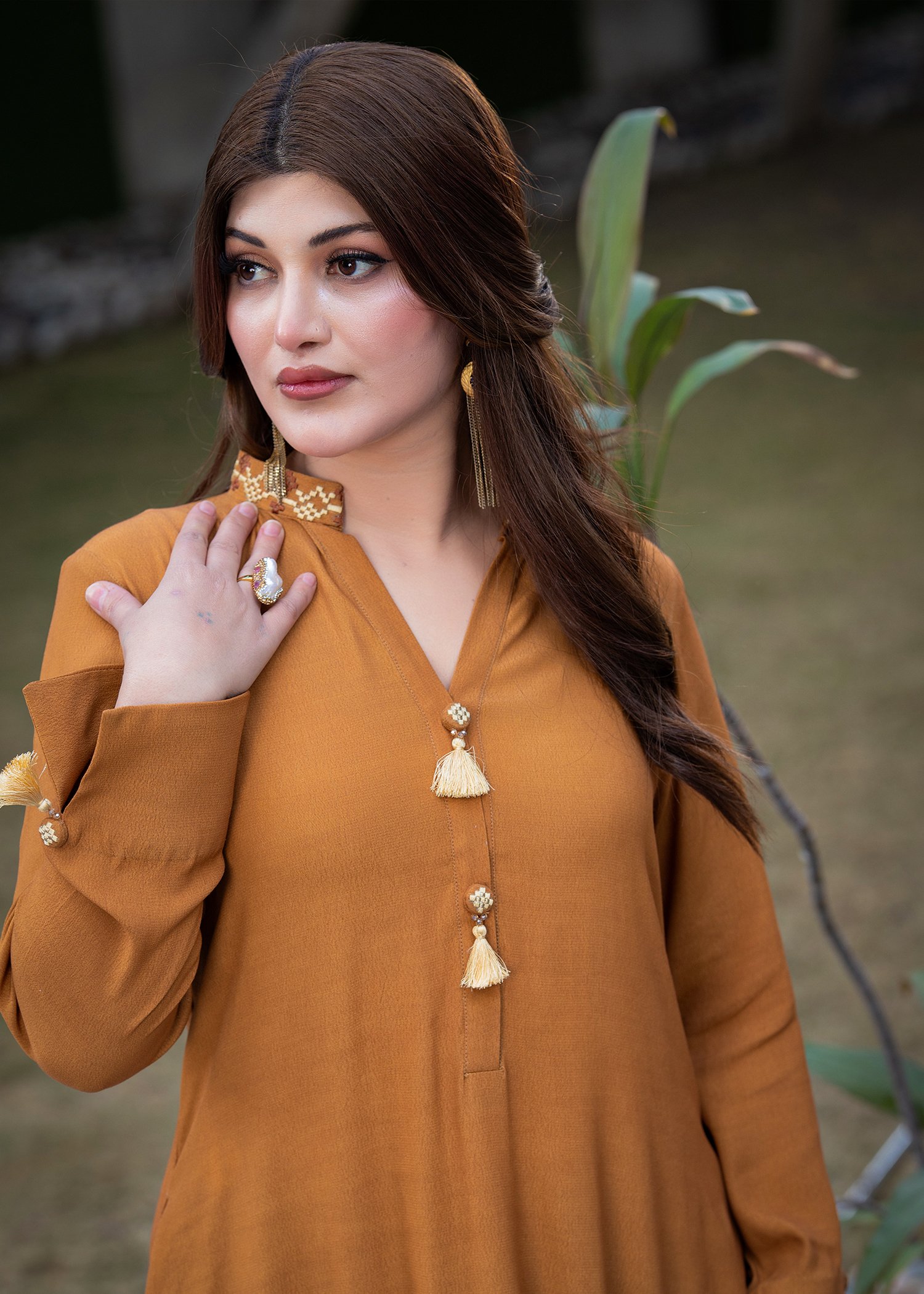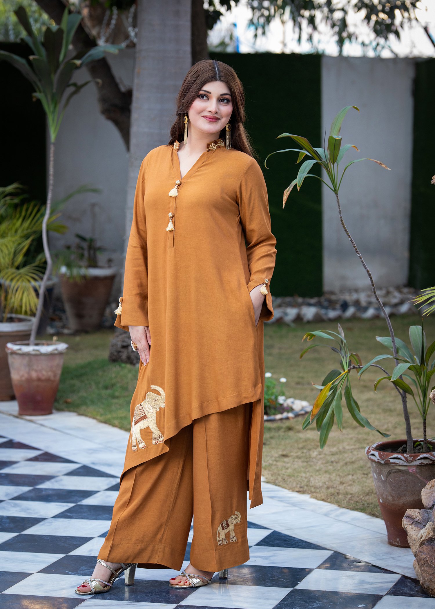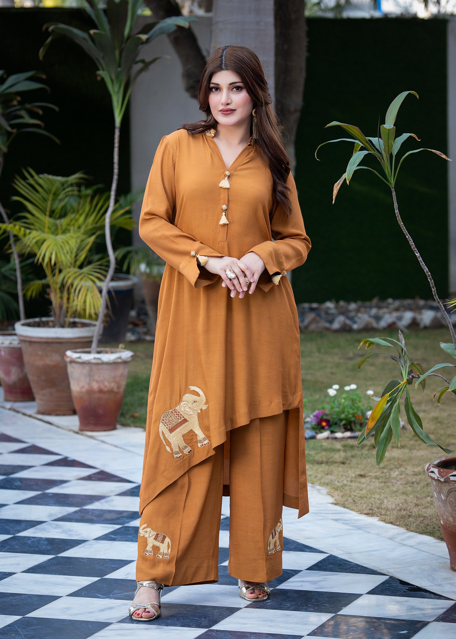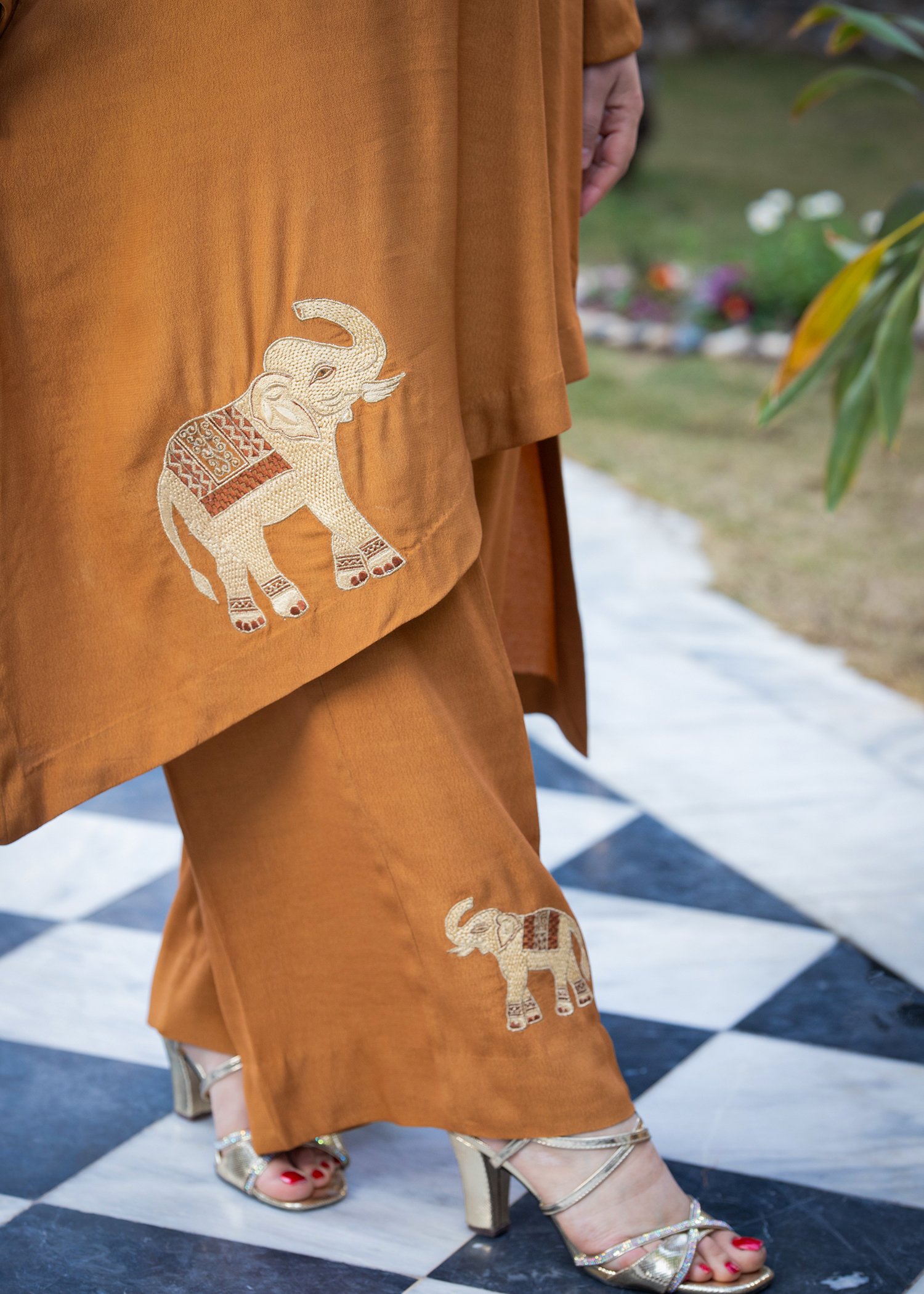 Rendered in a warm Golden Brown, this ensemble is crafted from lightweight georgette that drapes with ease. Precision machine embroidery enhances the silhouette with defined motifs, adding texture and depth without excess.