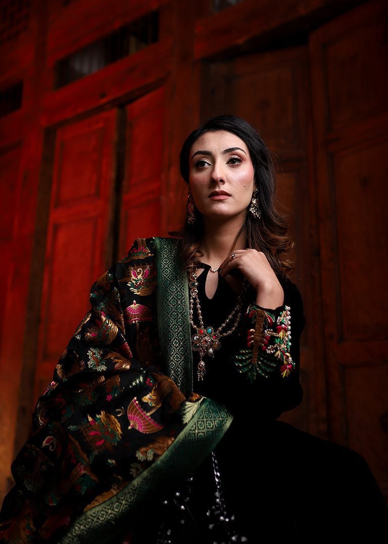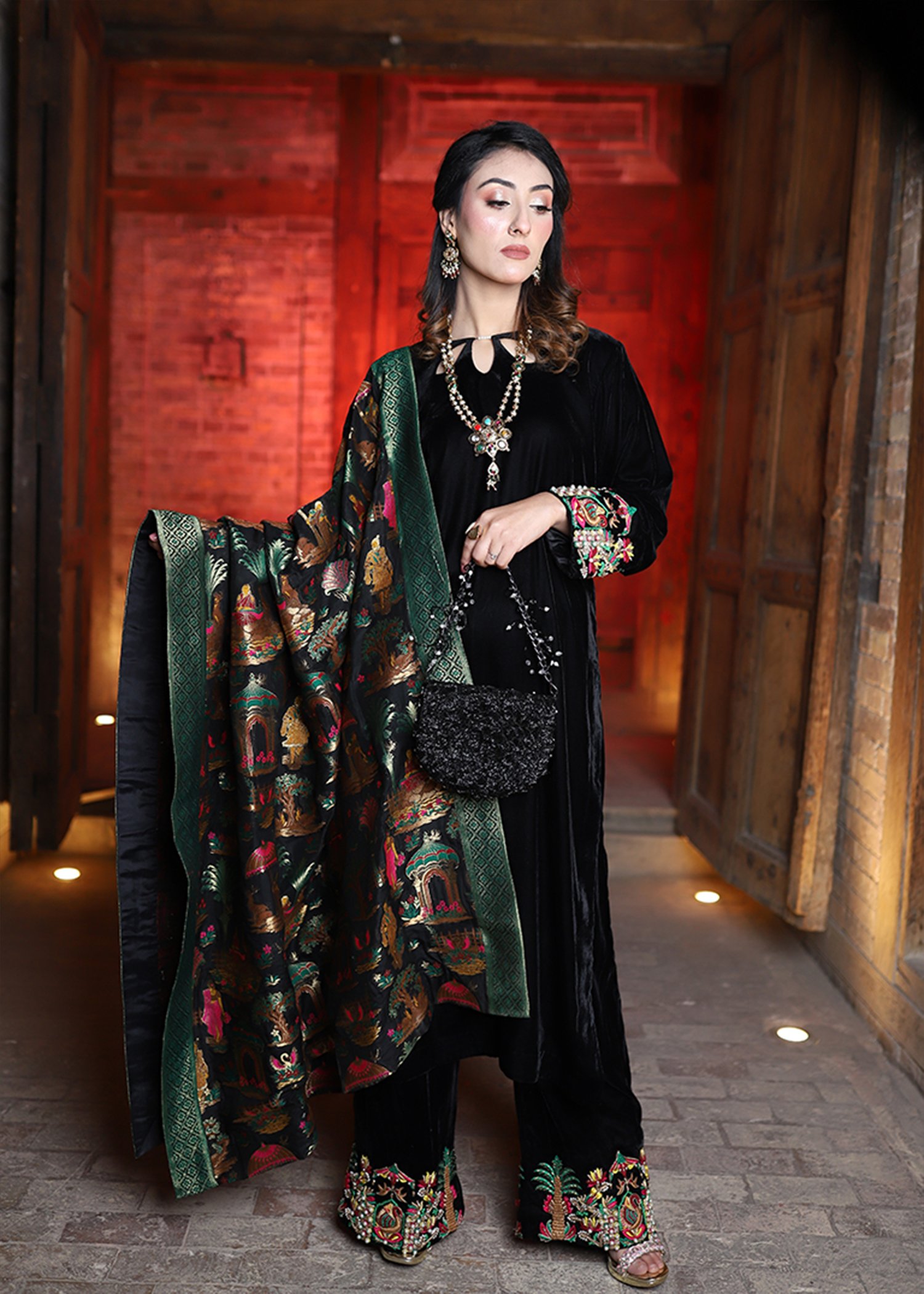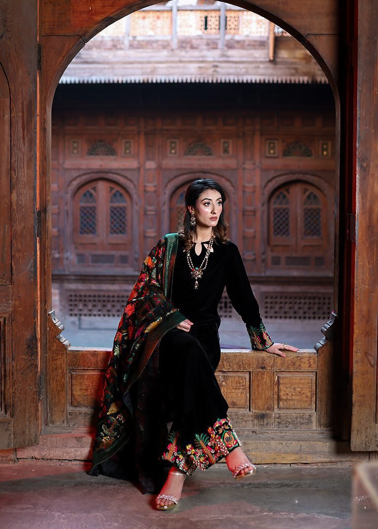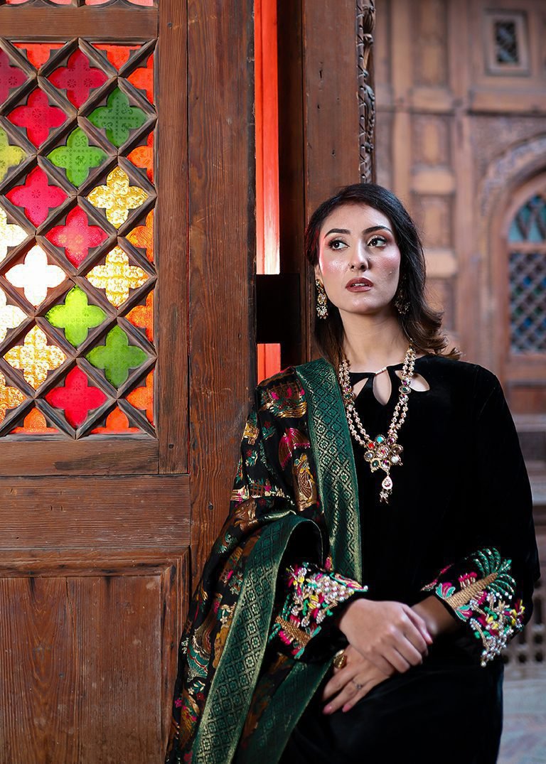 This black three-piece outfit showcases intricate hand embroidery using resham, dabka, and pearls on rich velvet and Banaras fabric. A refined silhouette for formal winter wear.