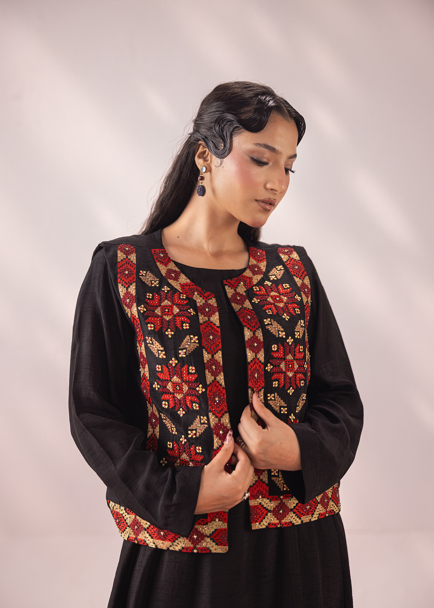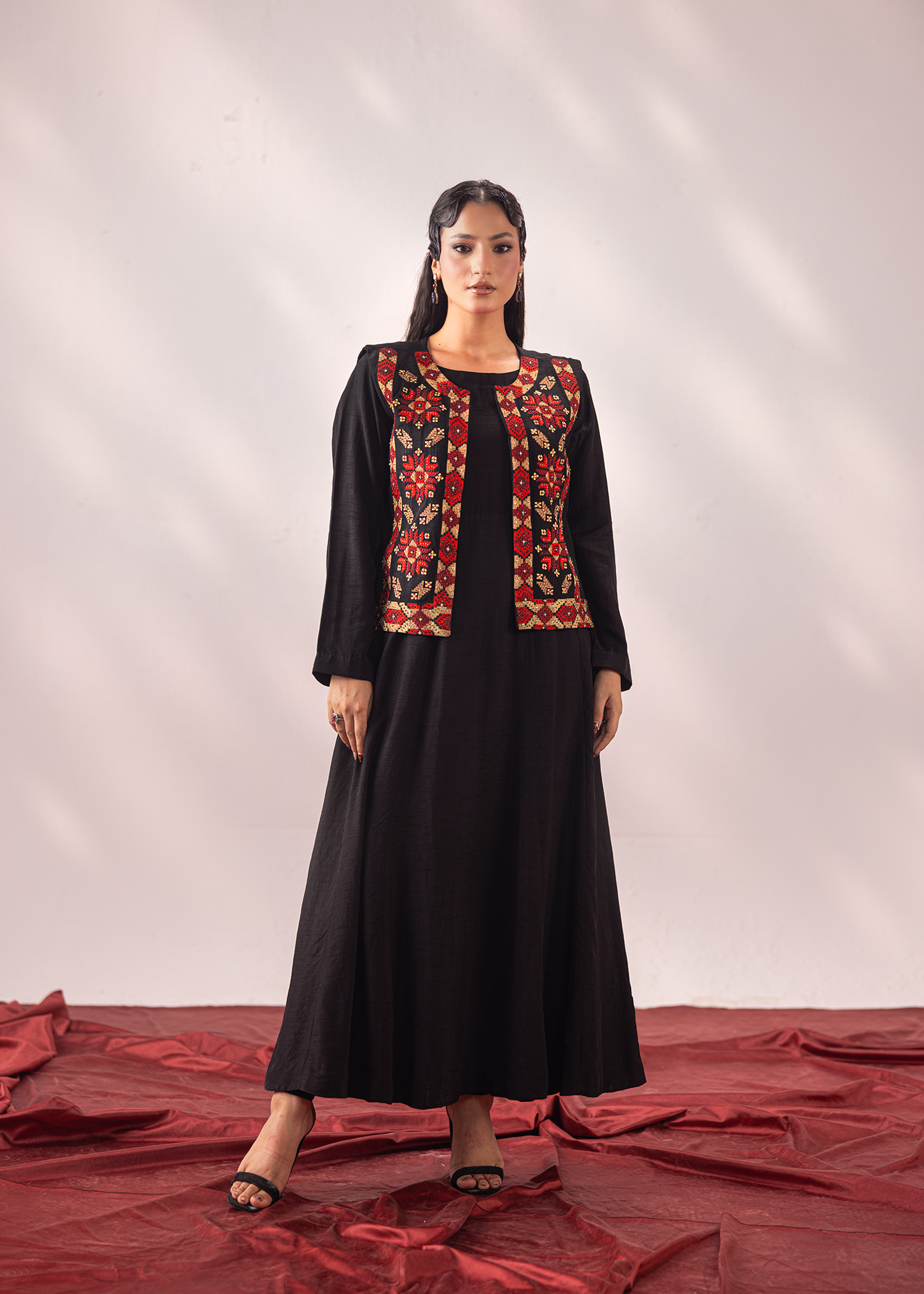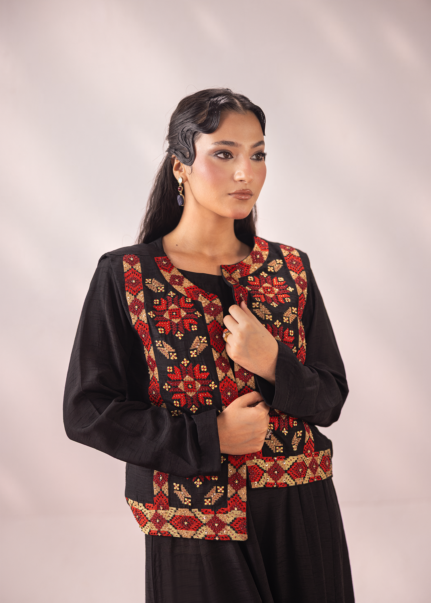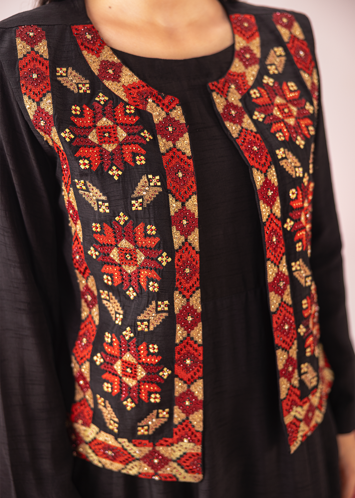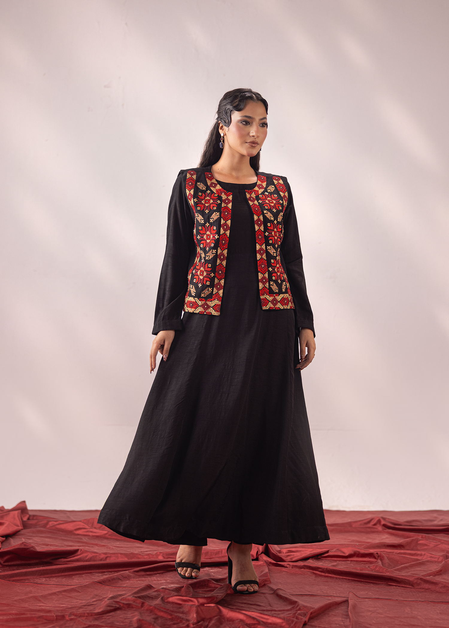 A refined black two-piece in premium Korean silk, paired with a vibrant embroidered waistcoat. The intricate machine embroidery is elevated with hand embellishments, bringing depth and artistry to the design. A versatile statement ensemble that balances tradition with contemporary charm.