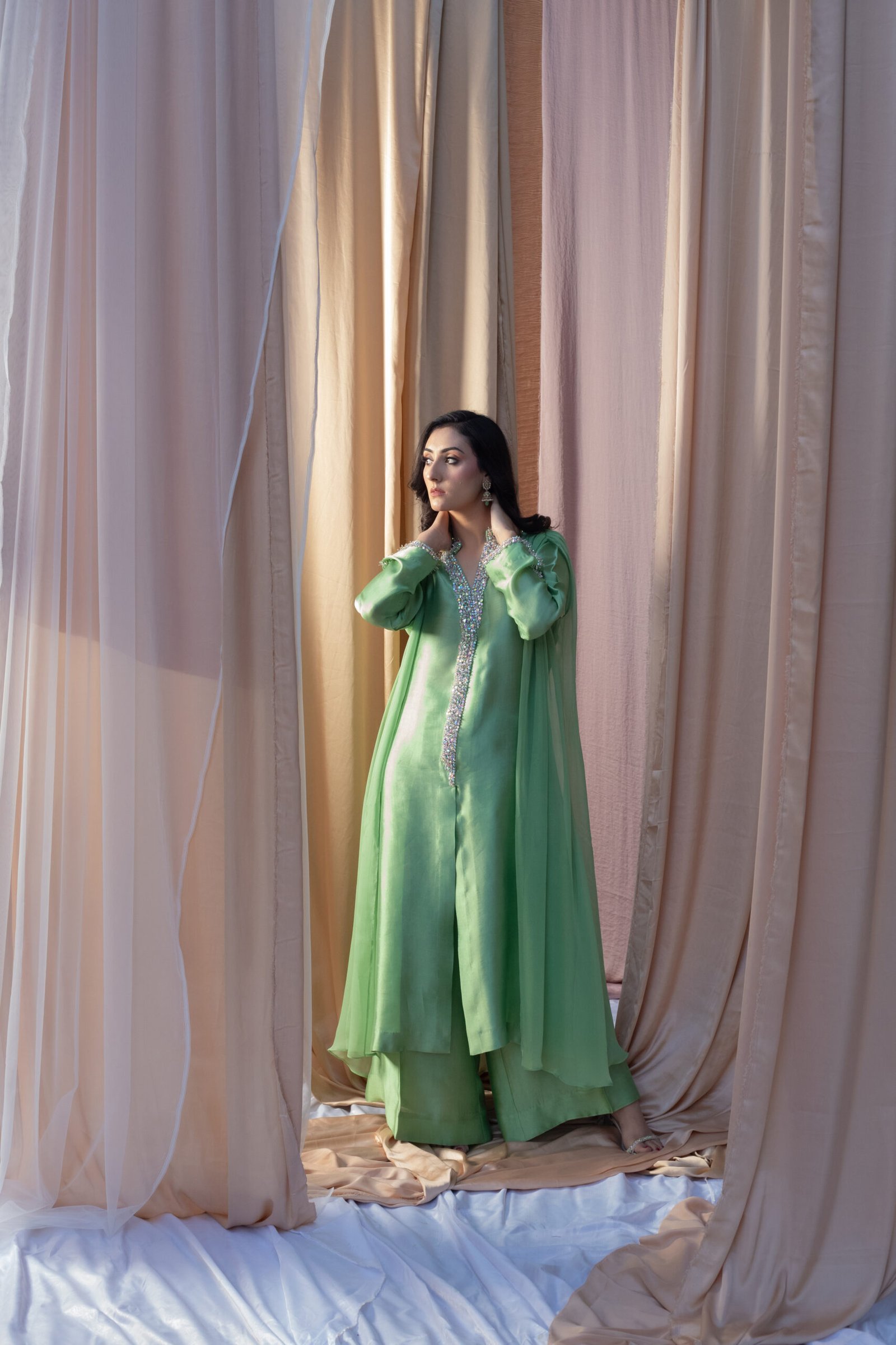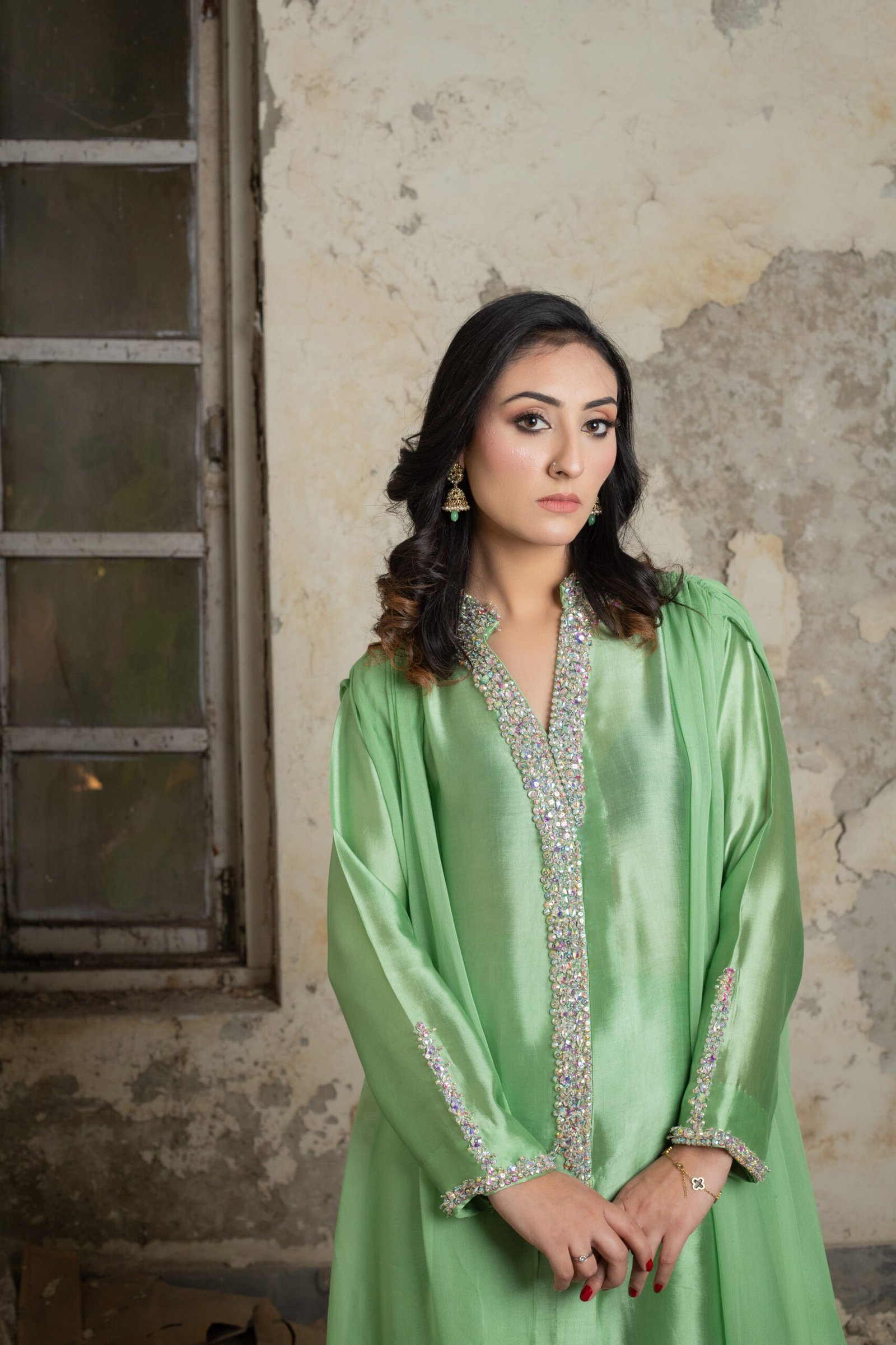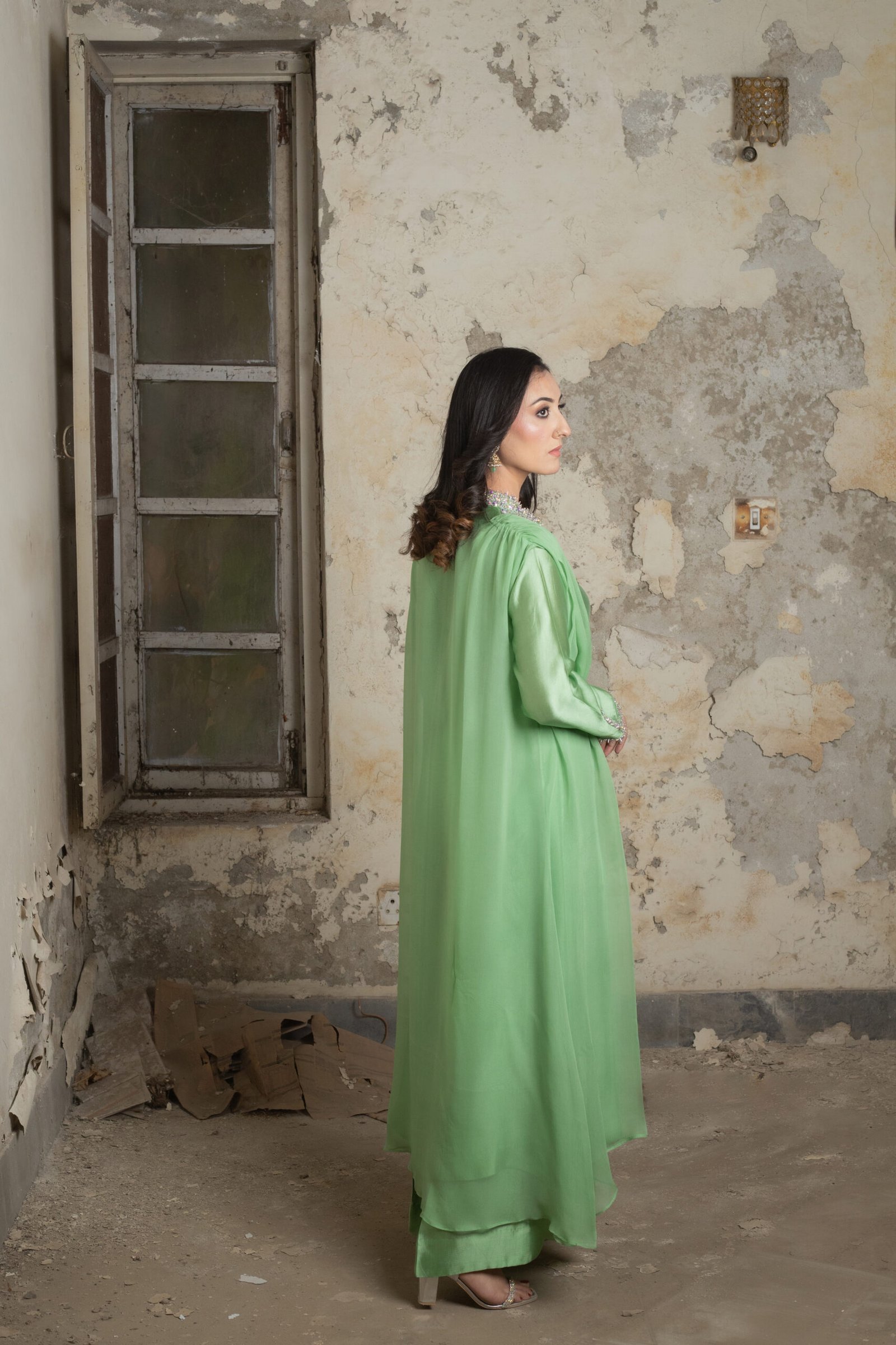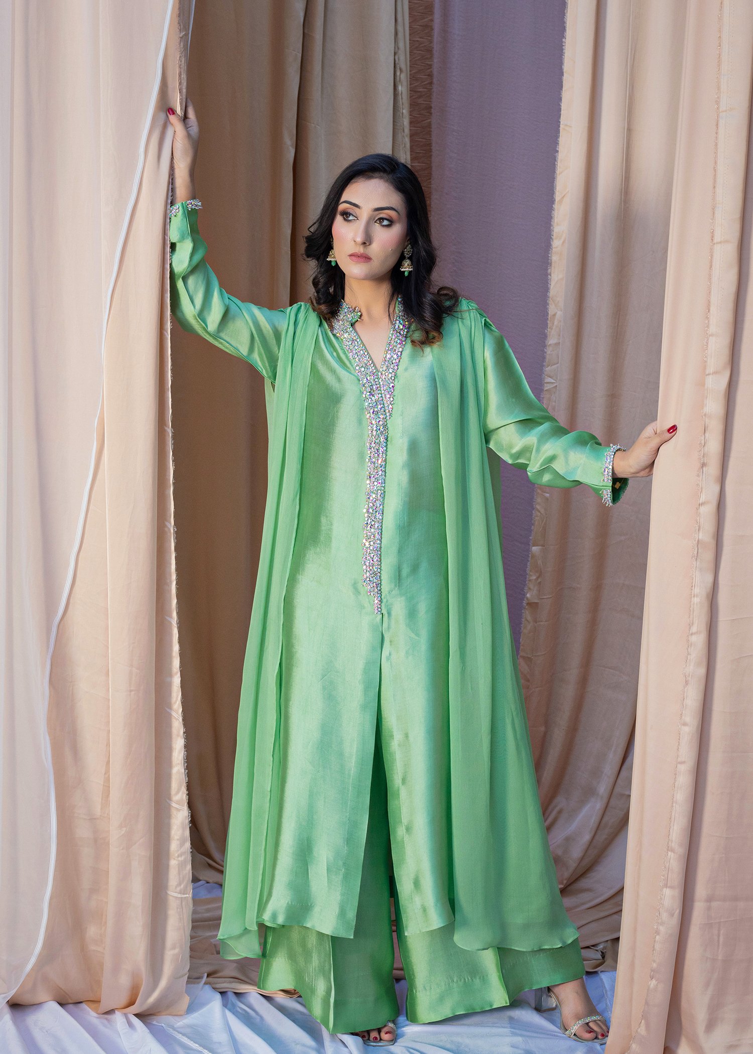 This three-piece ensemble in pastel green is crafted from sheesha silk paired with a soft chiffon layer, creating a fluid, elegant silhouette. The neckline, sleeves, and front are adorned with delicate hand embellishment using katdana, crystals, sequins, and moti, adding a refined sparkle without overpowering the look. The coordinated trousers and draped chiffon overlay complete the outfit with a graceful finish.