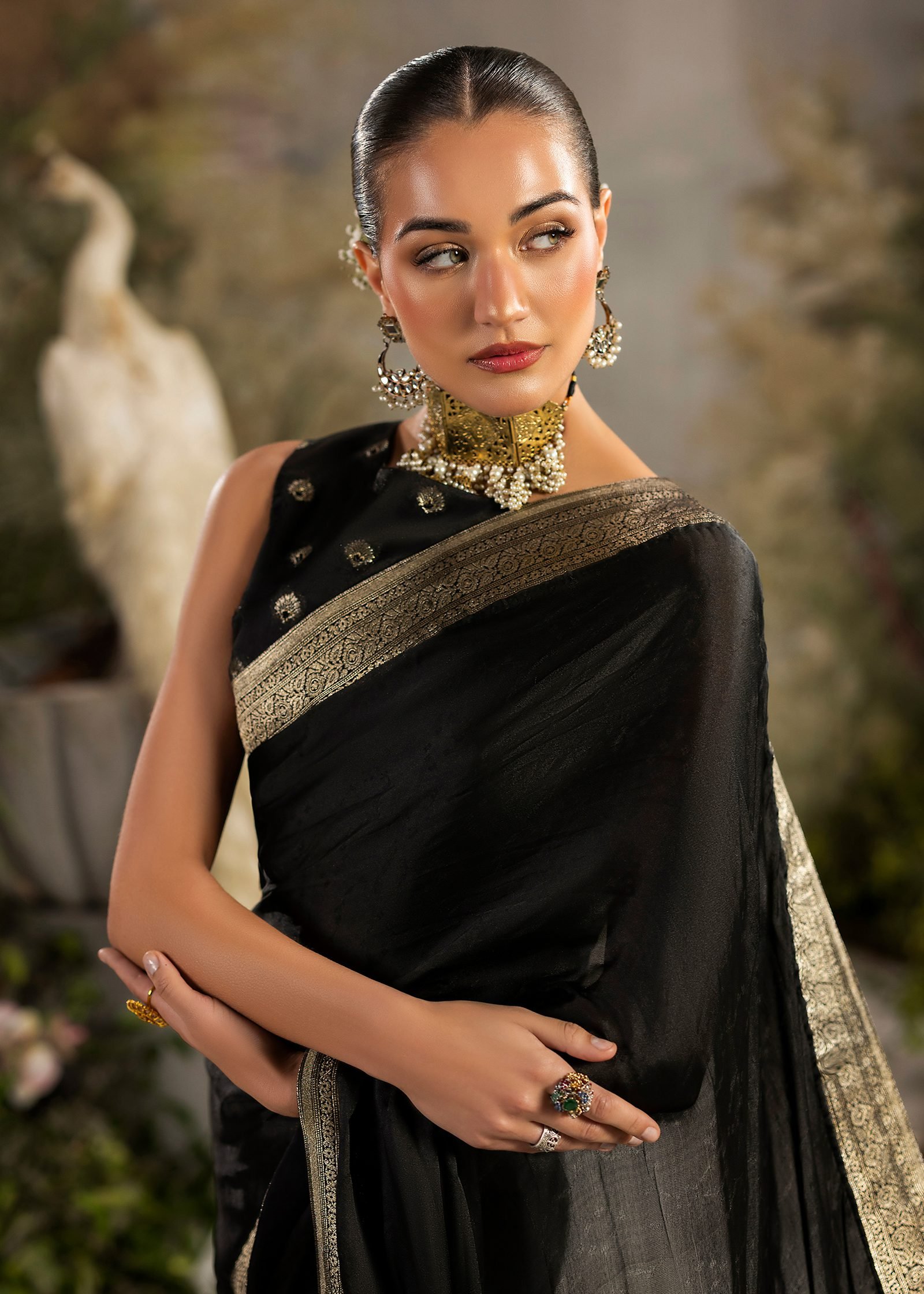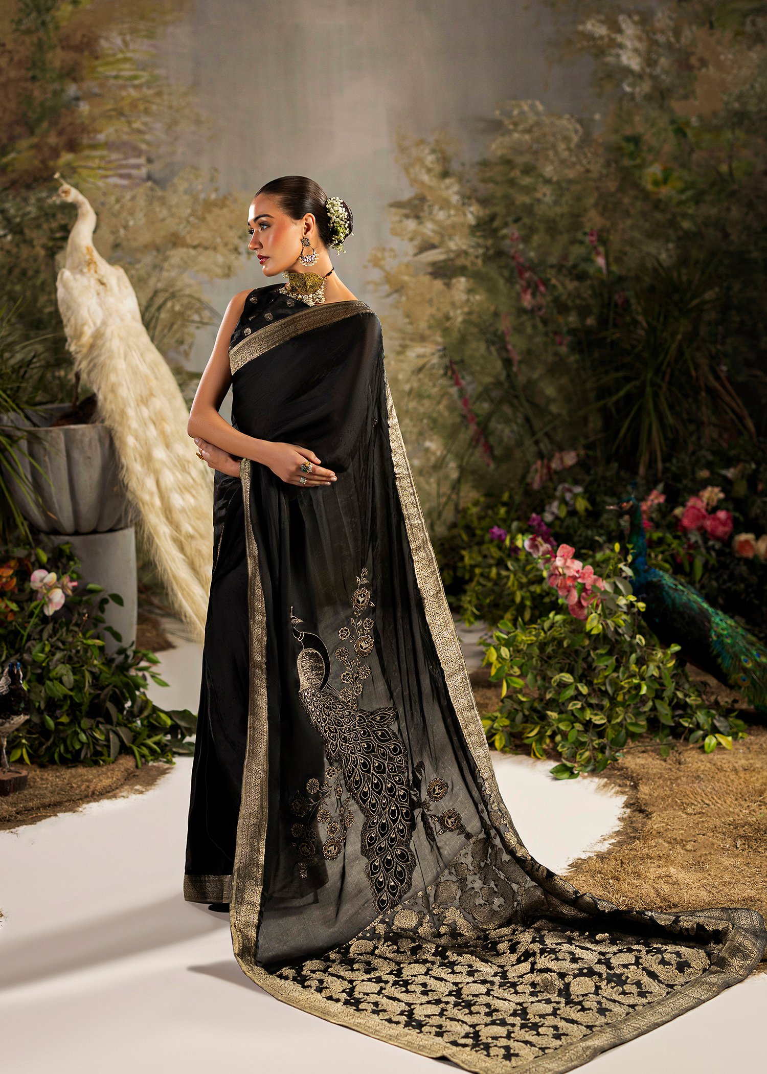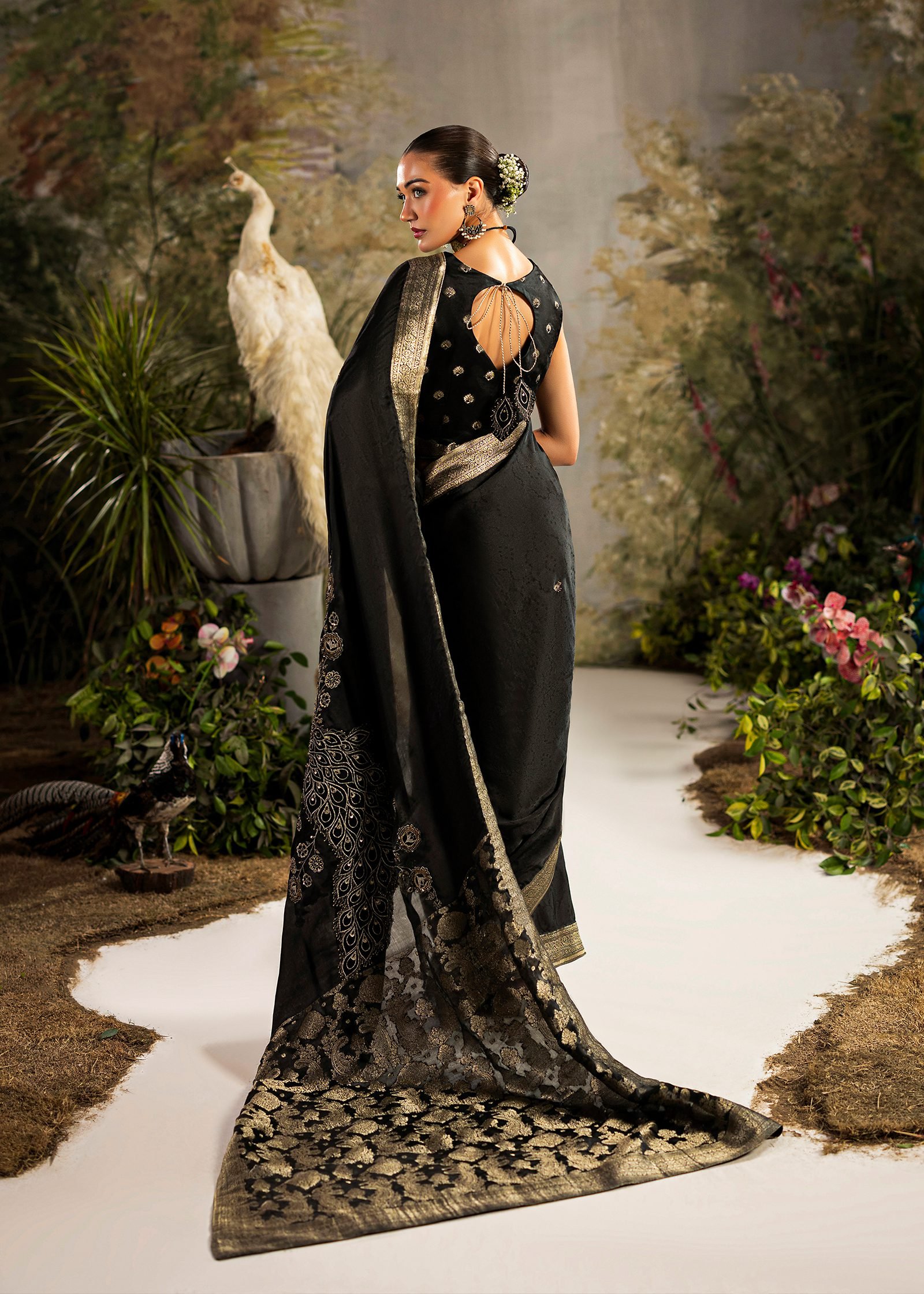 A classic black ensemble crafted in rich Banarasi fabric. Intricate machine embroidery is enhanced with hand embellishment using cutdana and sequins. A timeless design that reflects elegance, depth, and refined craftsmanship.