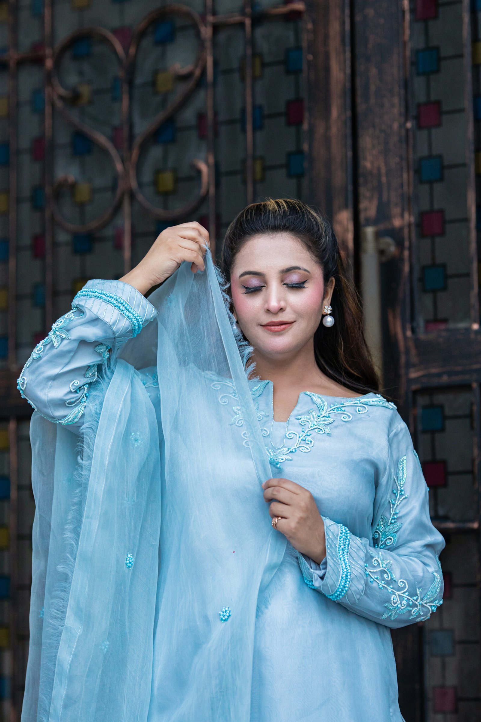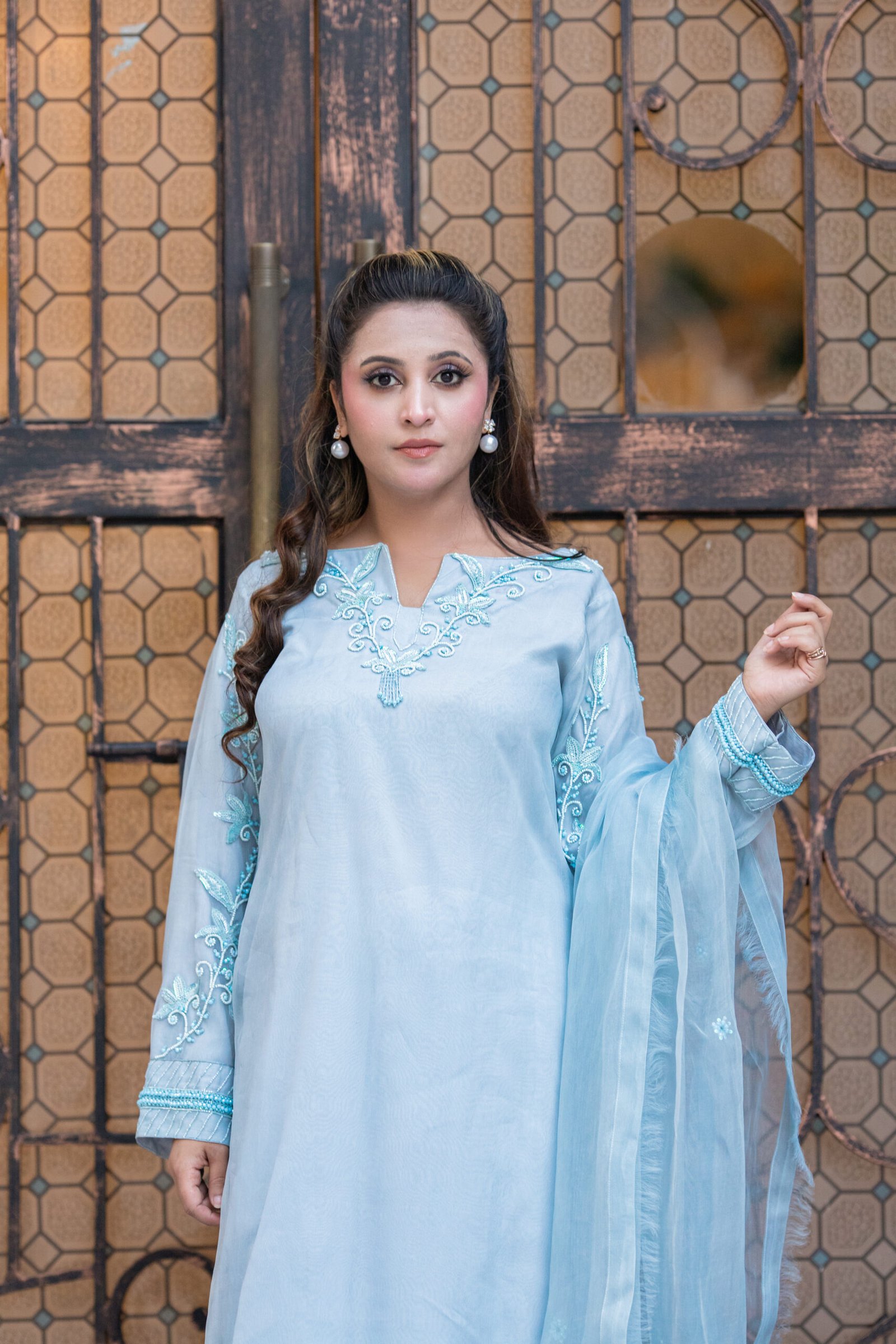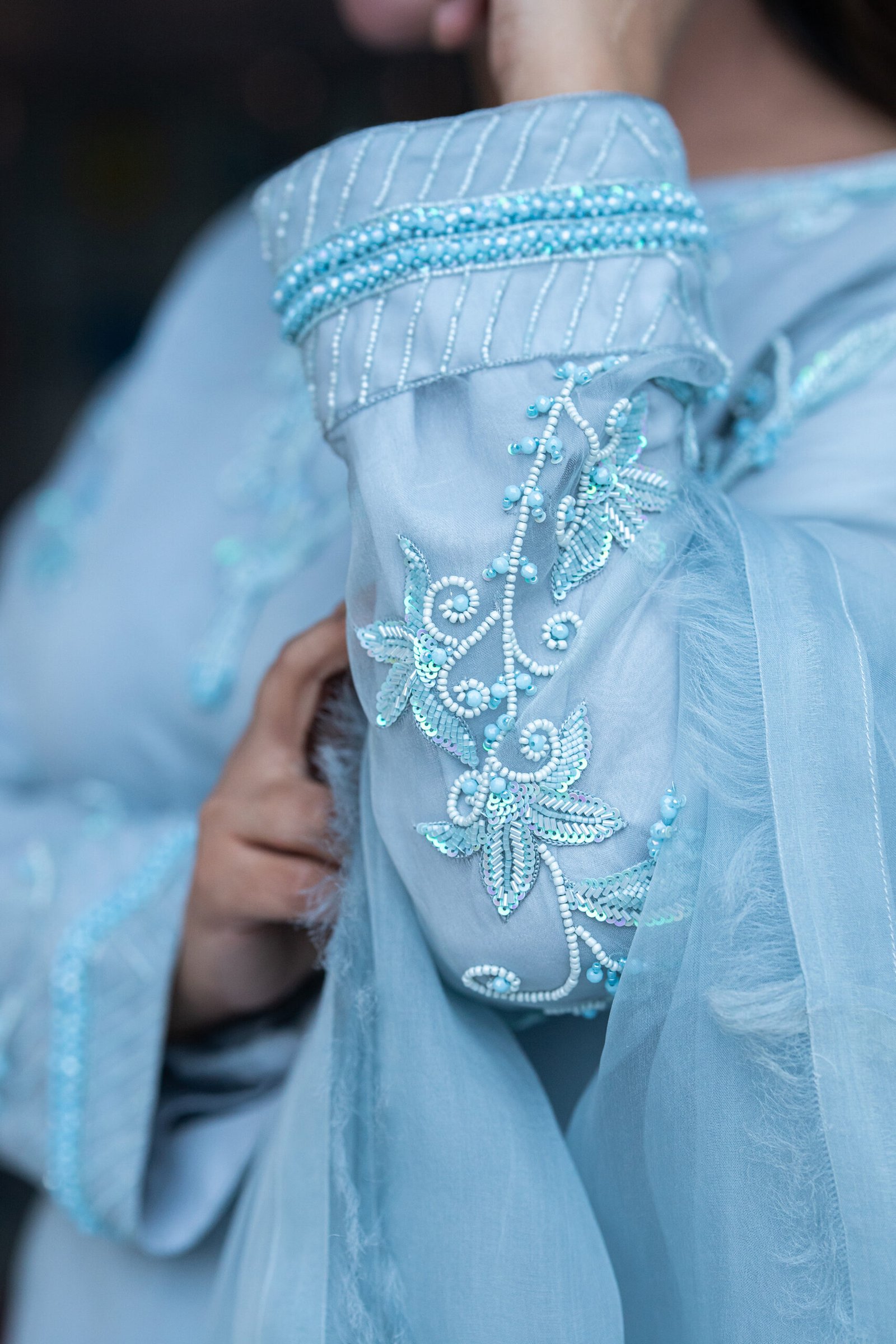 A three-piece ensemble in ice-blue, delicate hand embellishment. This piece embodies festive grandeur.