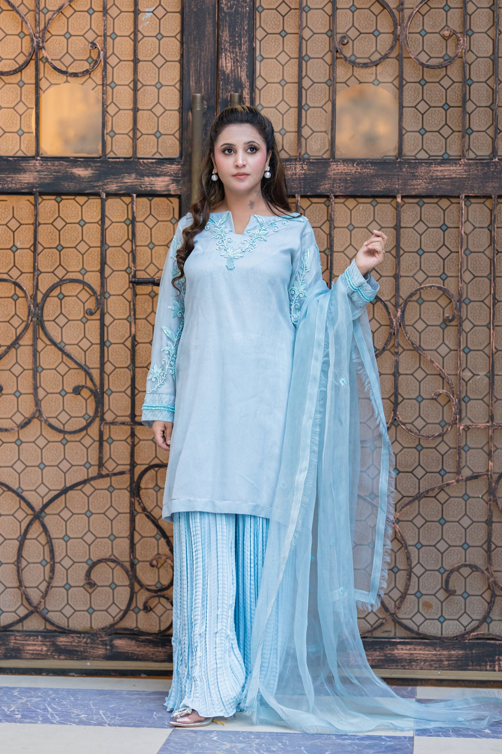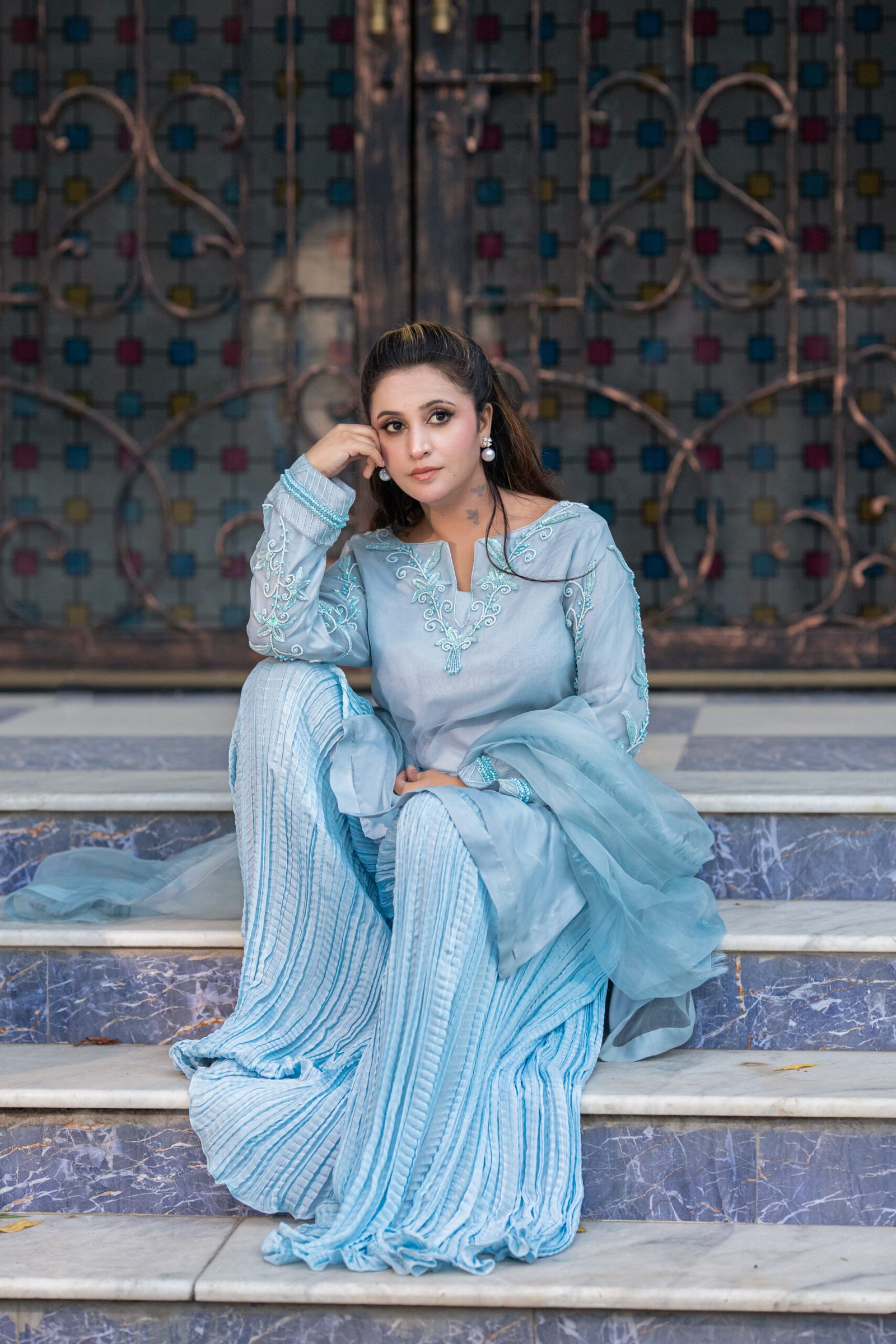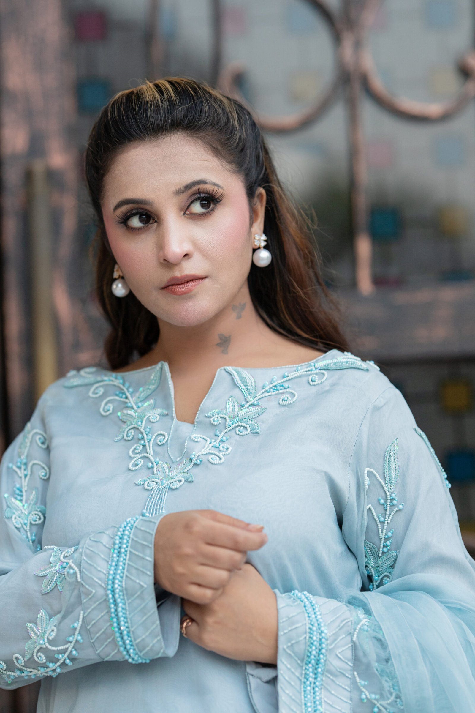A three-piece ensemble in ice-blue, delicate hand embellishment. This piece embodies festive grandeur.