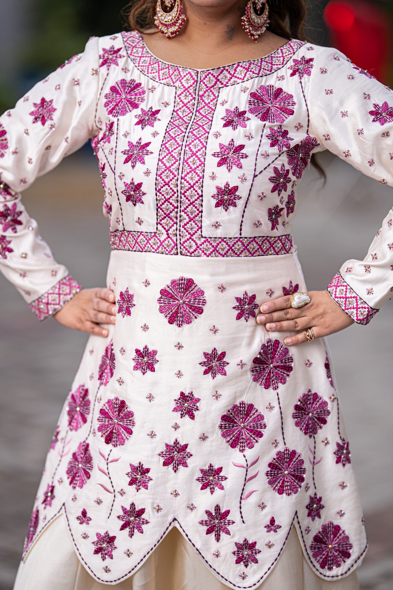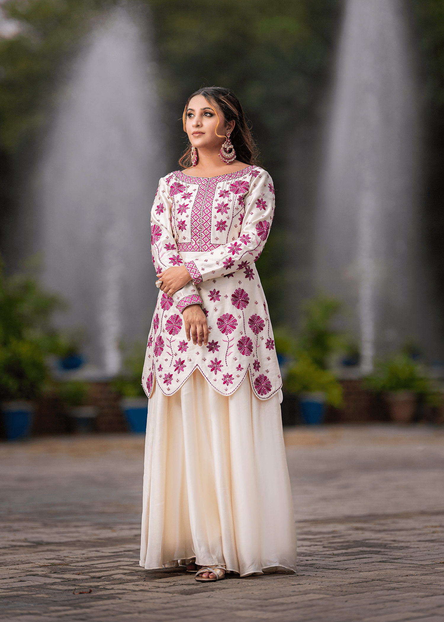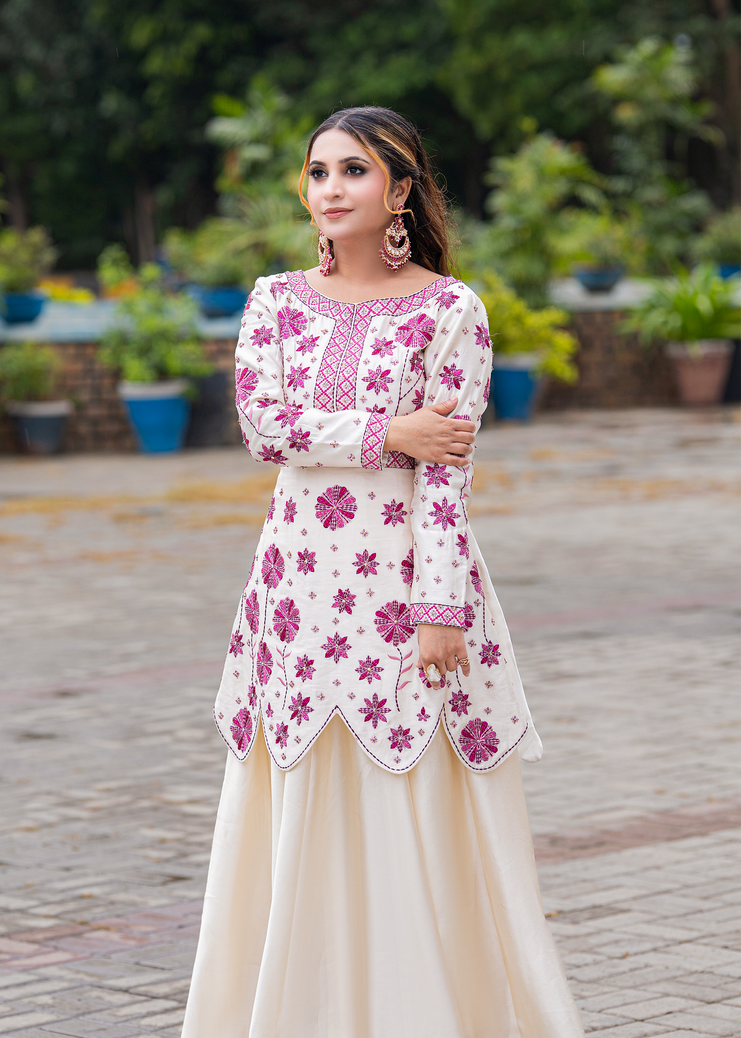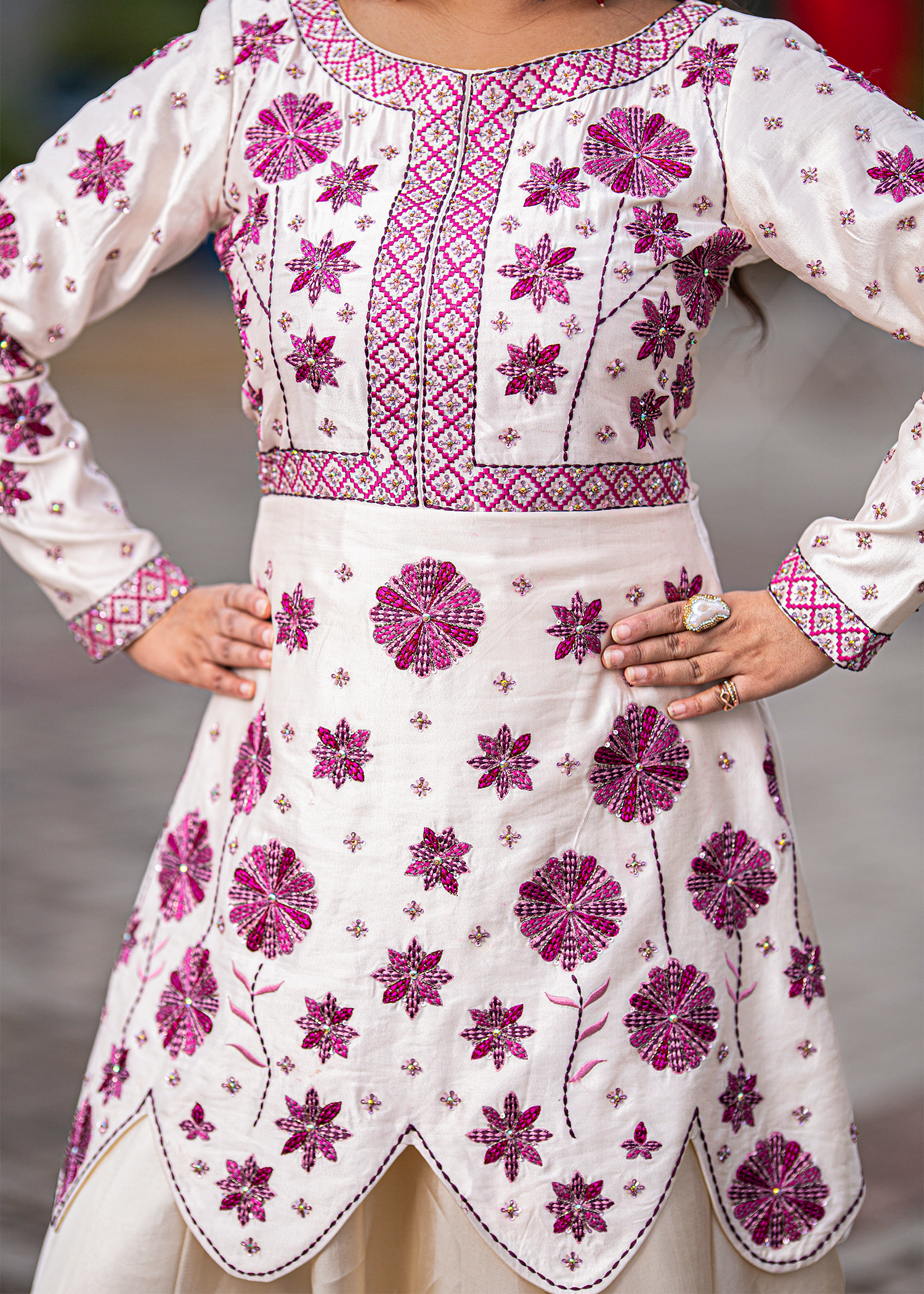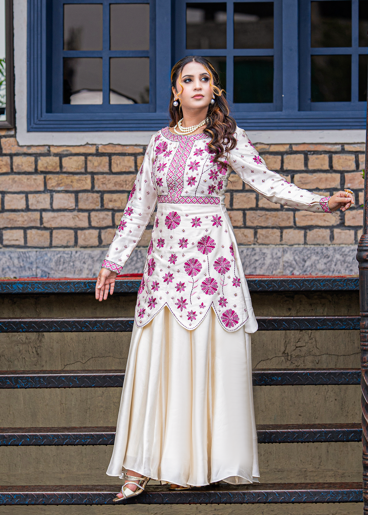 A regal one-piece ensemble in pure sheesha silk, featuring delicate machine embroidery elevated with meticulous hand embellishments. The layered scallop silhouette paired with floral accents in deep magenta creates a striking harmony of elegance and grandeur — perfect for refined festive soirées.
