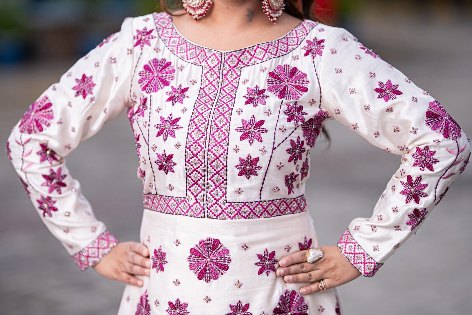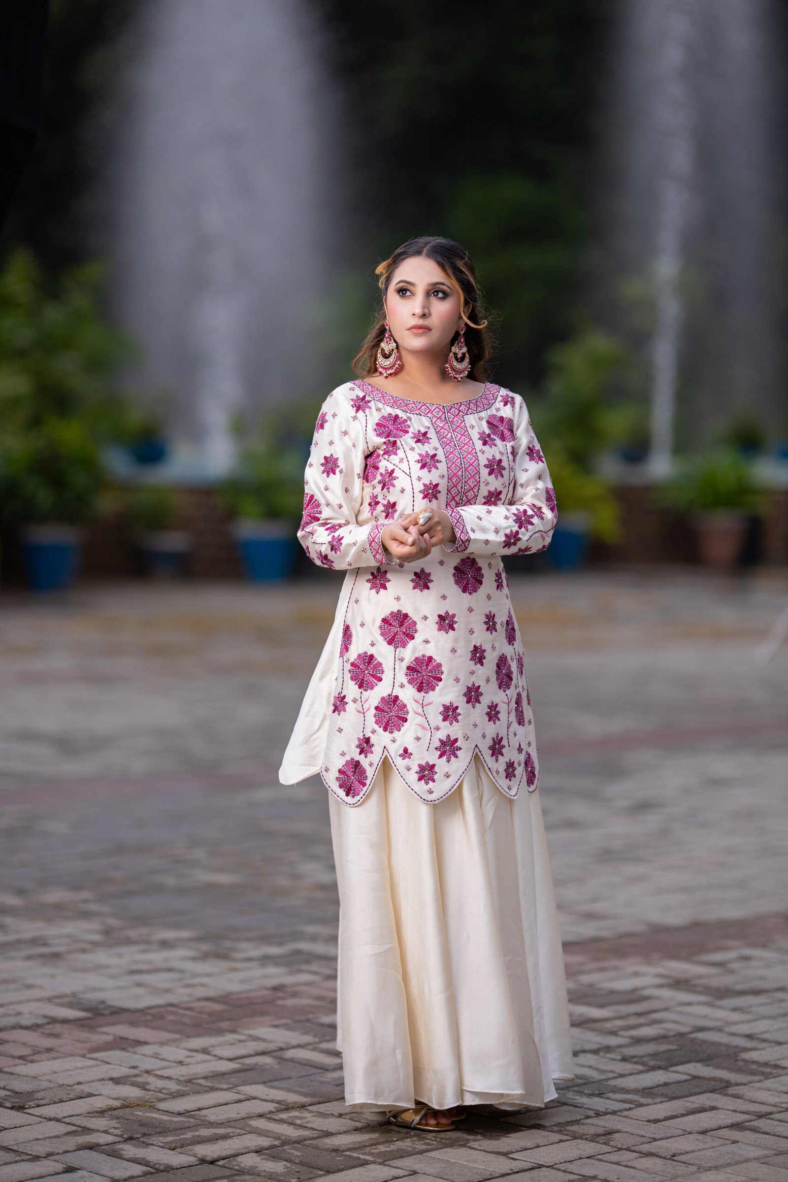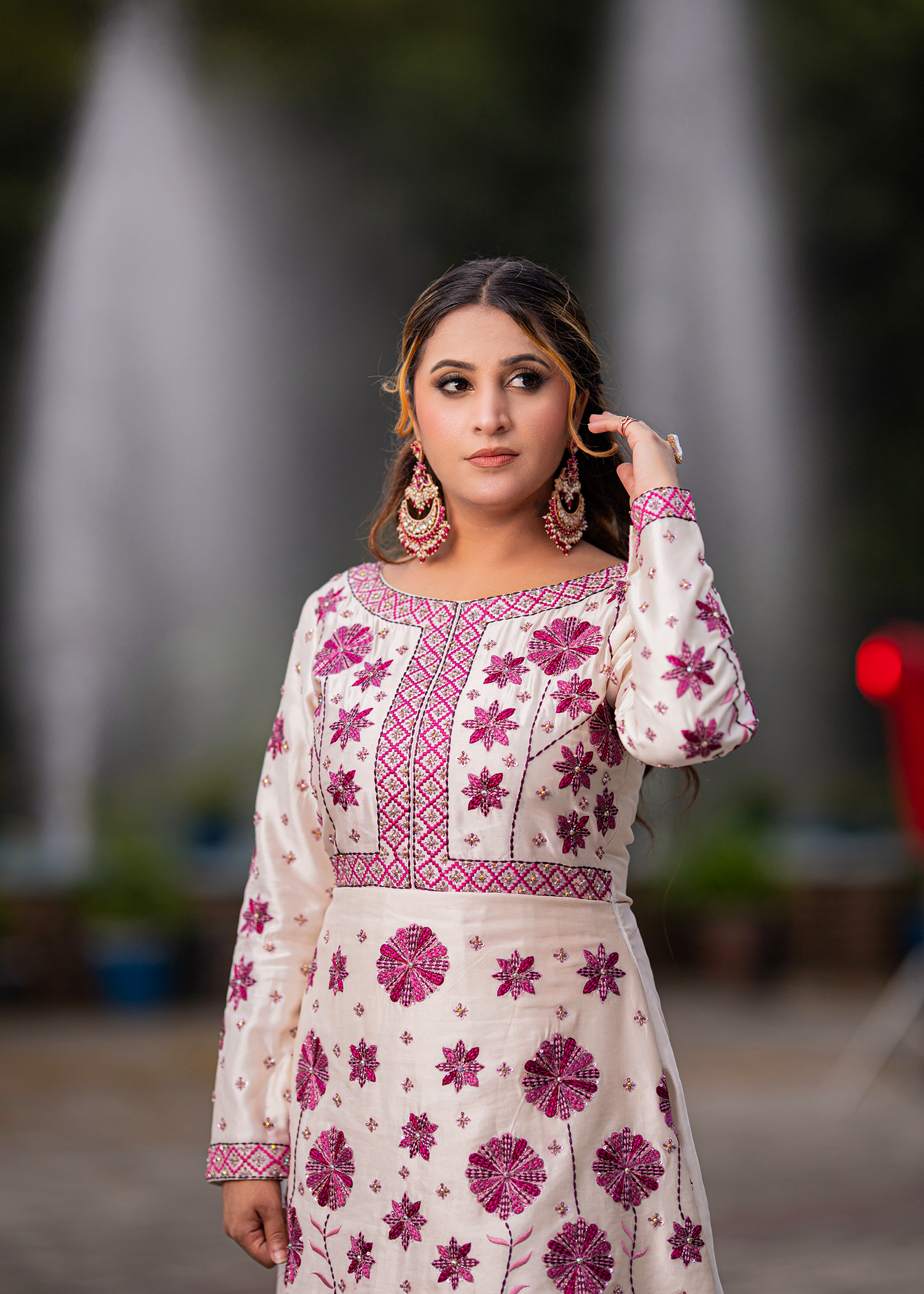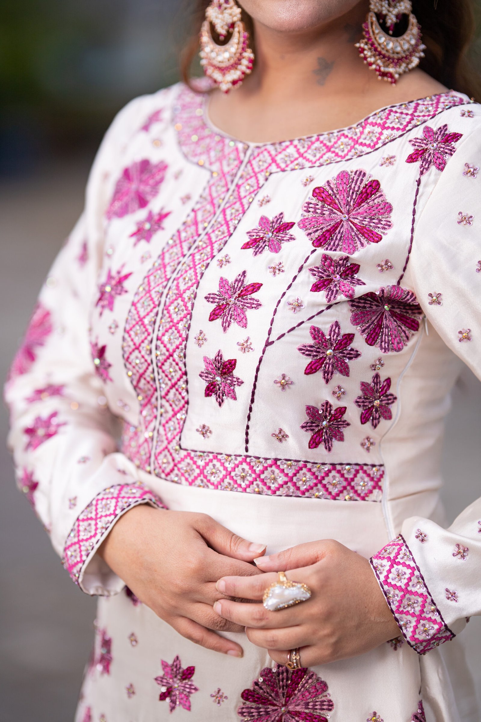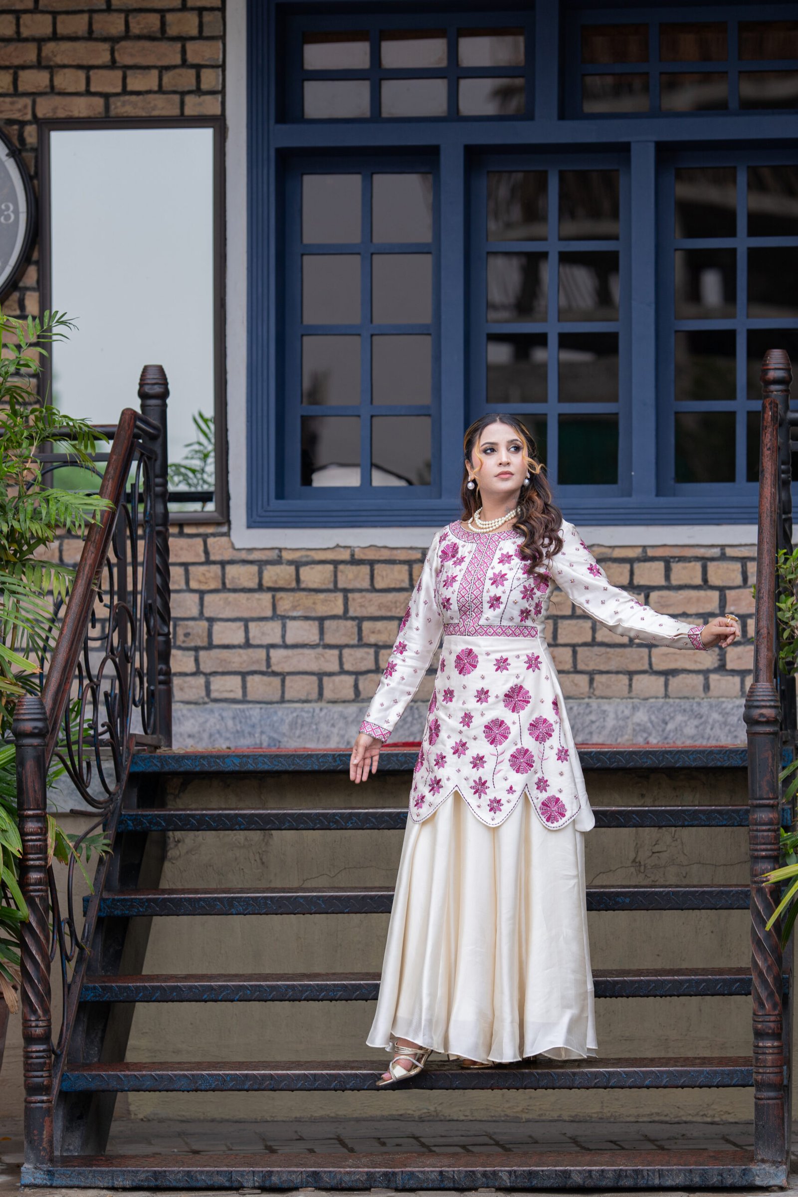 A regal one-piece ensemble in pure sheesha silk, featuring delicate machine embroidery elevated with meticulous hand embellishments. The layered scallop silhouette paired with floral accents in deep magenta creates a striking harmony of elegance and grandeur — perfect for refined festive soirées.