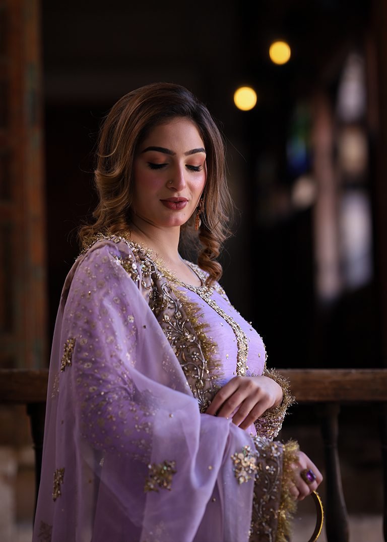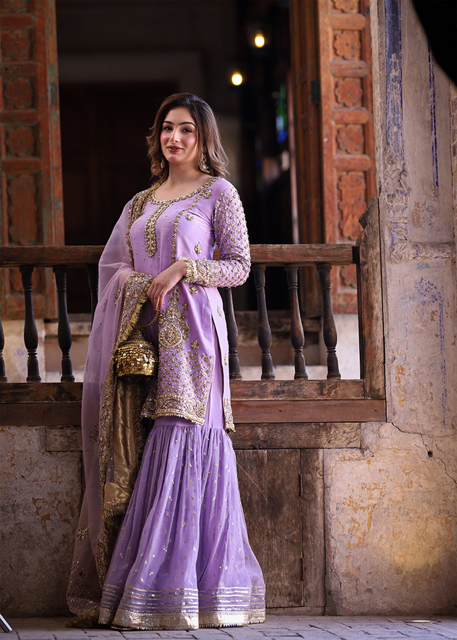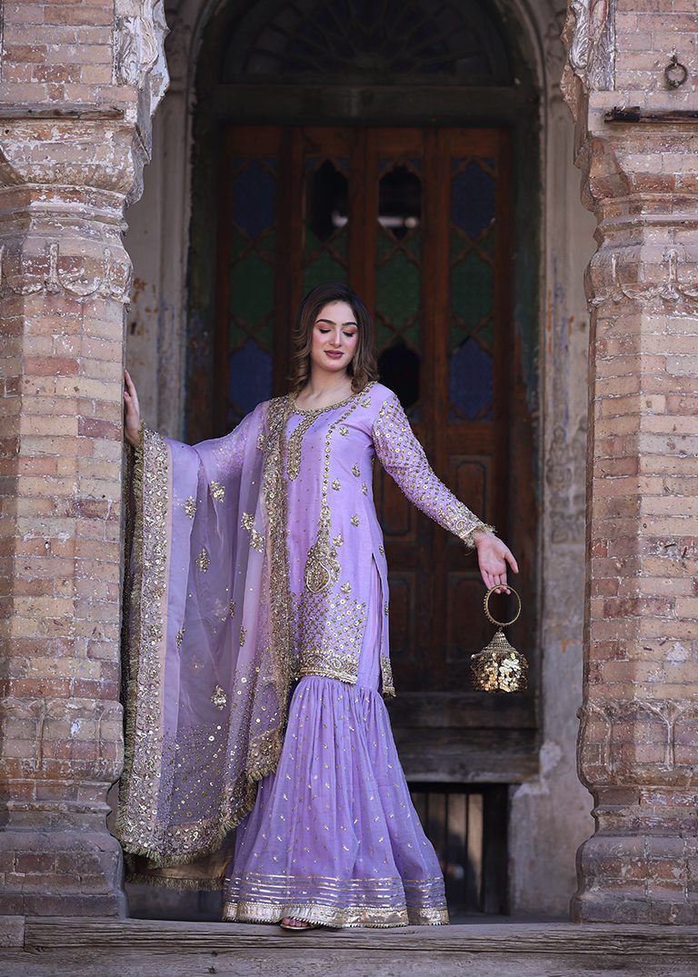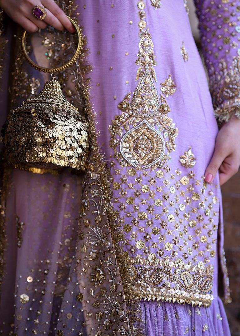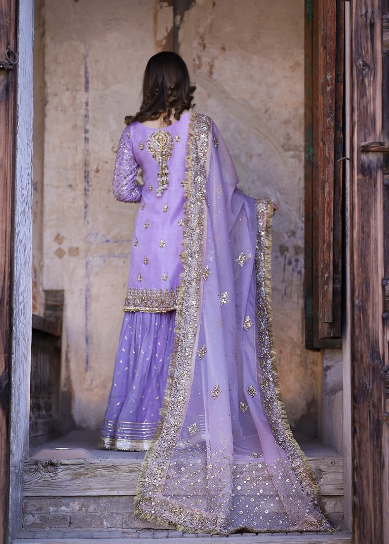 A purple three-piece ensemble featuring block print and hand embroidery with gota, dabka, sequins, and pearl detailing. Crafted in Korean silk, cotton net, and organza for a layered, festive finish.
