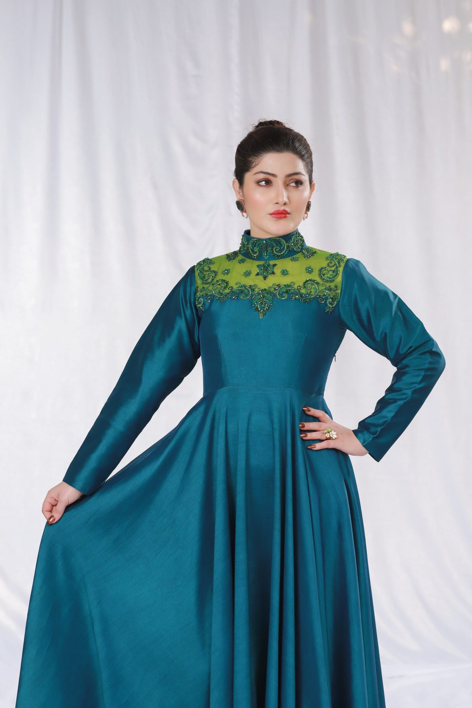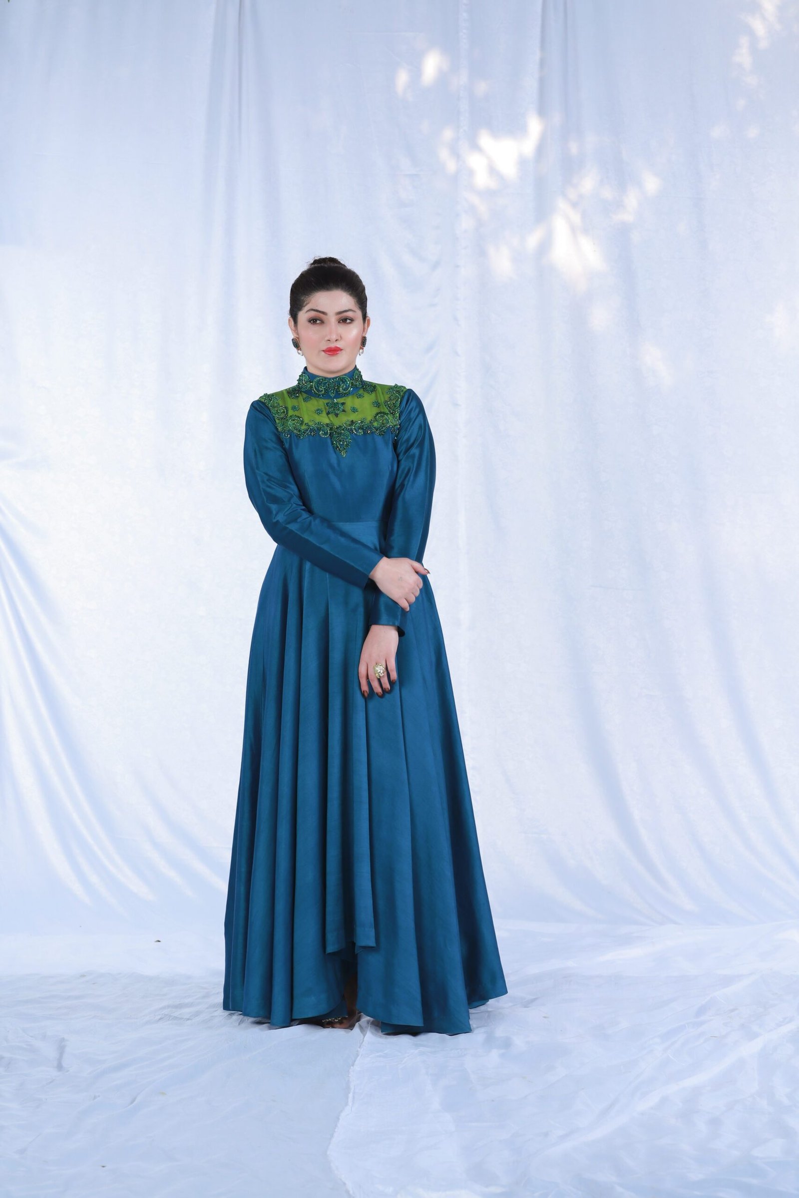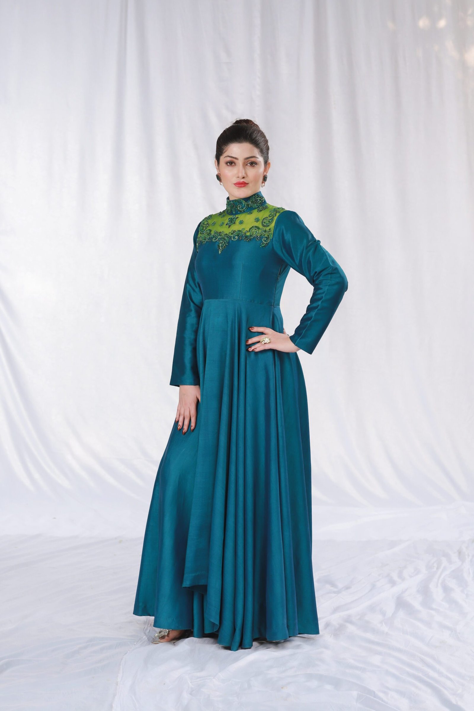 This one-piece gown in zinc and parrot green is crafted from sheesha silk with an organza yoke, giving it a structured yet fluid fall. The neckline and bodice are adorned with intricate embroidery featuring crystals, katdana, stones, and sequins, creating a refined, high-neck statement. The long, full flare enhances movement and gives the outfit a graceful presence.