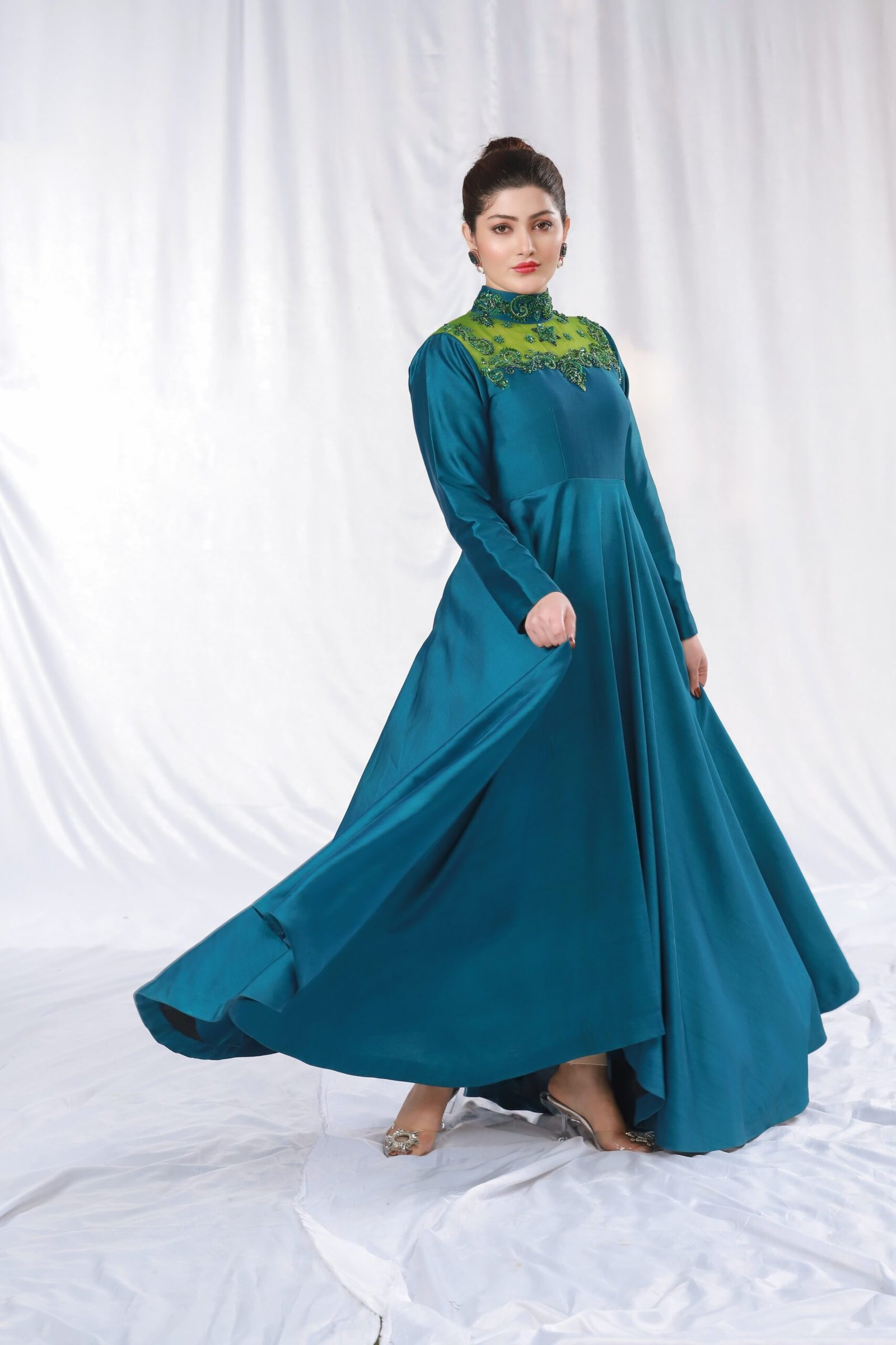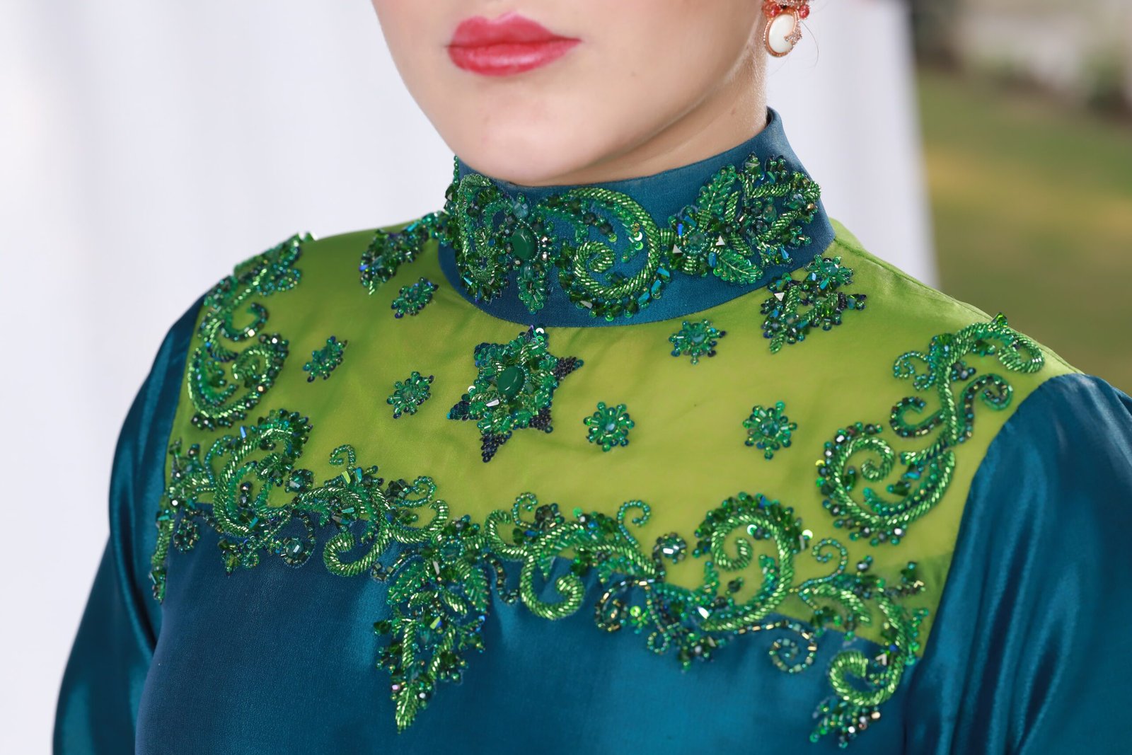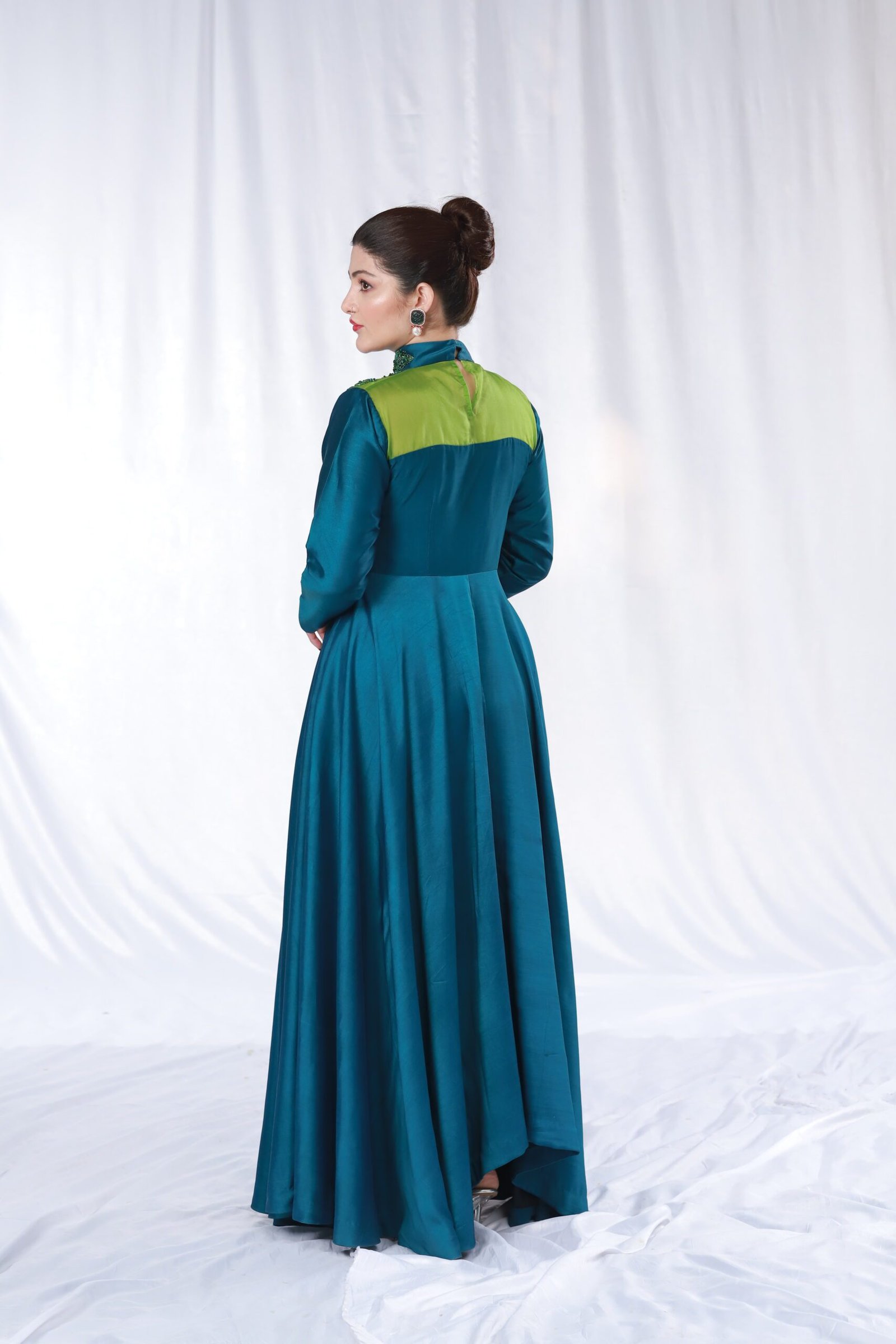 This one-piece gown in zinc and parrot green is crafted from sheesha silk with an organza yoke, giving it a structured yet fluid fall. The neckline and bodice are adorned with intricate embroidery featuring crystals, katdana, stones, and sequins, creating a refined, high-neck statement. The long, full flare enhances movement and gives the outfit a graceful presence.