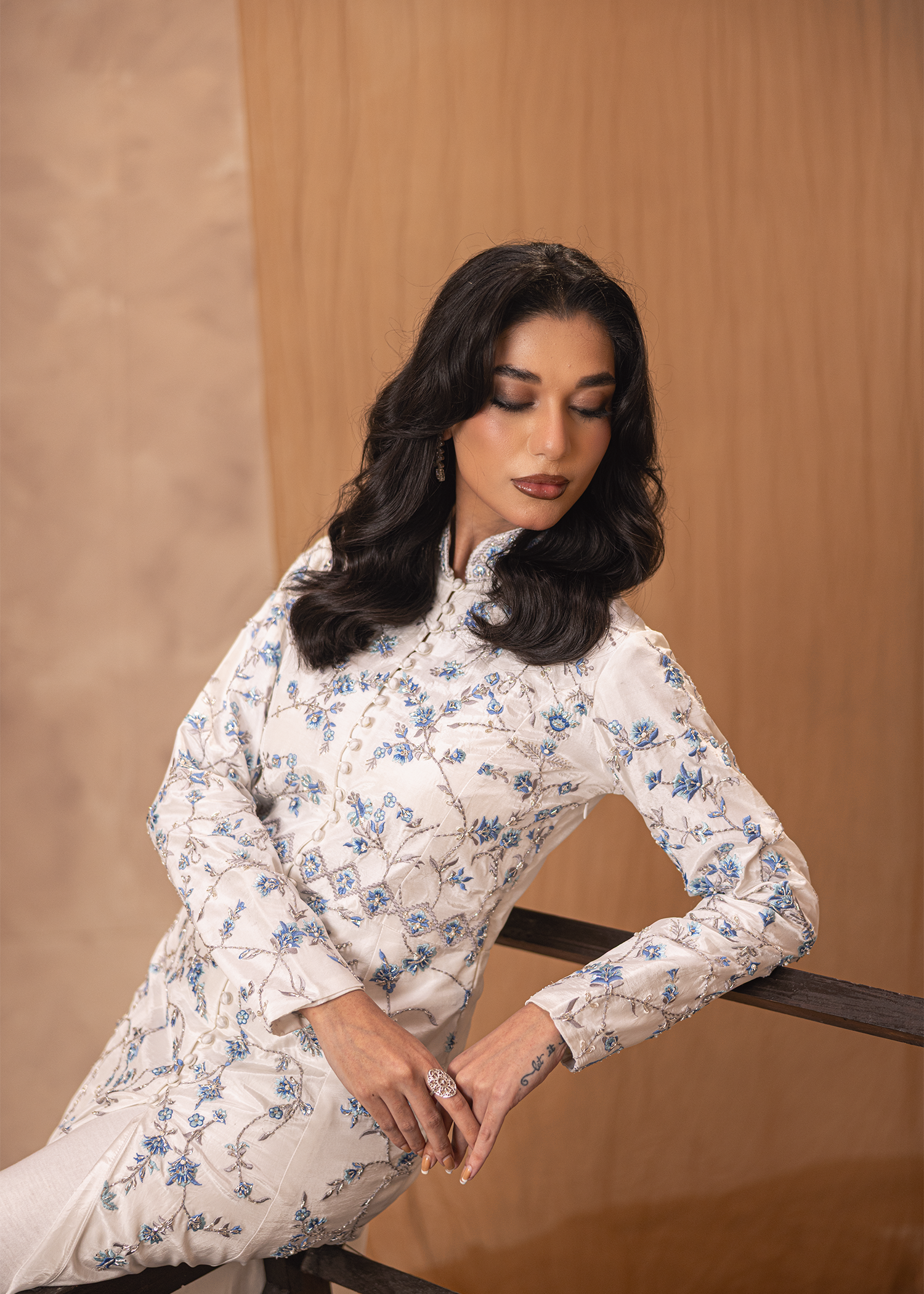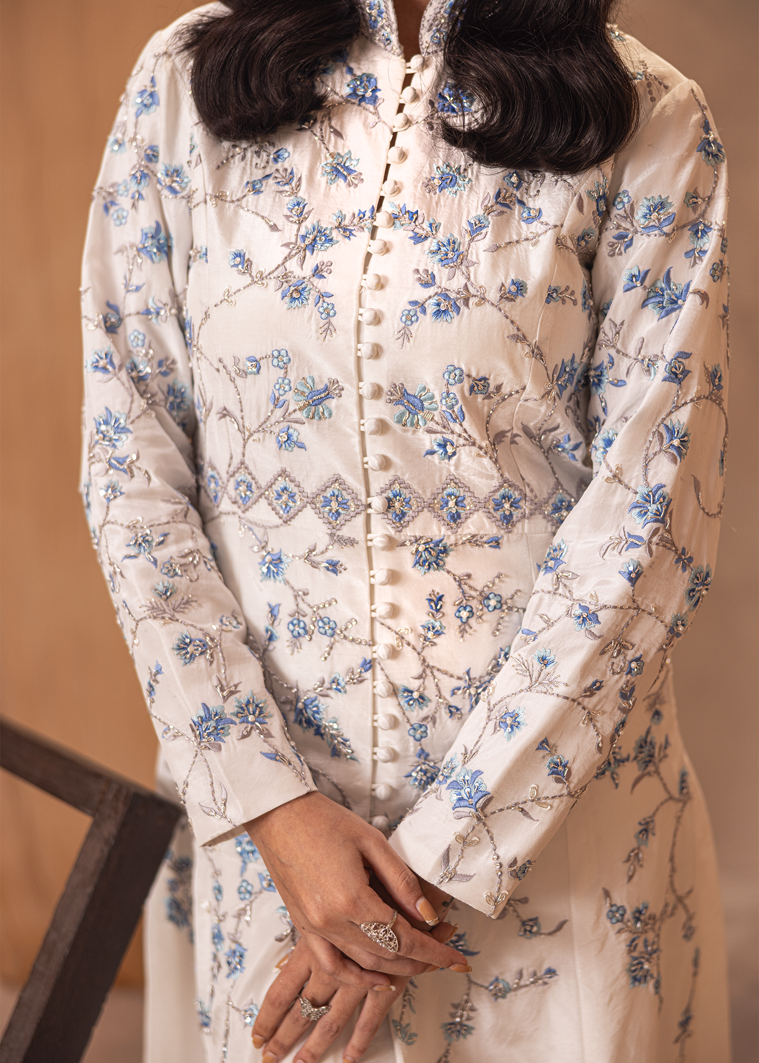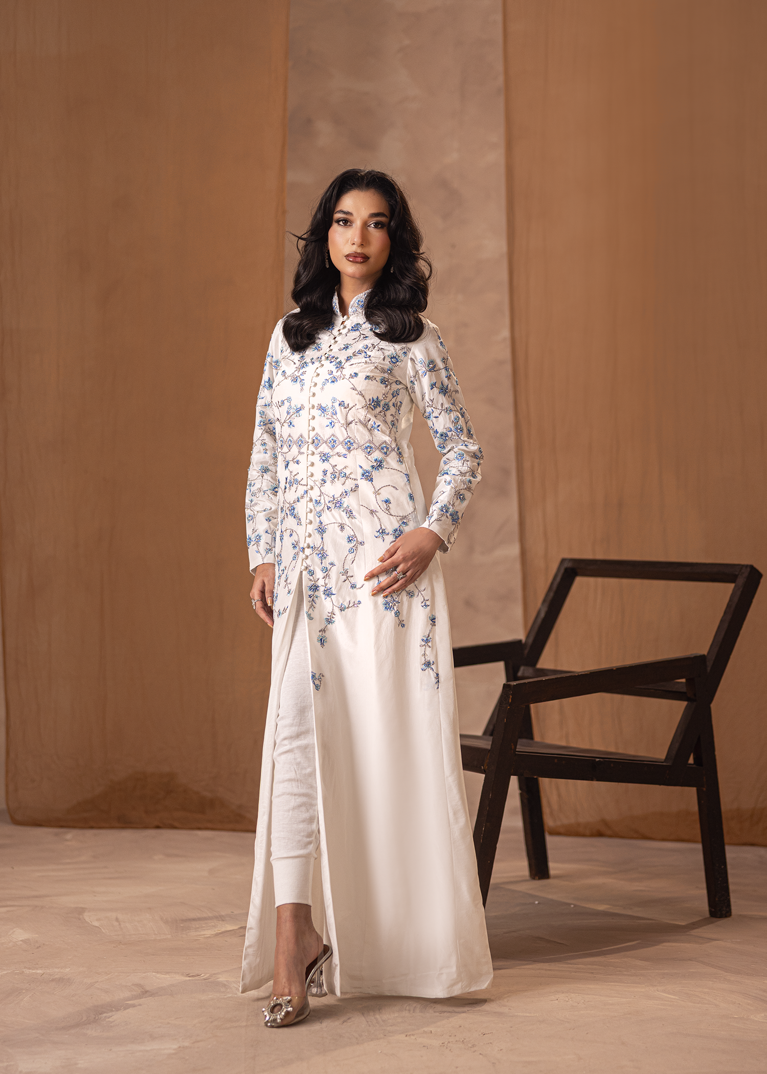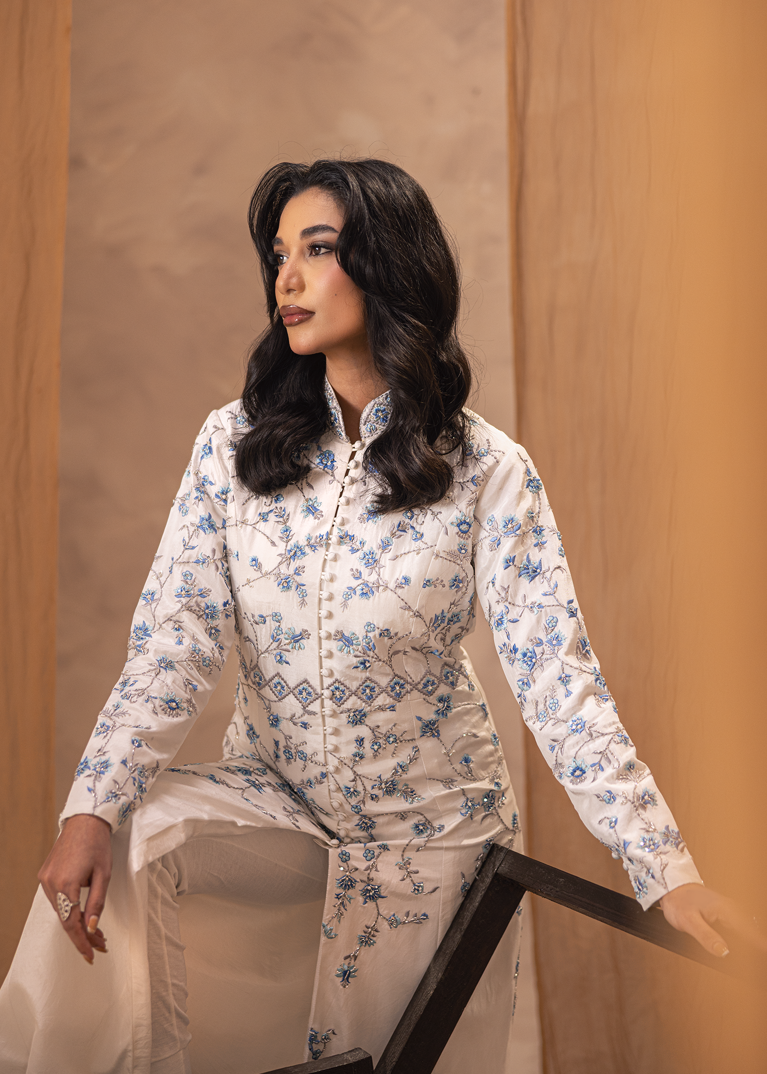 An exquisite one-piece silhouette in pristine white tassle silk, elevated with delicate machine embroidery and masterful hand embellishments. Adorned with dabka, katdana, Swarovski crystals, and sequins, this design radiates sophistication and opulence. A refined statement attire crafted for timeless elegance and grandeur.