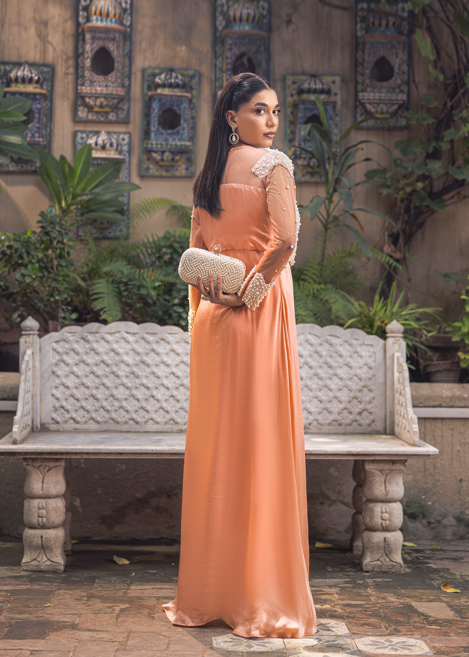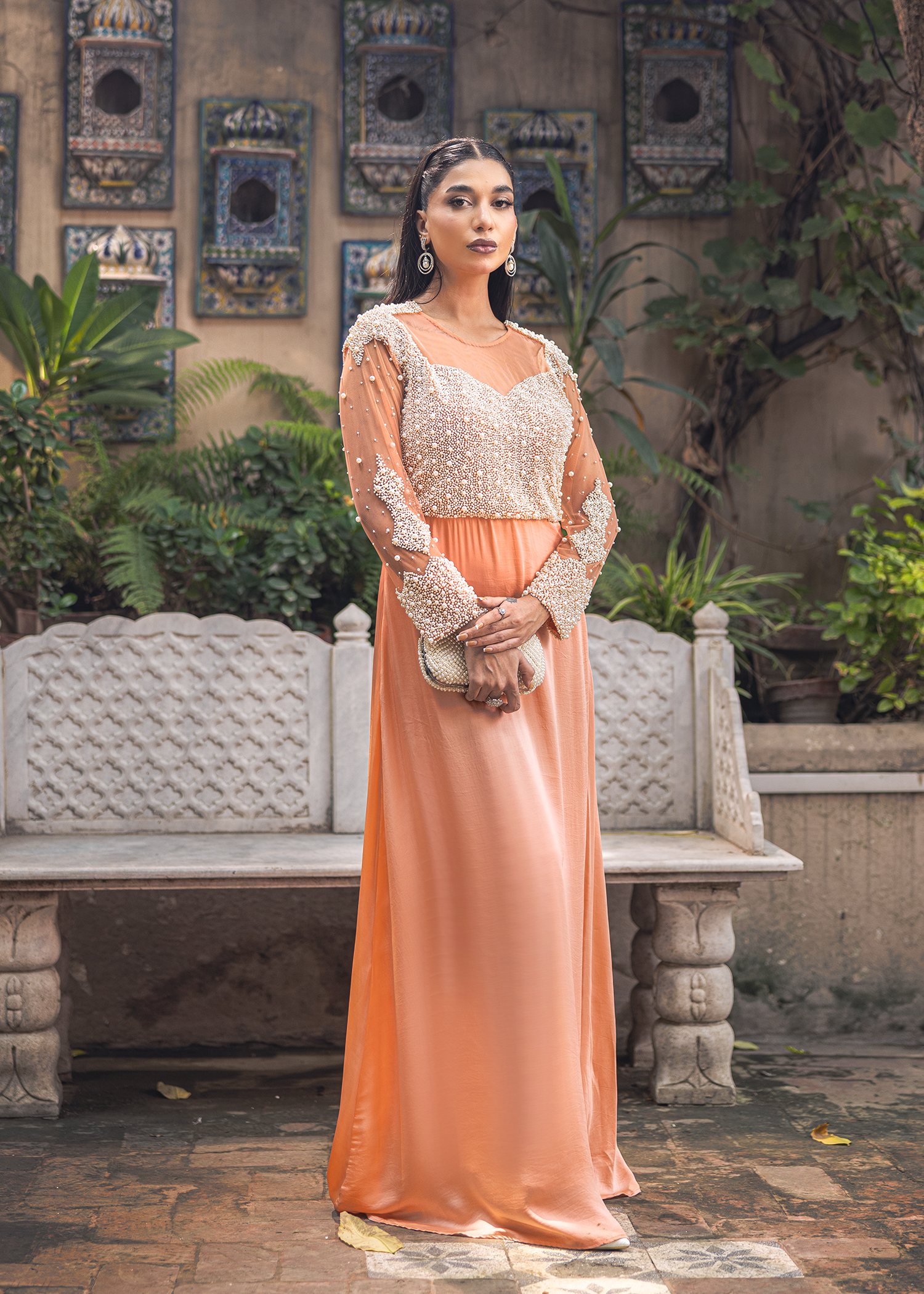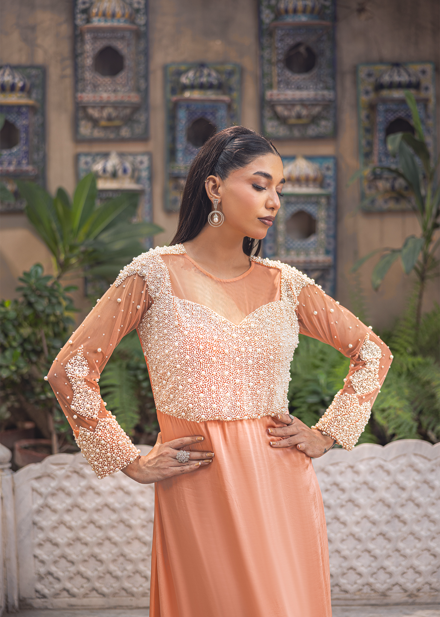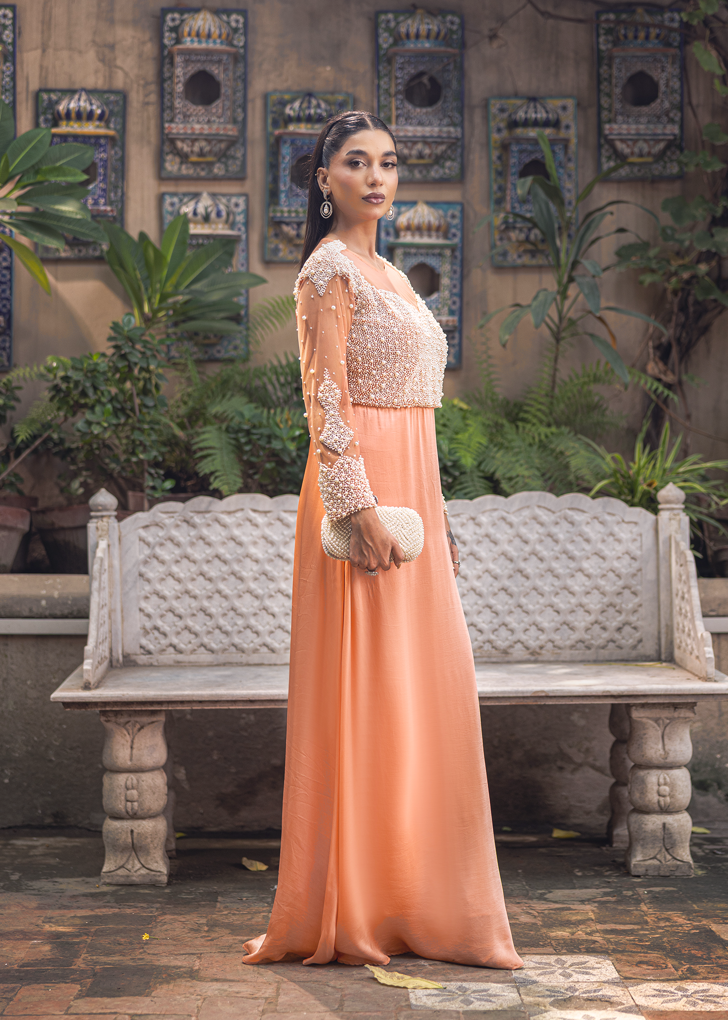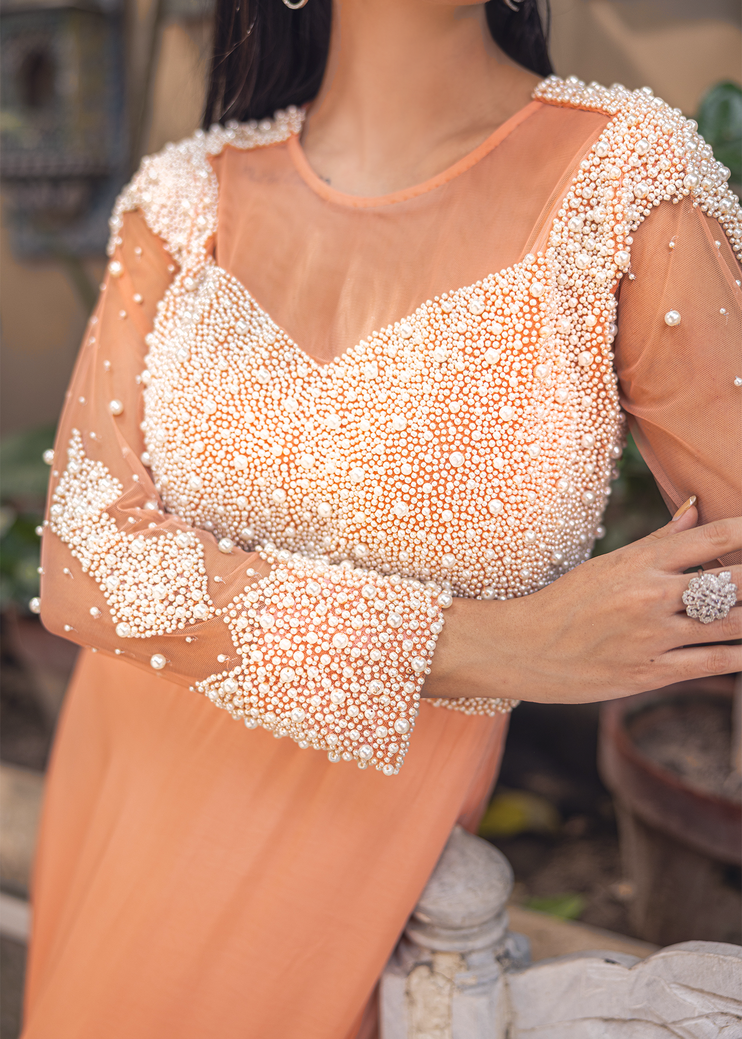 A one-piece gown in soft peach silk, paired with a sheer net bodice and sleeves. Hand-embellished with delicate pearls, the design embodies understated luxury with graceful charm.