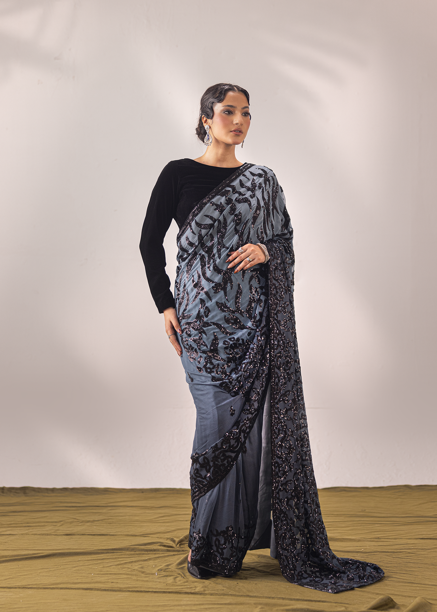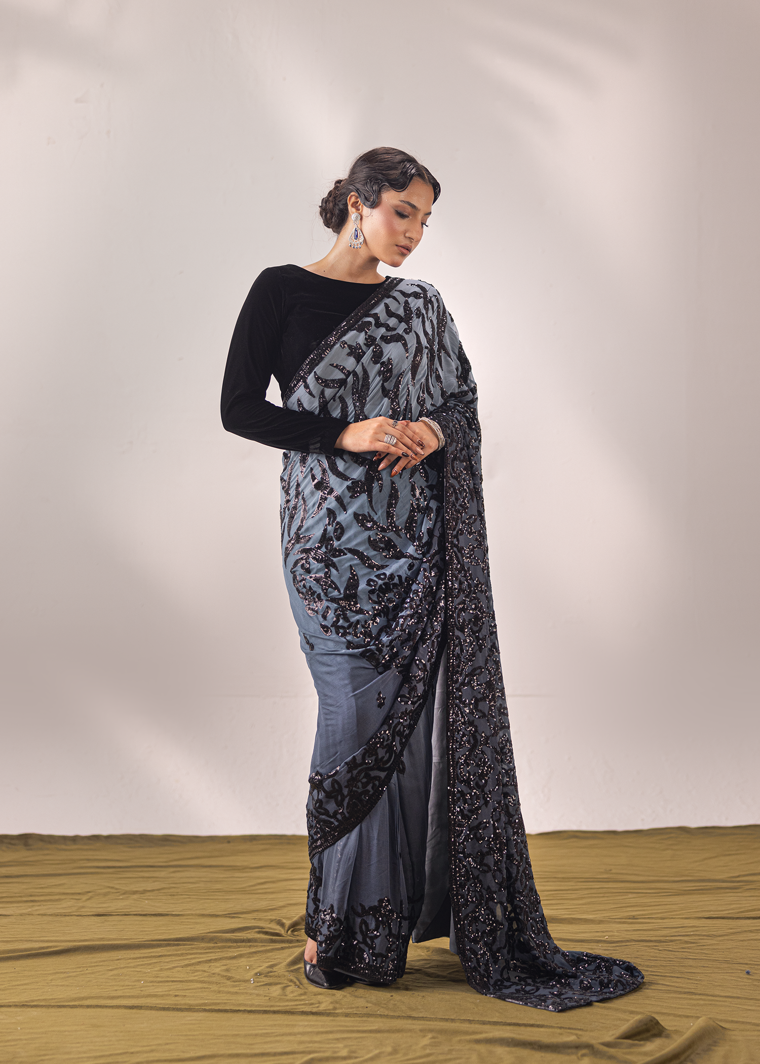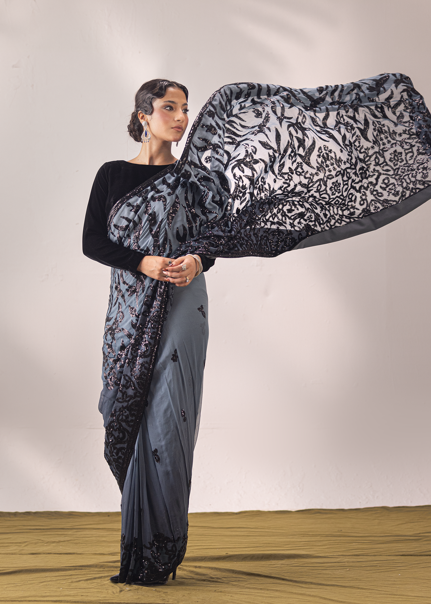 A sari in black and grey, crafted from velvet and chiffon. The fluid drape contrasts with a structured blouse, creating a statement of festive elegance with modern refinement.