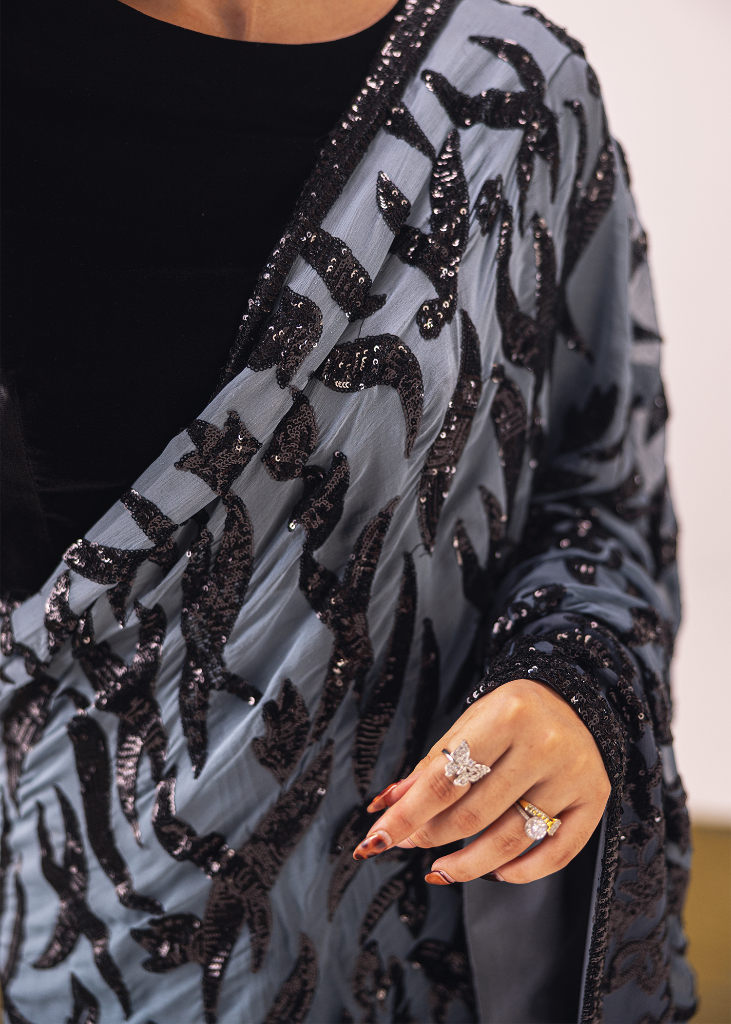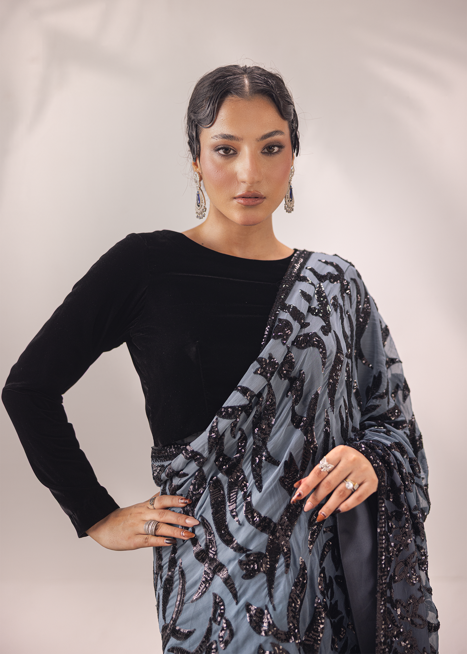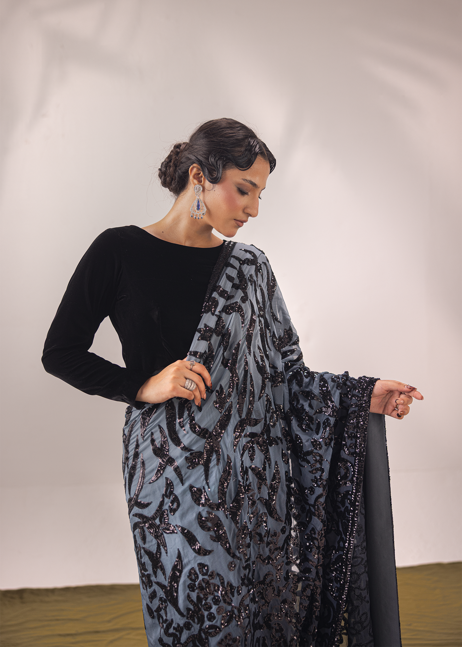 A sari in black and grey, crafted from velvet and chiffon. The fluid drape contrasts with a structured blouse, creating a statement of festive elegance with modern refinement.