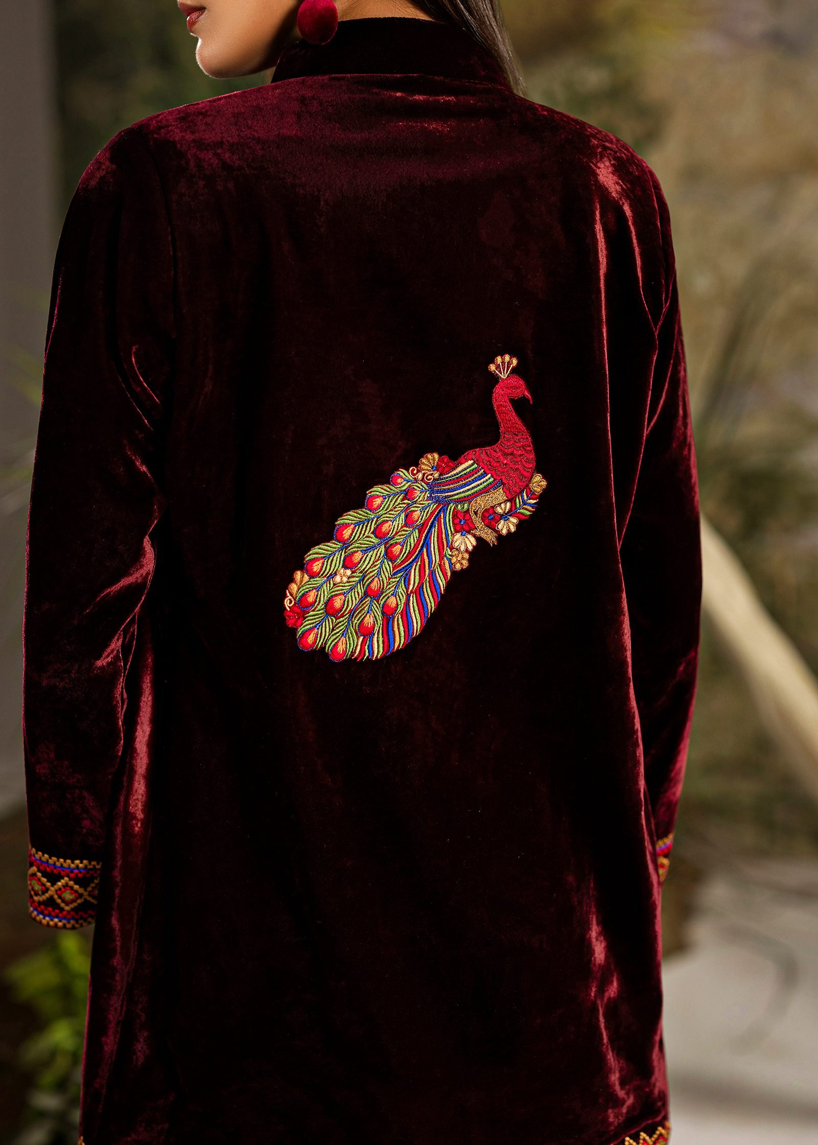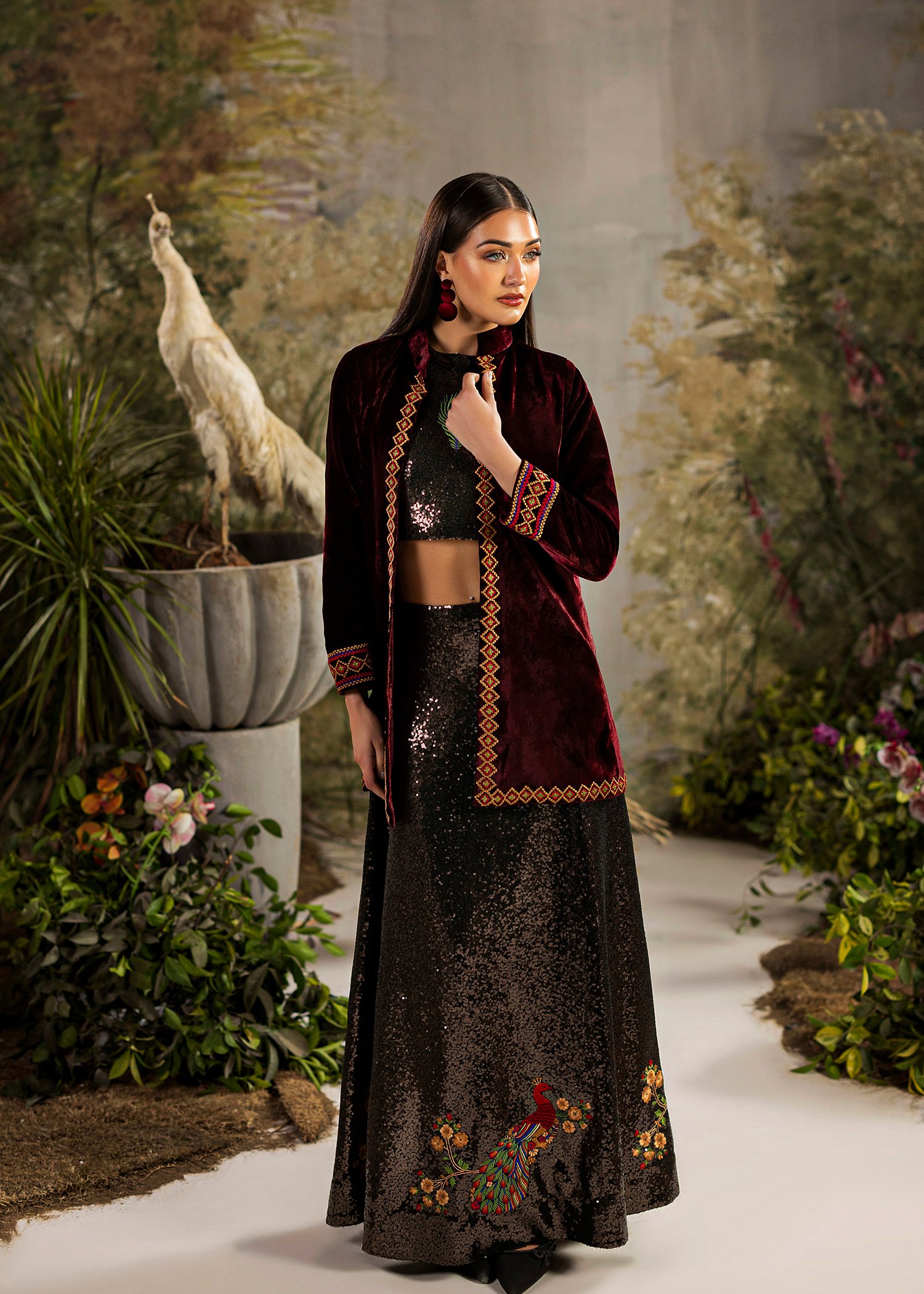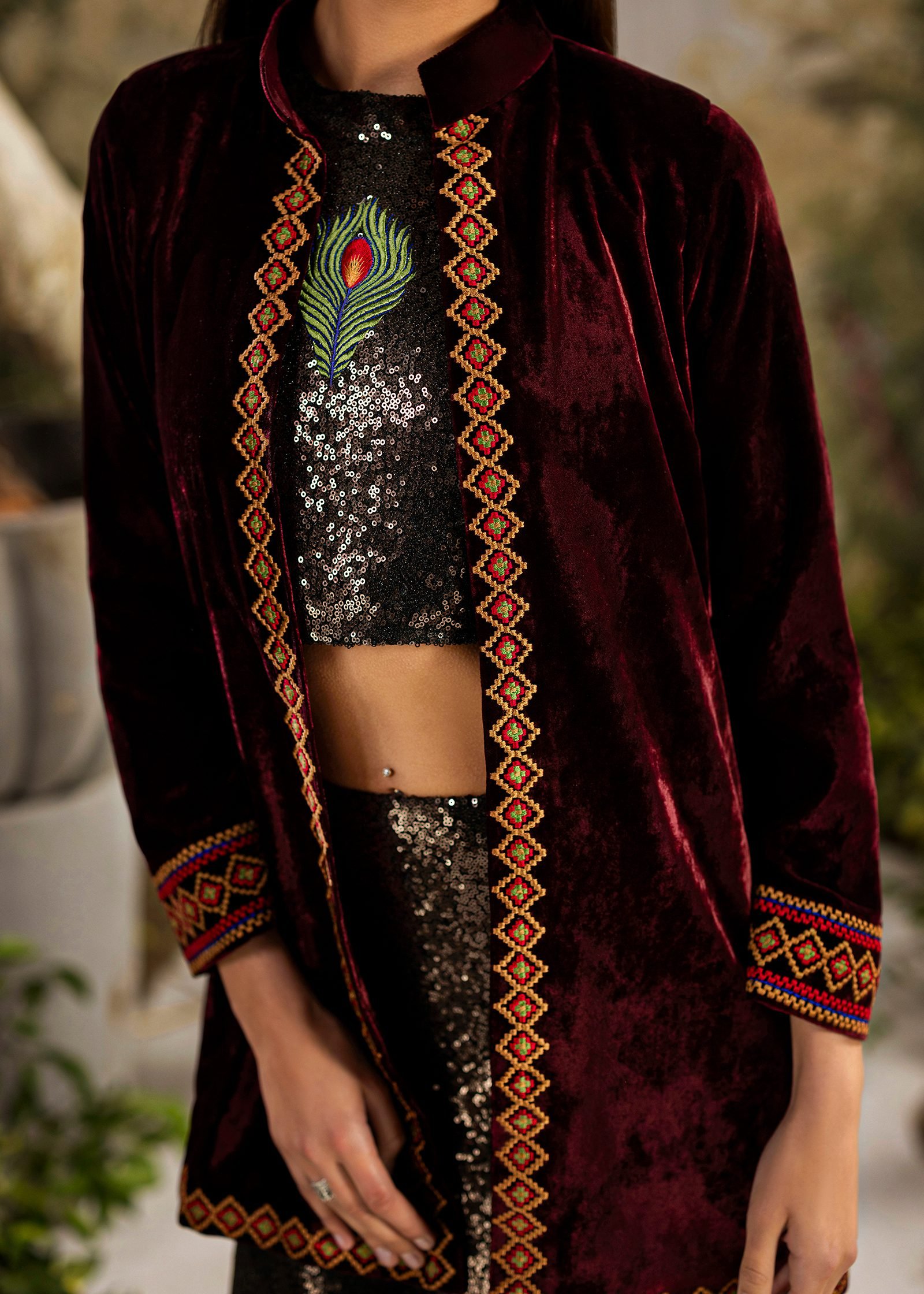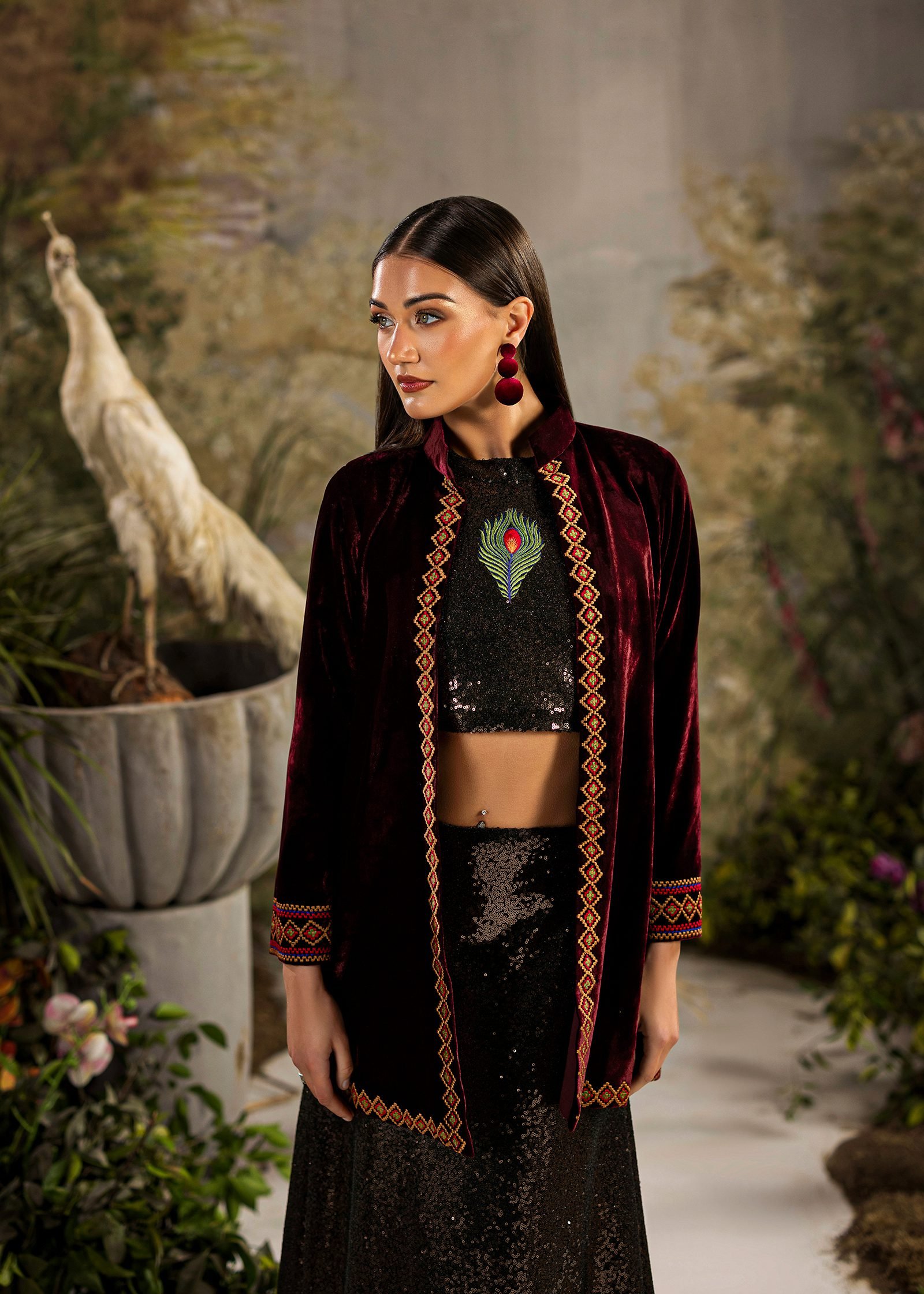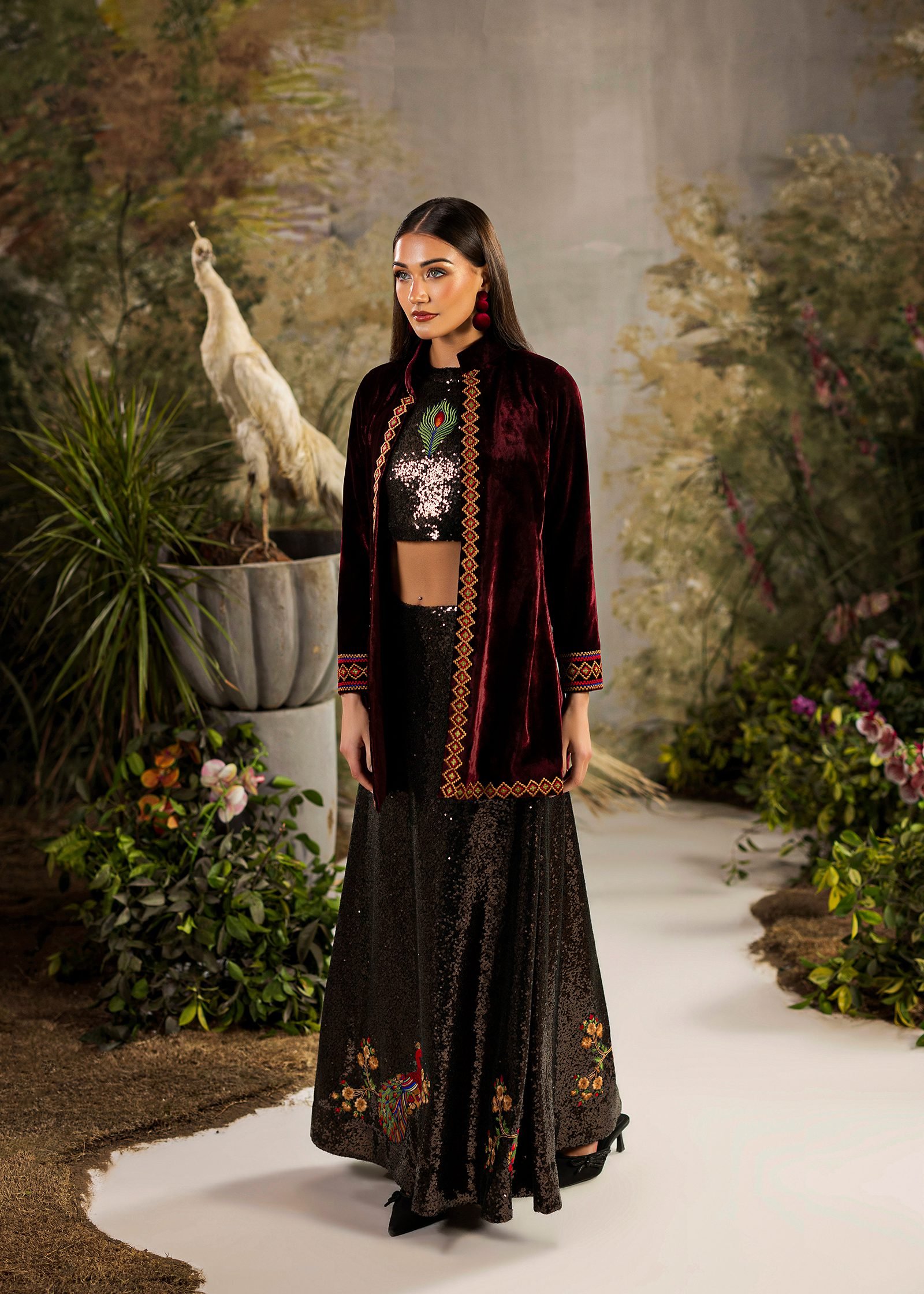 A bold black and maroon ensemble crafted in pure velvet and sequins. Clean machine embroidery adds structure and contrast to the rich textures. A refined statement that blends depth, elegance, and contemporary edge.